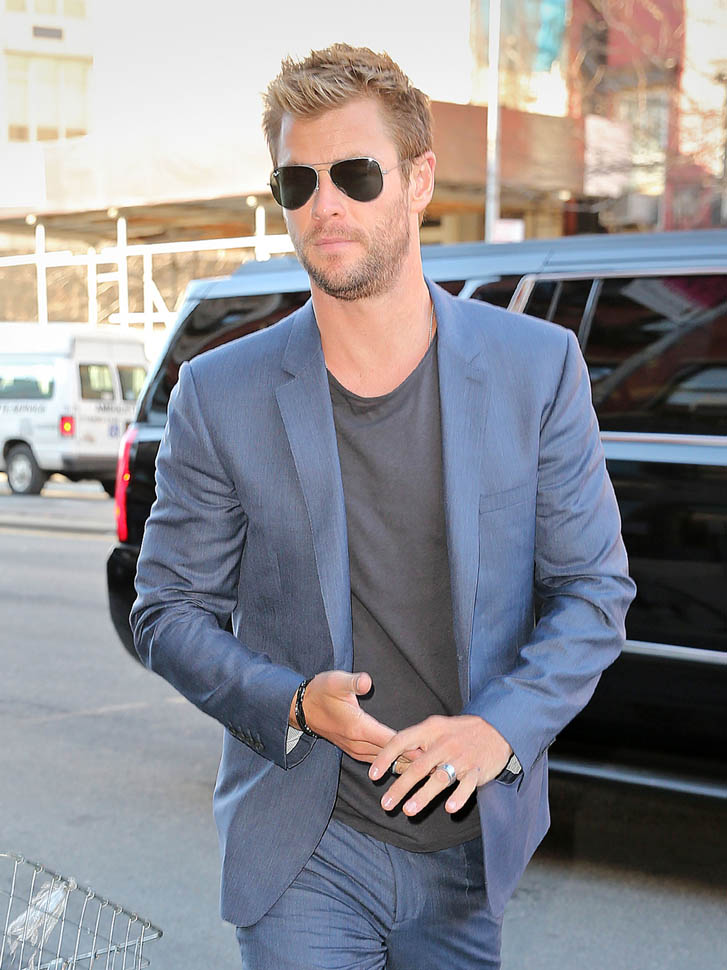 Chris Hemsworth was in New York this morning on promotional duty for the upcoming Blackhat, opening this weekend. It’s about cybercrime. That’s a selling feature, considering what’s happened in Hollywood recently. Another selling feature: he’s the current Sexiest Man Alive. I suppose that’s why he was amenable to being offered the title. It’ll be every other month for Hemsworth for the first part of the year. In March he’ll be in theatres again in In The Heart Of The Sea. Then in May it’s Avengers: Age Of Ultron – Sarah posted a new trailer for it earlier, click here to see it.