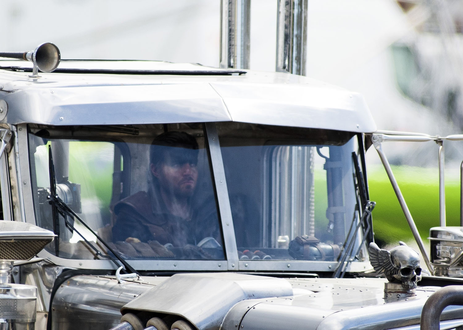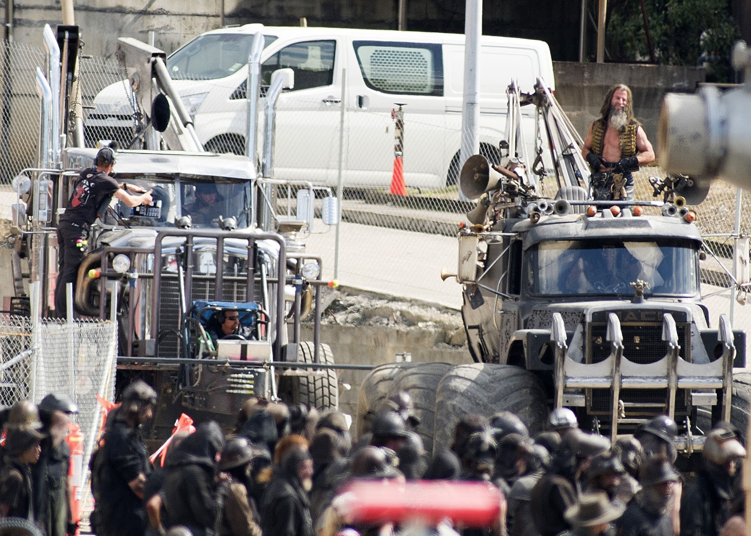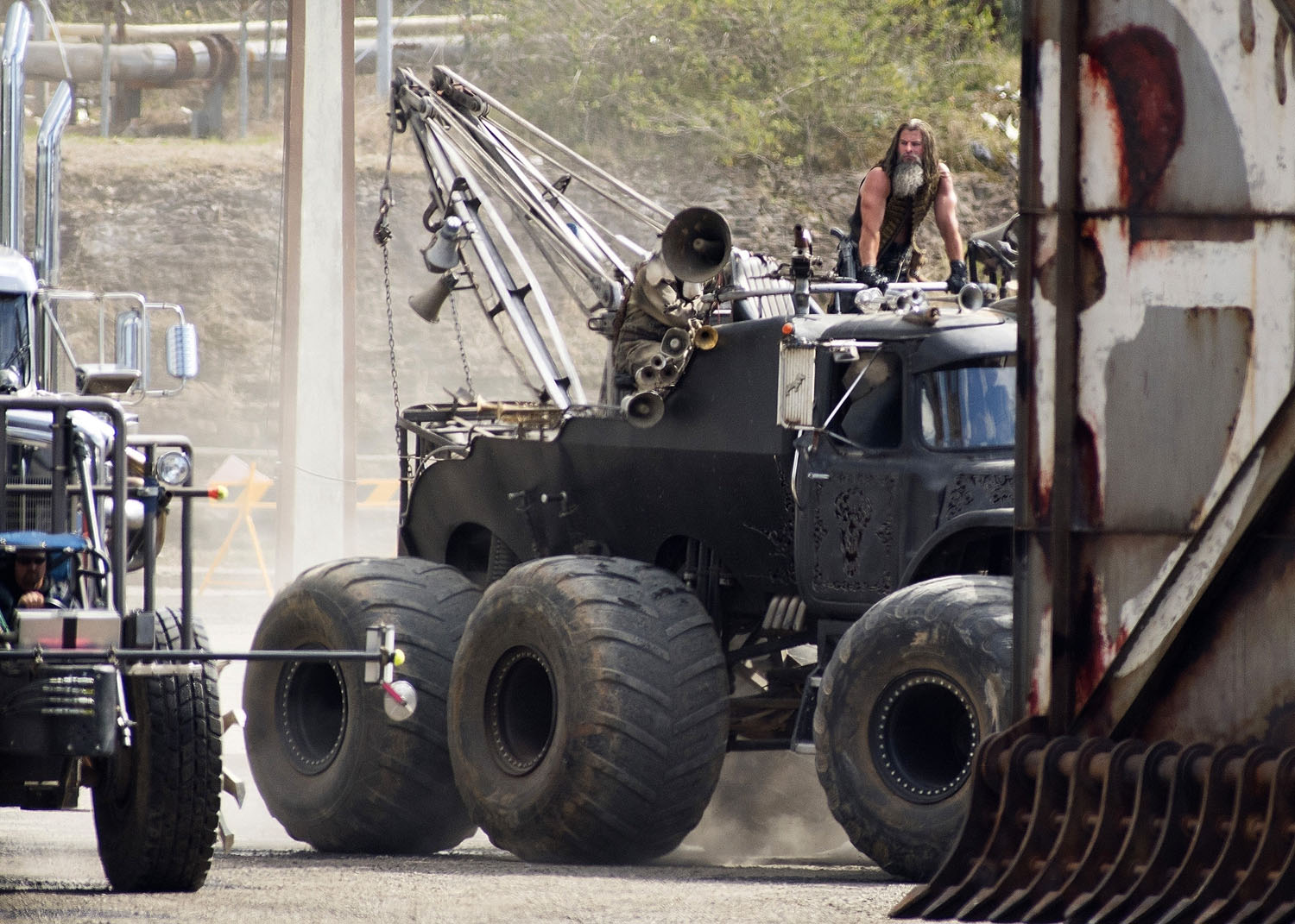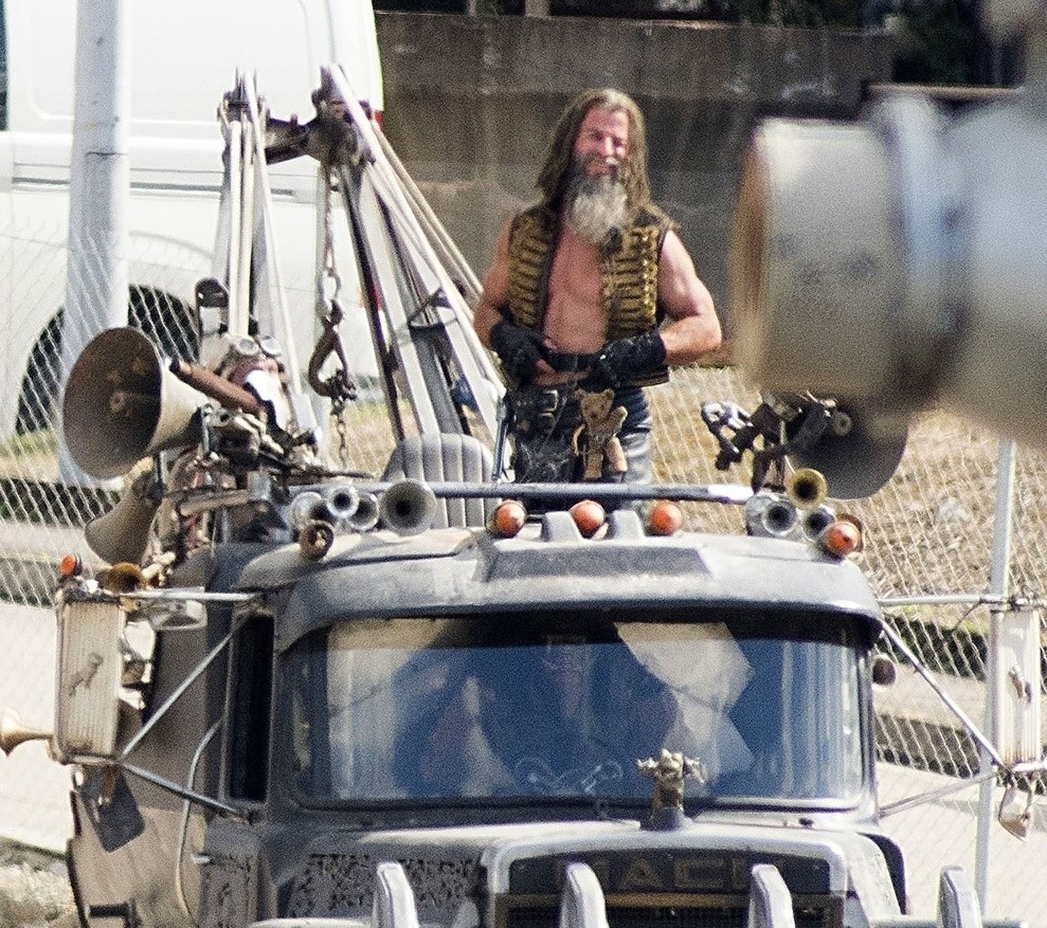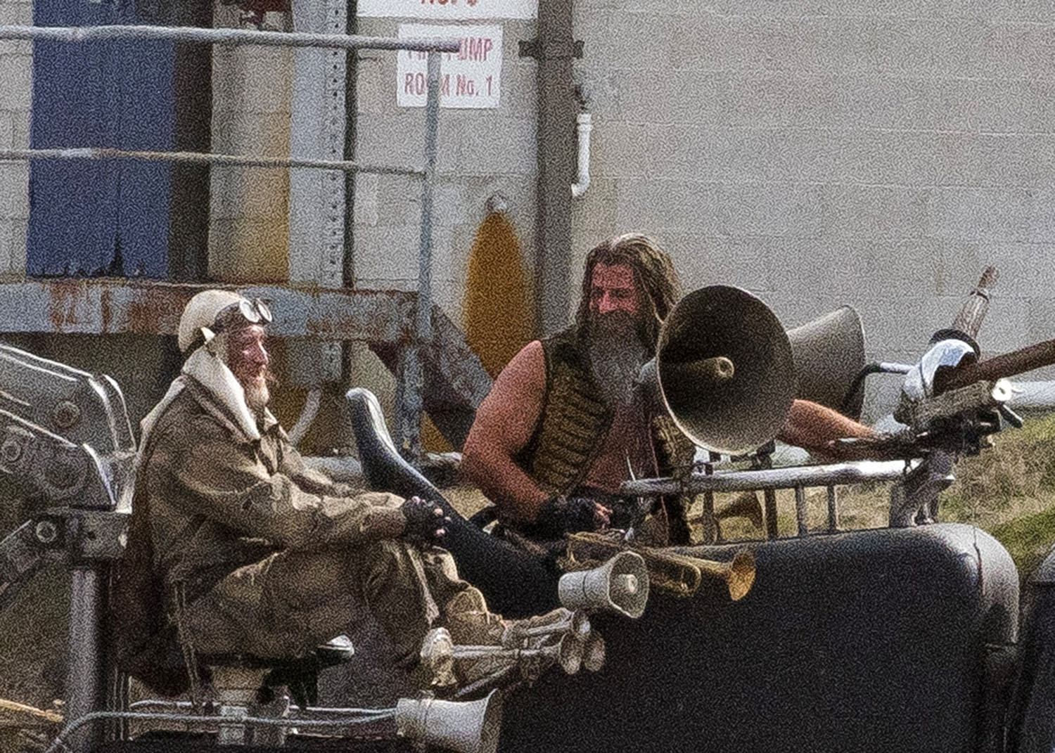 Equally unrecognizable: English actor Tom Burke, who played Orson Welles in Mank. He’s driving one of the war rigs. Well, the stunt driver is actually driving it, that’s him in that “pray to all the known gods nothing goes wrong” rig on the front of the truck. Tom Burke is in the cab of the truck not-driving. Could that be the young Immortan Joe? Could some accident resulting from his clash with Dementus result in Joe needing that breathing apparatus seen in Fury Road? Furiosa isn’t due till 2024, so it's going to be a while before we have answers. What we do know for sure is that this movie already looks metal as f-ck.