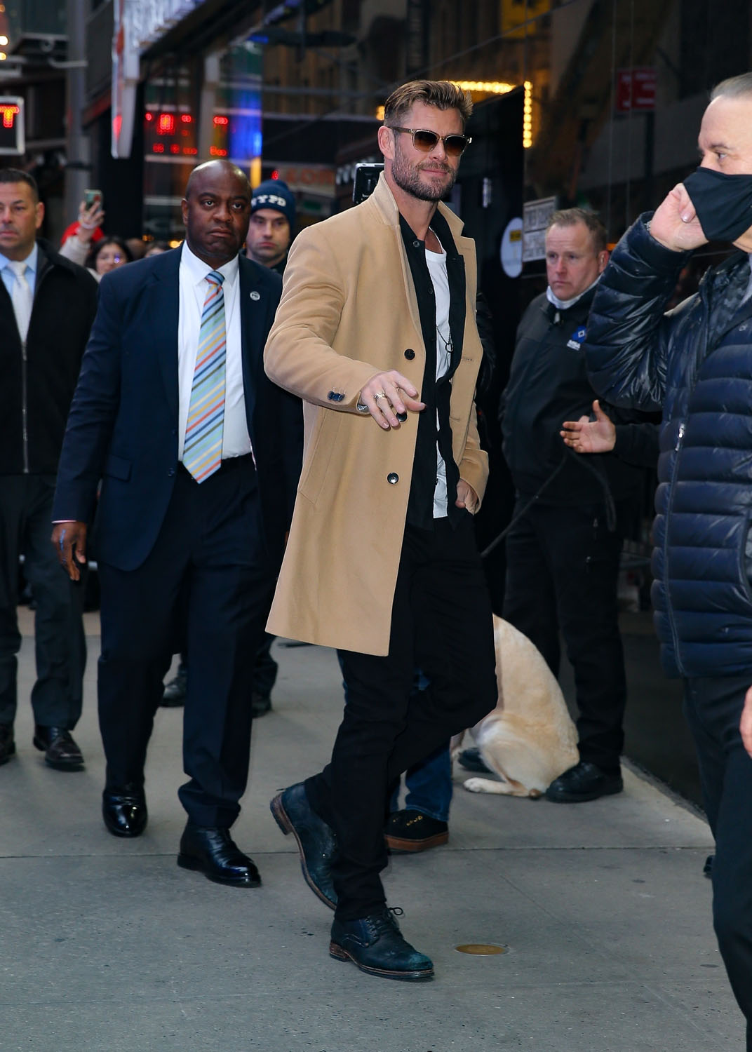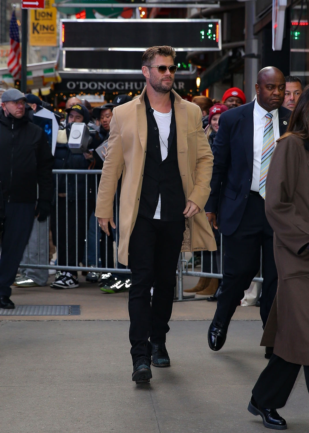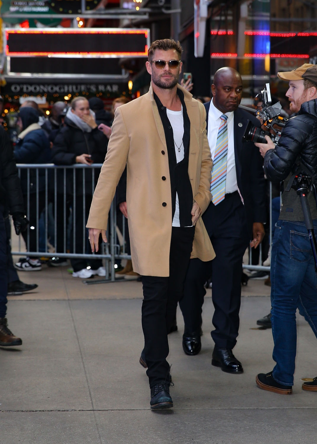 That’s it, really. This is all I wanted to show you: Chris Hemsworth making the rounds in New York today in a camel coat looking very, very, very hot. Which is not a revelation, I get it. This is Chris Hemsworth, the Sexiest Man Alive in 2014, so of course he’s hot, he’s been hot for a long time. It’s just that he was never really my brand of hot back then. Like, sure, I have eyes, I can see why people think he’s hot, he just never did it for me by just being shirtless. Chris Hemsworth got hotter when he got funnier.
