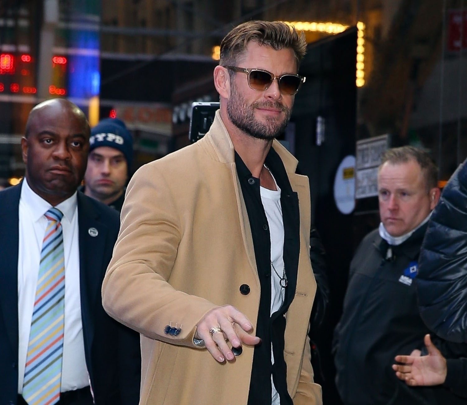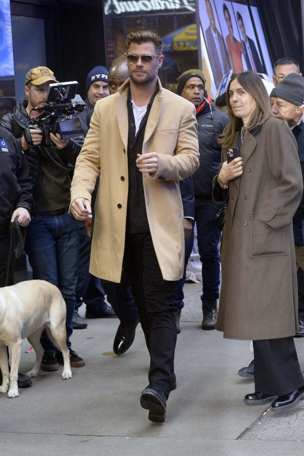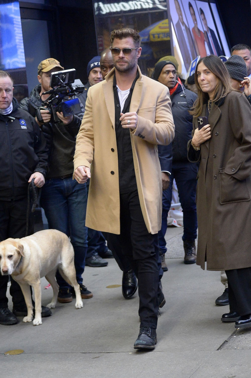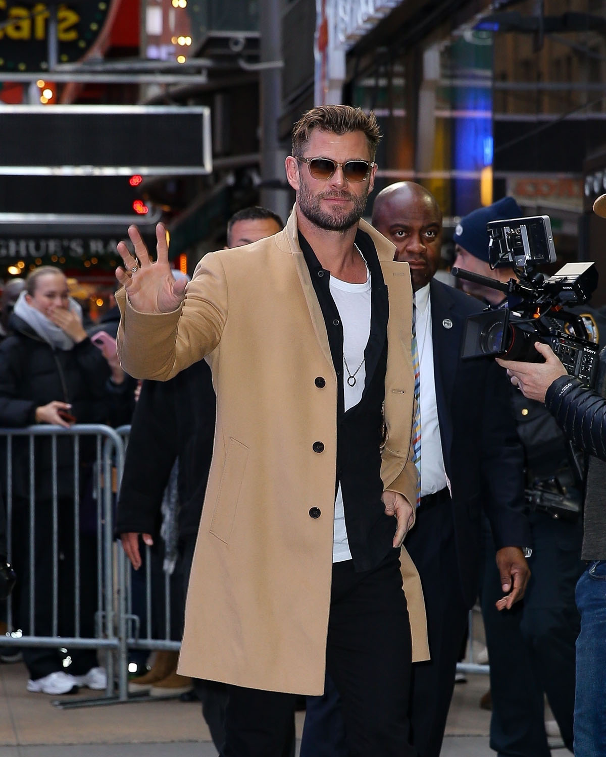 That’s it, really. This is all I wanted to show you: Chris Hemsworth making the rounds in New York today in a camel coat looking very, very, very hot. Which is not a revelation, I get it. This is Chris Hemsworth, the Sexiest Man Alive in 2014, so of course he’s hot, he’s been hot for a long time. It’s just that he was never really my brand of hot back then. Like, sure, I have eyes, I can see why people think he’s hot, he just never did it for me by just being shirtless. Chris Hemsworth got hotter when he got funnier.
