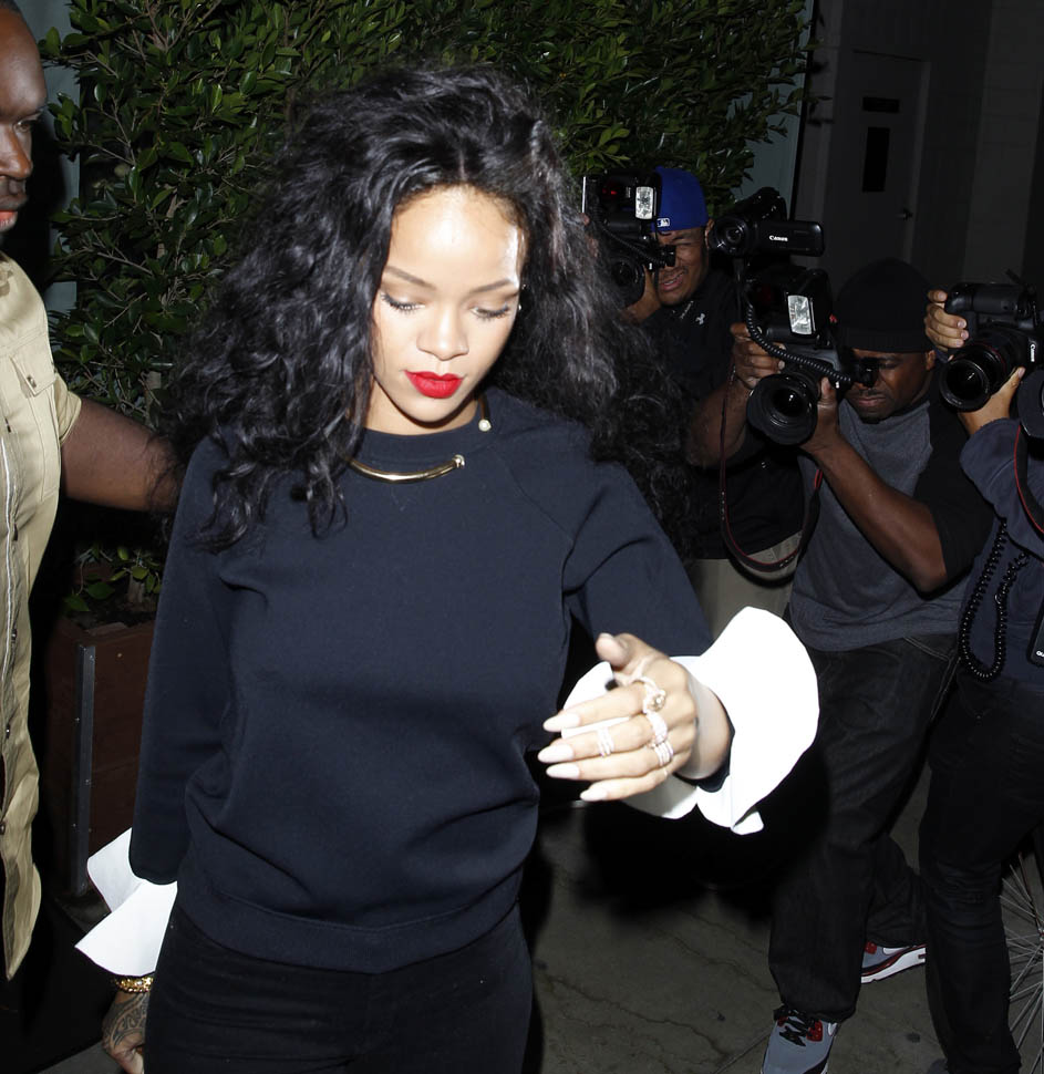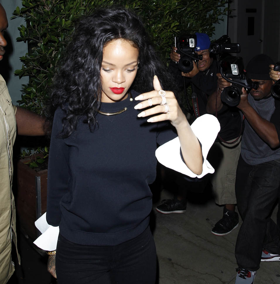 In addition to dining out repeatedly with his estranged wife, Chris also had dinner with Rihanna at her favourite restaurant Giorgio Baldi. She’s there all the time. Isn’t that where she punked off Charlie Sheen? Anyway, Chris and Ri have collaborated before so don’t, please, don’t go there. She would destroy him.