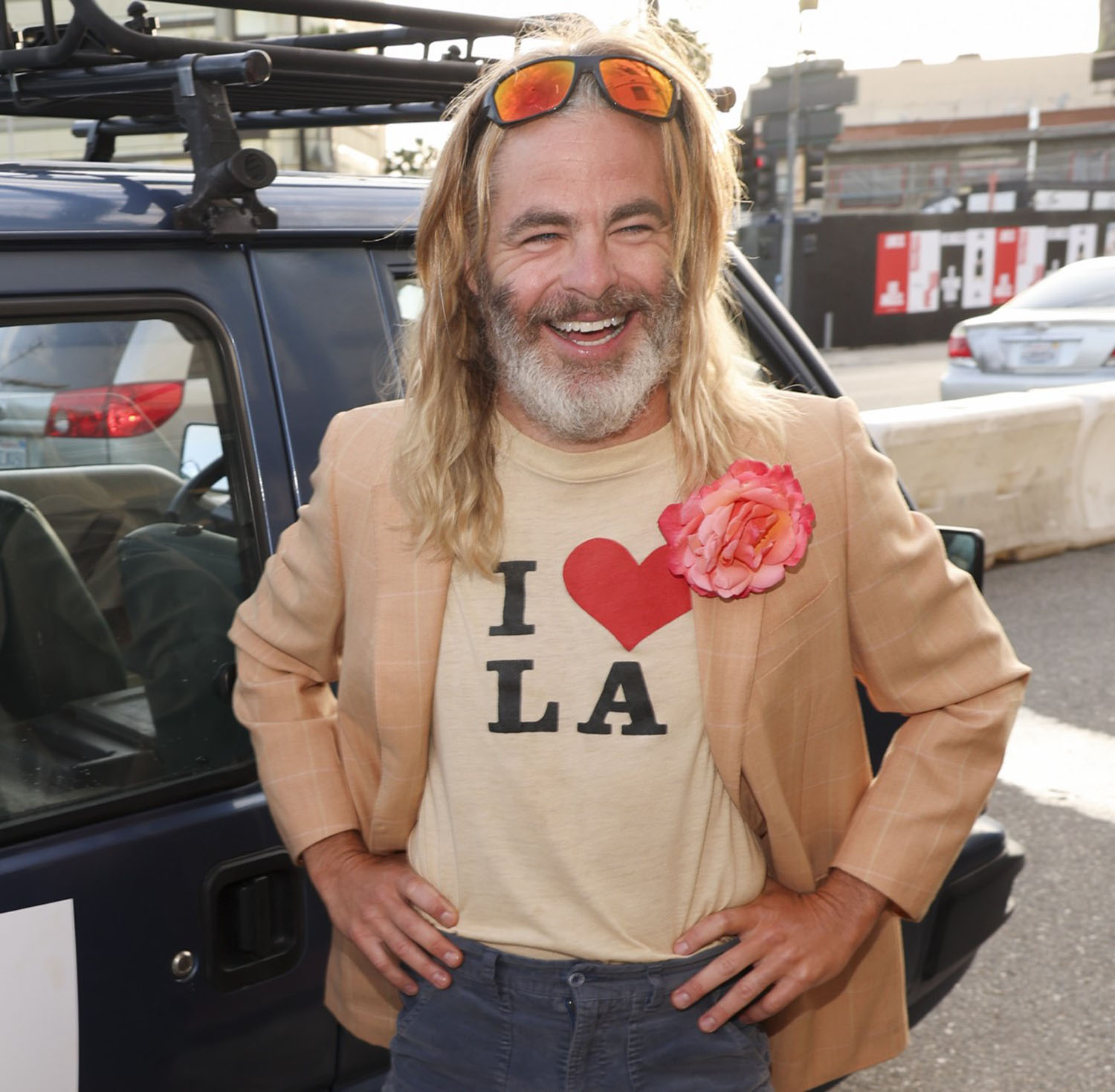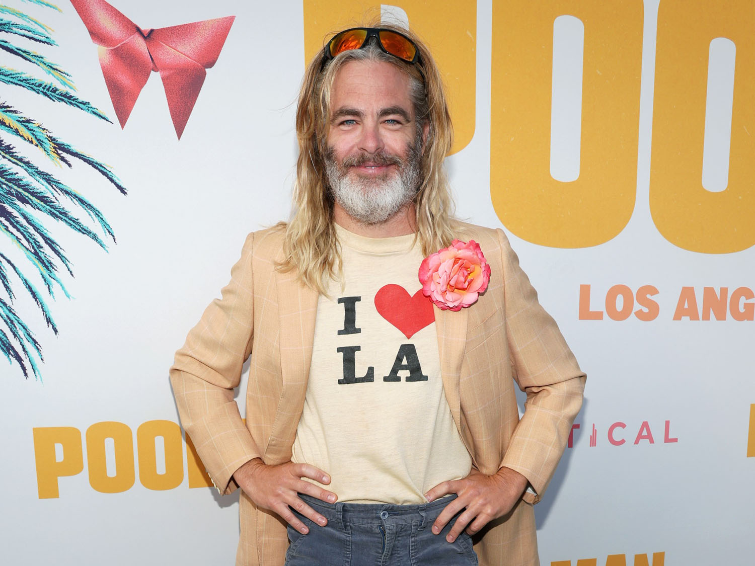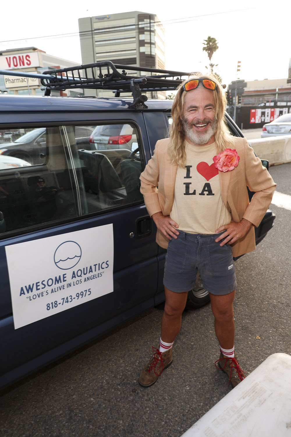 Chris’s film, which he wrote and directed, is called Poolman; he is the poolman. So he rocked up to the premiere in a poolman’s truck looking like, well, a poolman. He’s looked like this for a while now but the fit is… well… him AND his character.