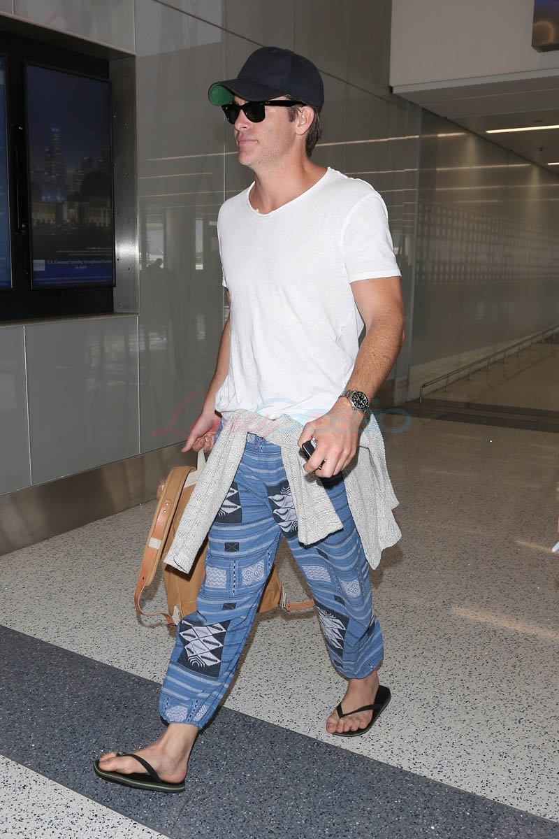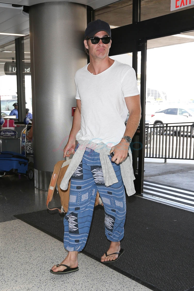 Having said all of that, I am about to defend Chris Pine's flip flops. Hear me out. He is at the airport. Airport floors are disgusting and flip-flops are barely shoes so he's basically barefoot at LAX. What in the actual f-ck, Chris? Sorry, I was supposed to be defending this. My theory is that Chris is on his way to a beach location. Unless someone out of frame is carrying his suitcase, he is packing LIGHT. Maybe he's heading to Cabo for the weekend and only wanted to bring one pair of shoes. Flip flops don't count as shoes. This is hard. If Chris is heading to the beach, this would also explain these pants I don't understand. They look like part sweats part kaftan pants, also only acceptable if you are about to sip on a piña colada in Mexico.