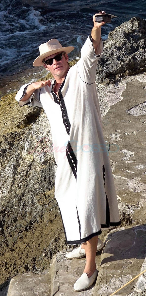 For more of Chris in a caftan and others where he’s shirtless and perfect, click here.