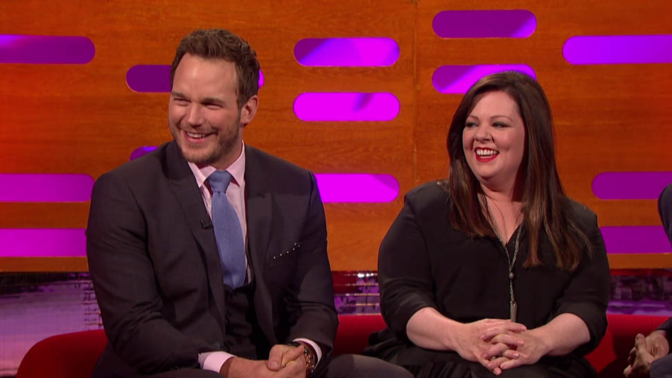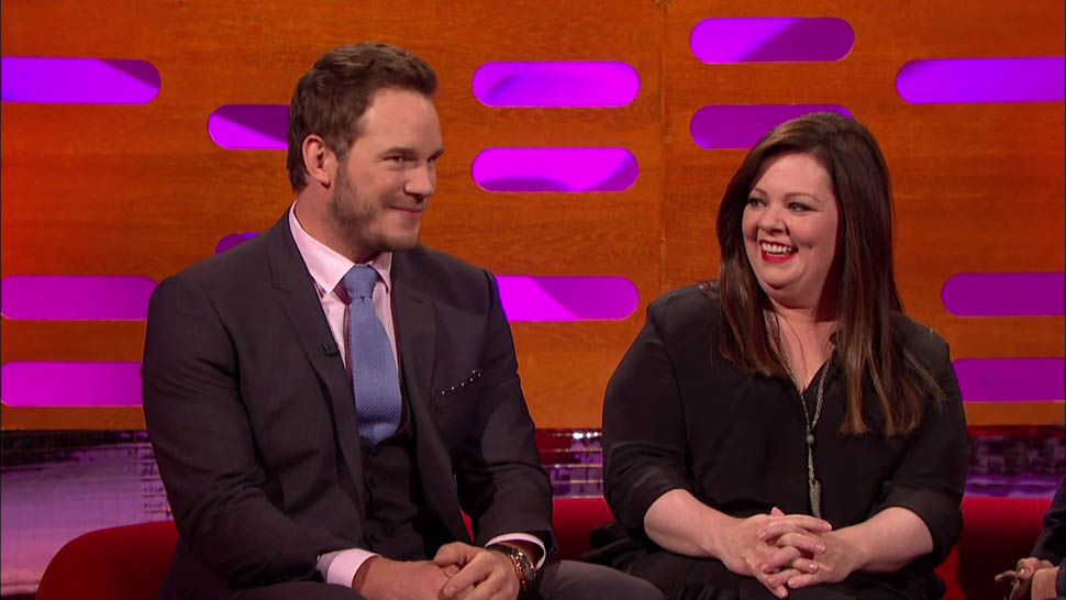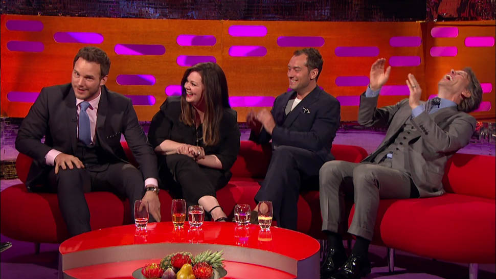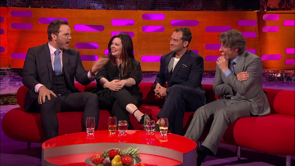 Pratt pretty well crushed it on Graham Norton, and Norton was clearly delighted to have such a game guest. Everyone on that couch developed a Pratt crush--look at how Jude Law is looking at him! Check out this clip of him doing an English accent and impressing the hometown crowd. I now want Chris Pratt to appear in an English comedy. Get on that, Stephen Merchant.