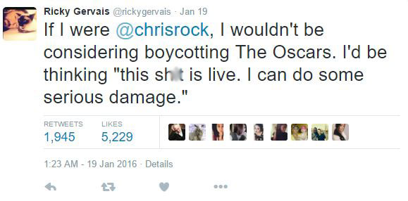 There have been reports that Chris Rock is under a lot of pressure to maybe not host the Oscars this year because of the lack of diversity in the nominations. There are other reports that there’s no way he’s not hosting and that he’s working on a scathing monologue. Which is what Ricky Gervais wants him to do.