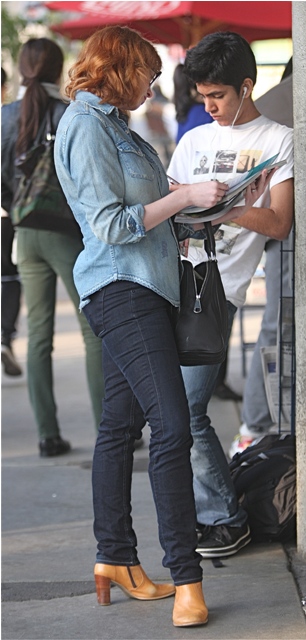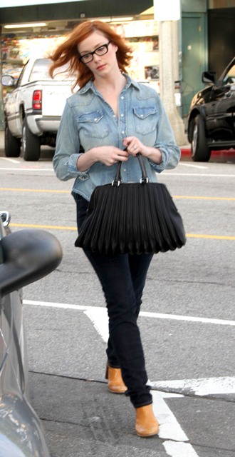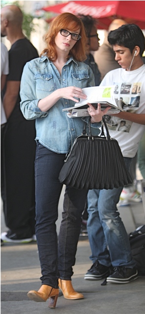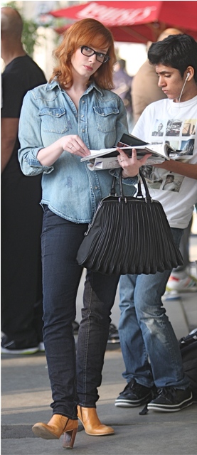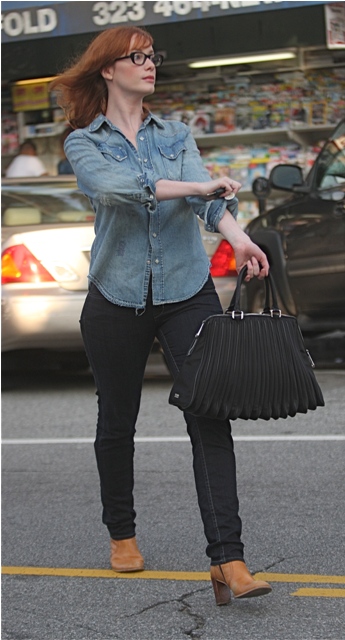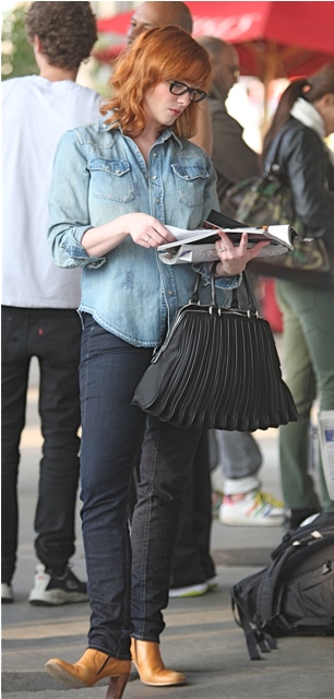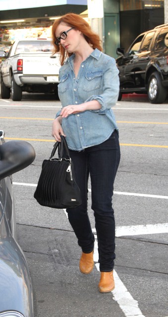 And then yesterday, a much more casual Christina was photographed at the magazine stand. Really not feeling the denim on denim. But the way she fills out her jeans more than makes up for it. How refreshing to see a celebrity in skinnies without twiggy legs.