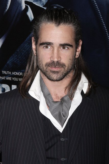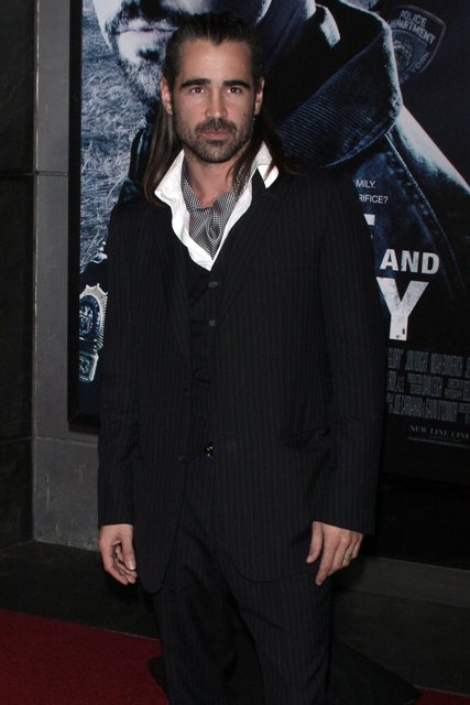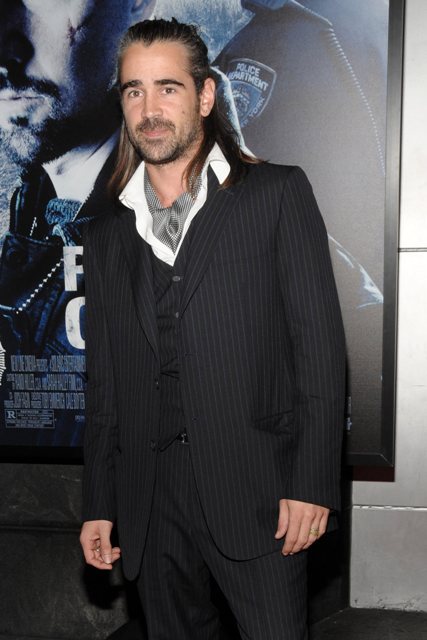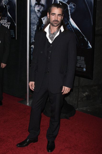 Because last night in New York at the Pride & Glory premiere, Colin Farrell actually tried. He cleaned himself. He did his hair. He put on a well cut pinstriped suit that fit like a dream and accessorised with a man scarf. He ditched his old beat up boots and put on a pair of perfect dress shoes and he whispered with his eyes secret Irish words that only your loins will understand.