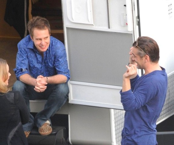 Colin Farrell was papped on the set of Seven Psychopaths yesterday, both times wearing a v-neck. The dude clearly does not believe in a crew neck. Like, ever.