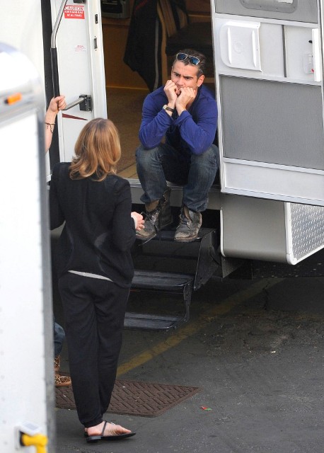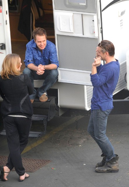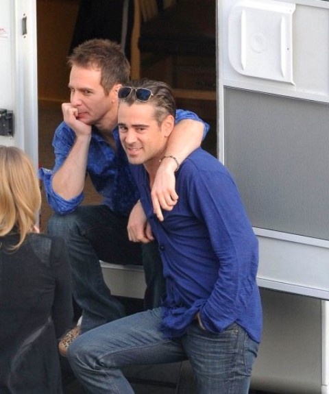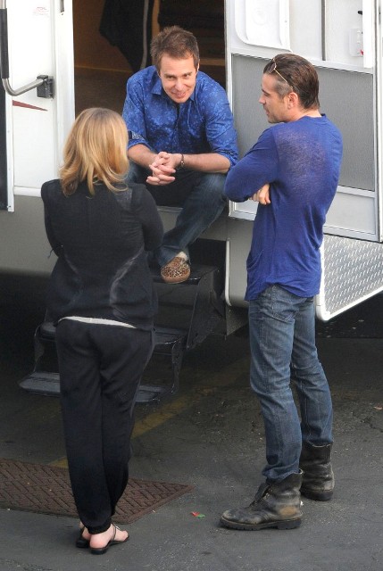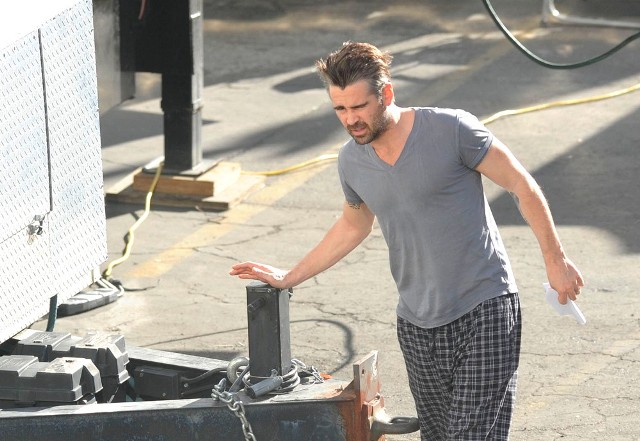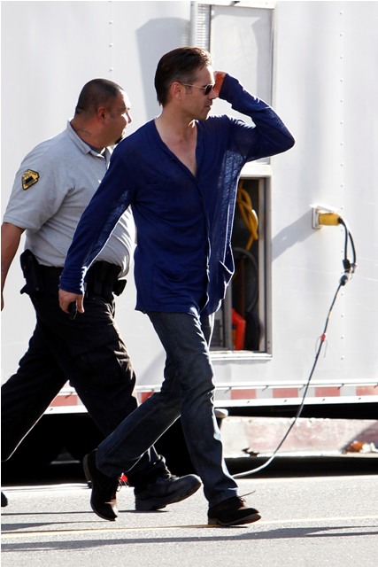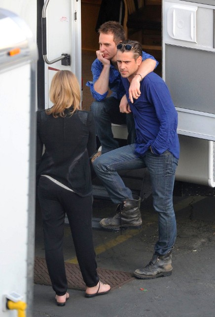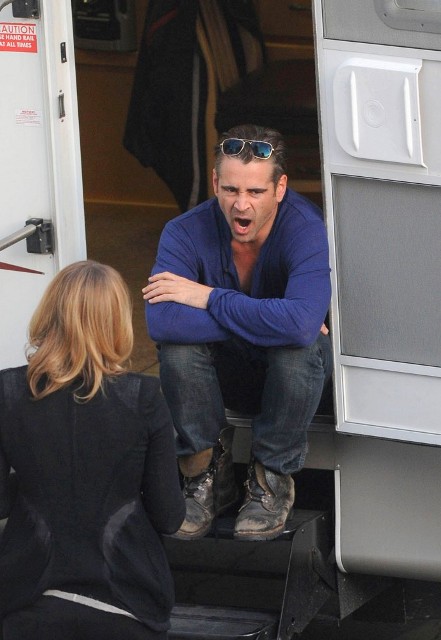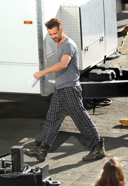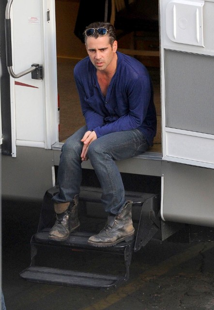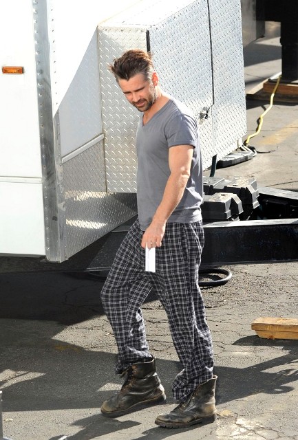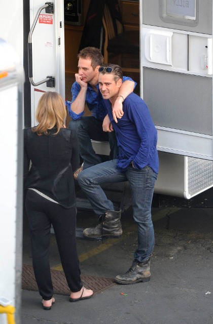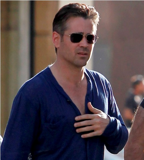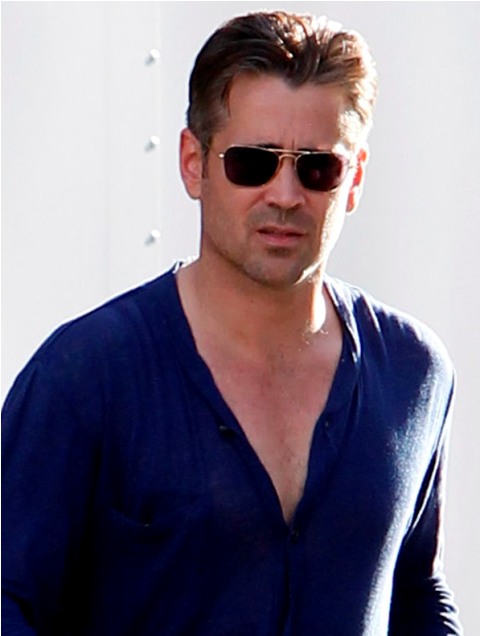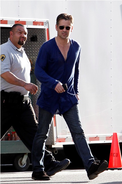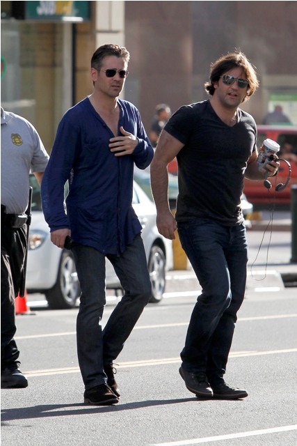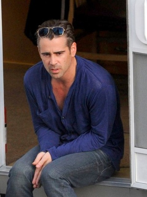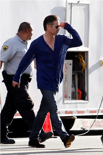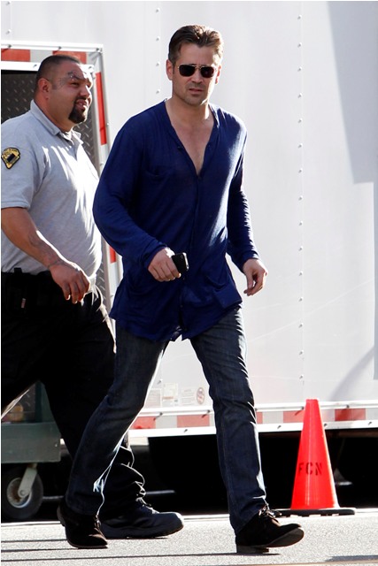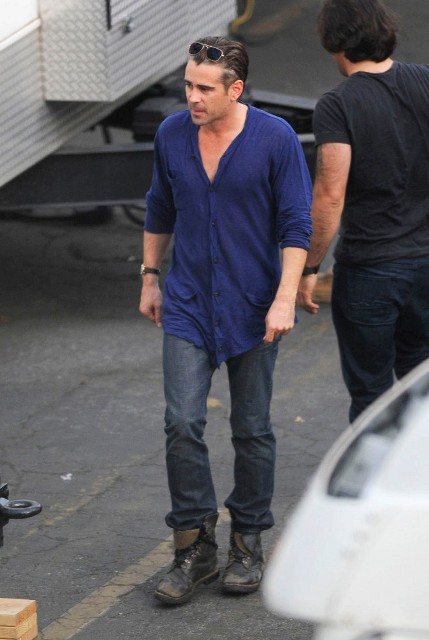 Colin Farrell was papped on the set of Seven Psychopaths yesterday, both times wearing a v-neck. The dude clearly does not believe in a crew neck. Like, ever.