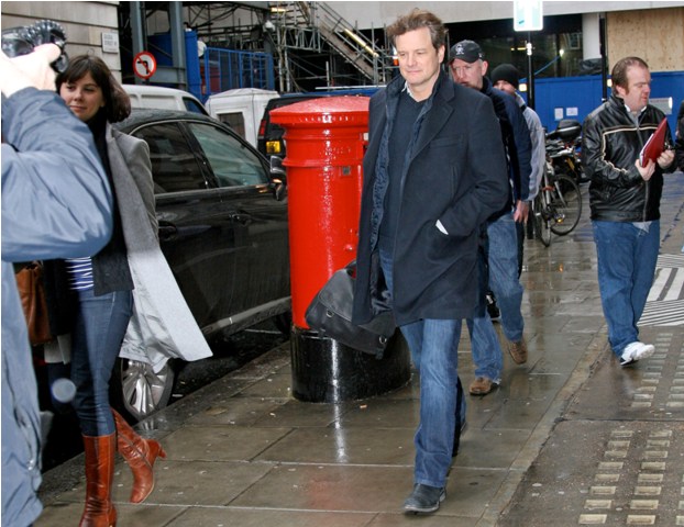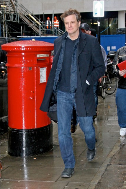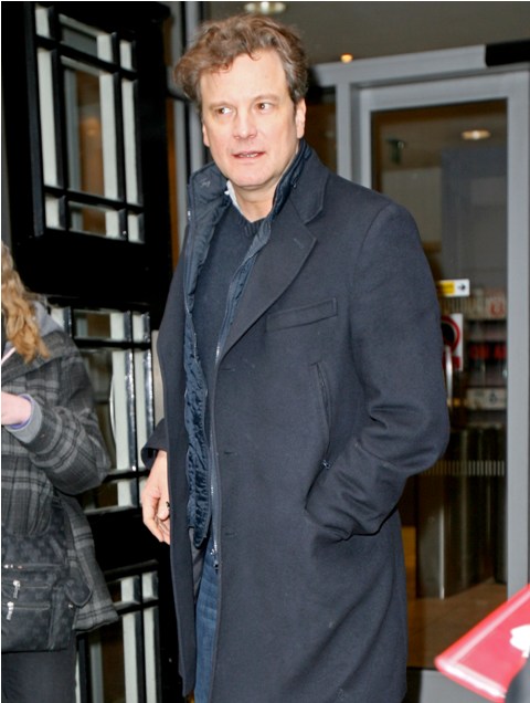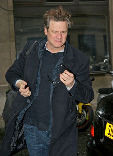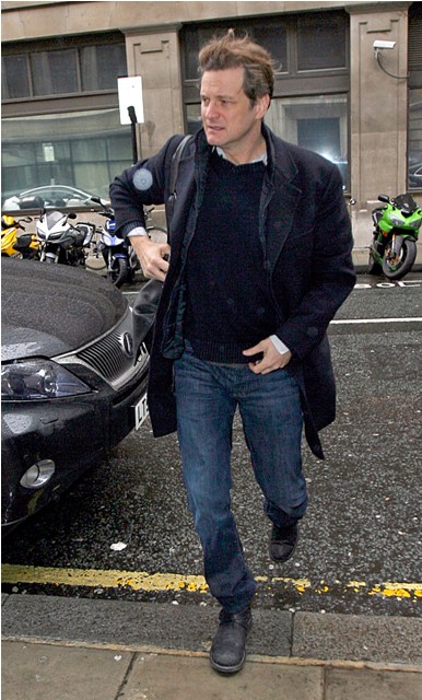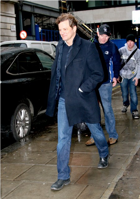 Nicole Kidman’s face, but this also applies to Colin Firth’s hair. As you know, it’s never a terrible thing to see Colin in a tux. But my one complaint about him during awards season has been the hairspray. He is so much sexier with hair that moves. Like today, in London leaving Radio 2 after an interview, Colin’s hair in the wind, some grey in the corners, wearing the sh-t out of those jeans… YES.
