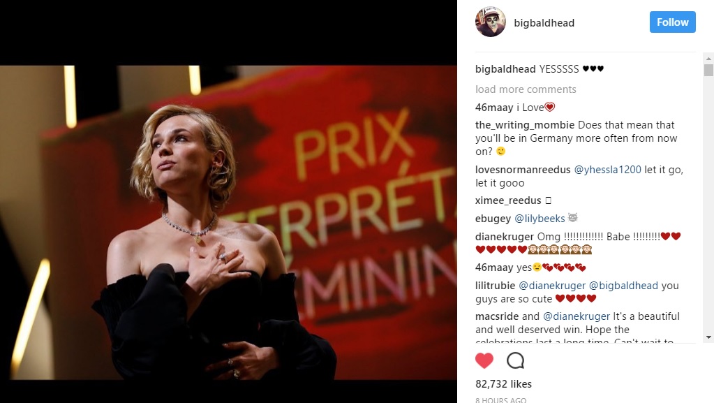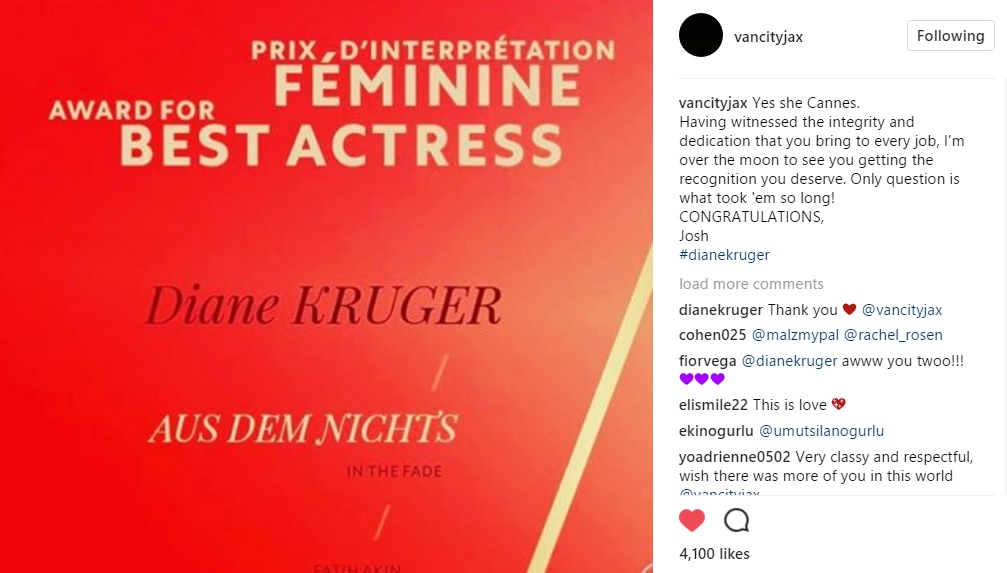 Diane Kruger won the Best Actress award at Cannes on Sunday for her work in Into The Fade. Joshua Jackson congratulated her on Instagram. Joanna noted Diane’s response: