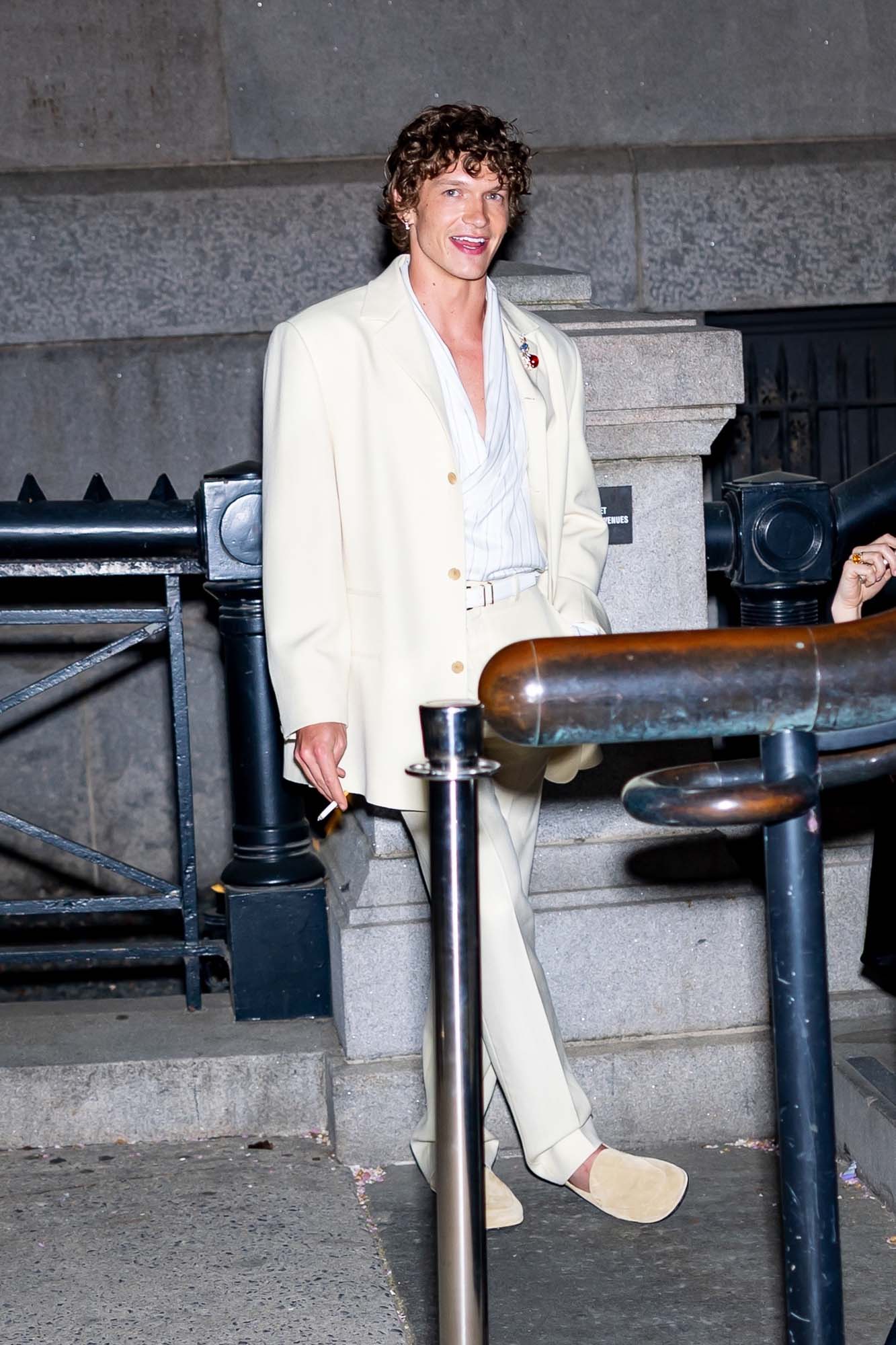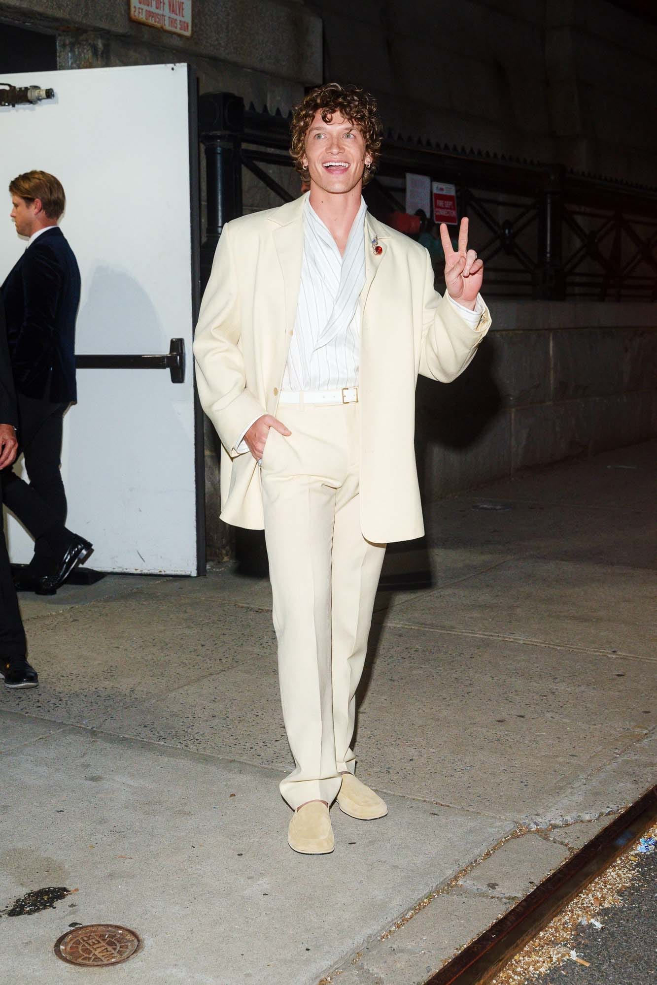 Connor was at the event in a cream suit and surprisingly discreet jewelry, sticking with a red lapel pin. I feel like Connor very quickly made bling one of his style trademarks, he plays with jewelry in a very fun way, but this is a relatively restrained look. He looks good! Just surprised the jewelry wasn’t more obvious. I need more jewels to distract me from the shoes. The shoes are not working.