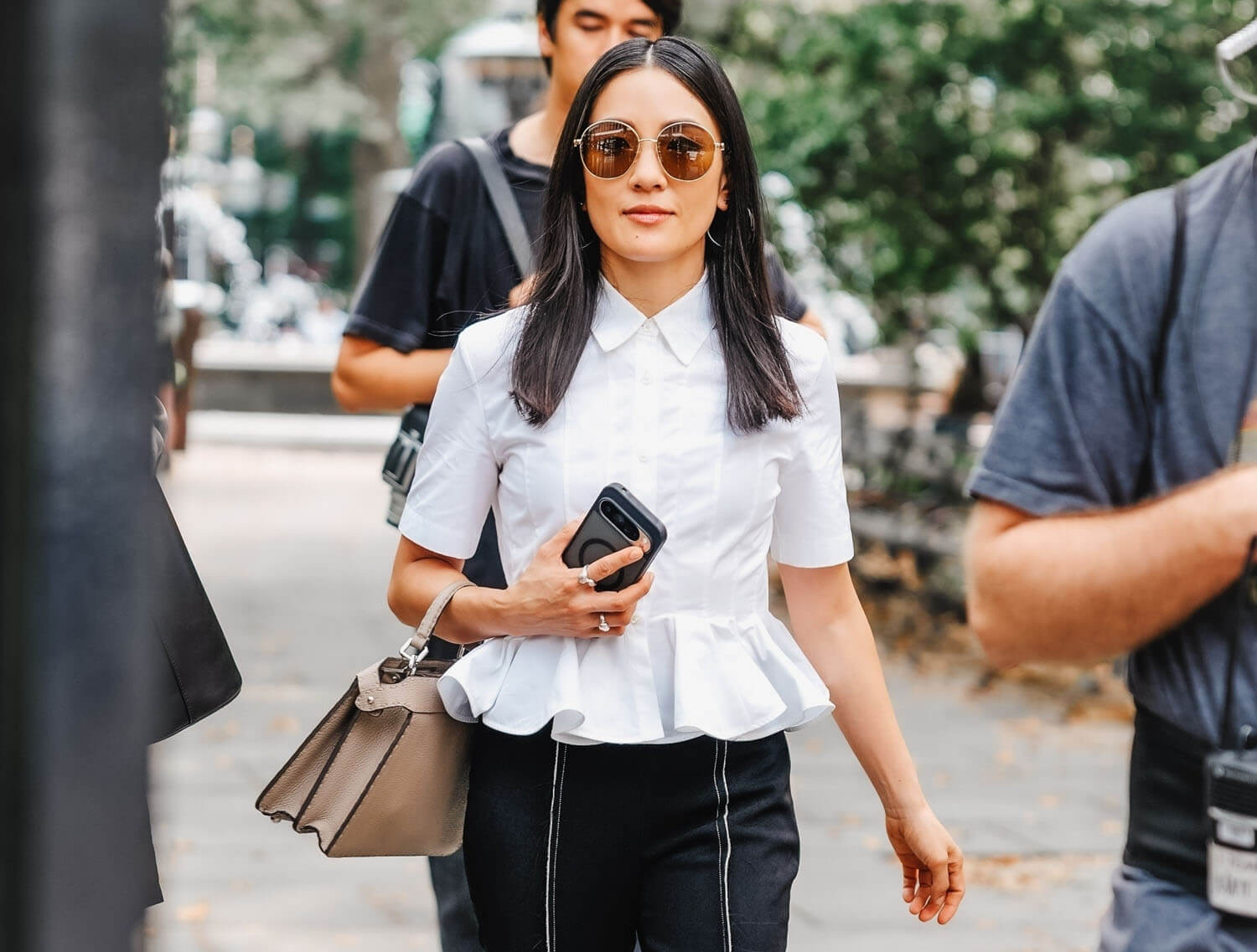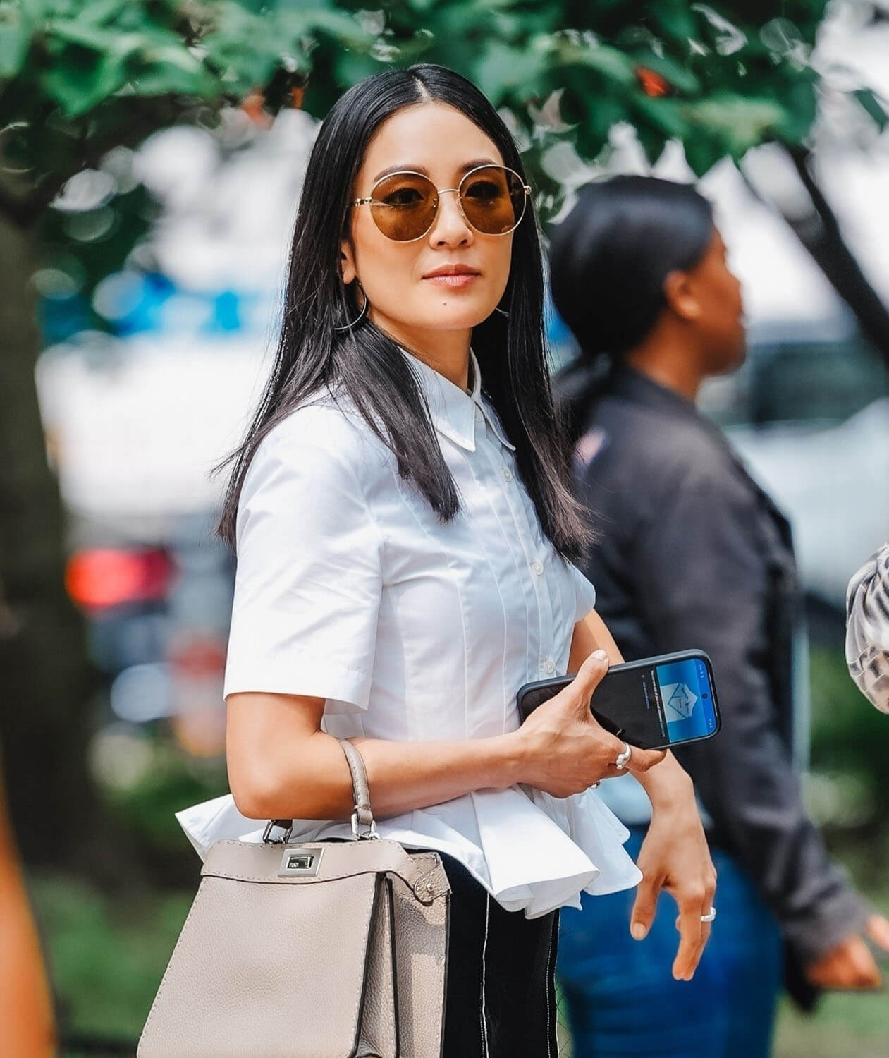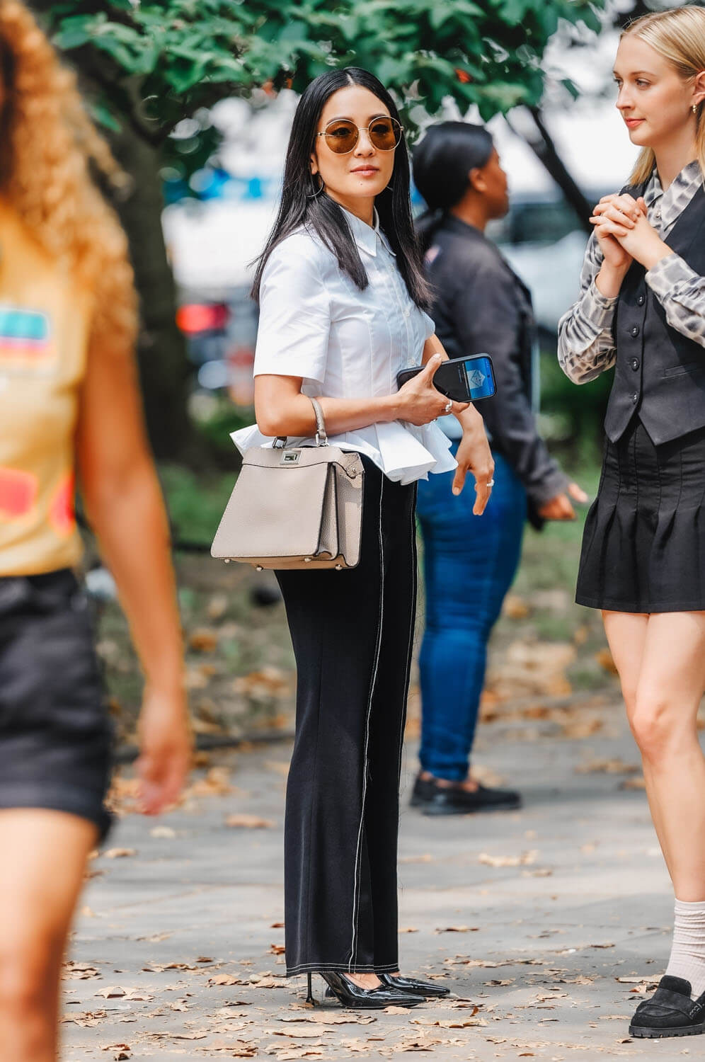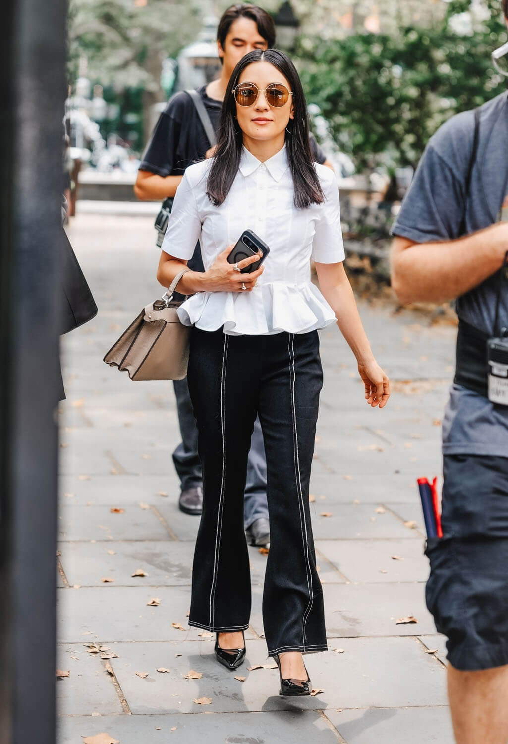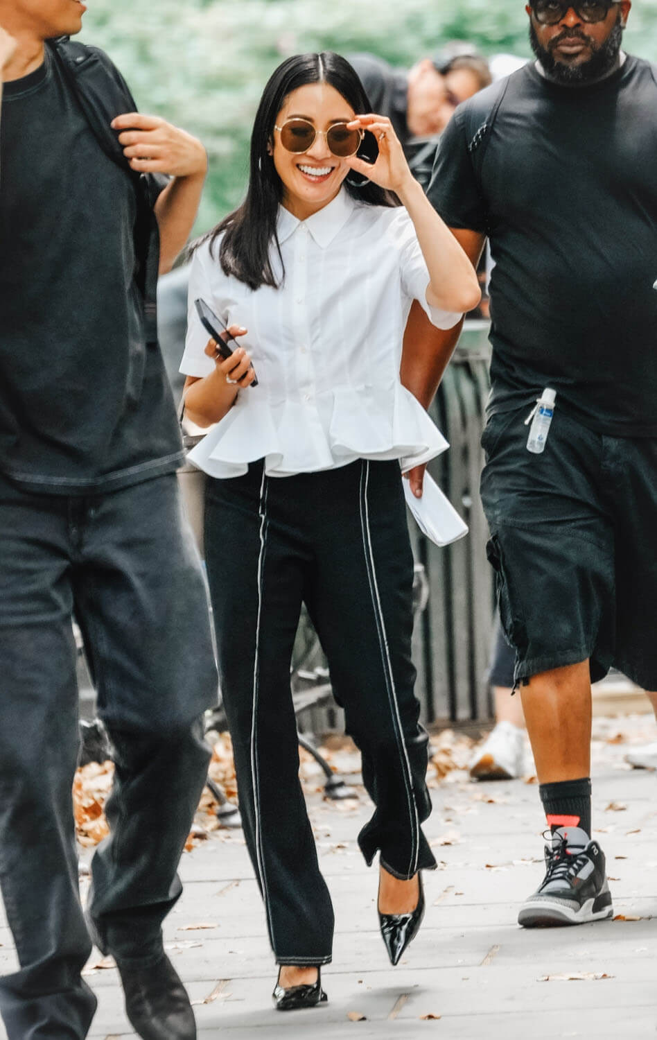 One of the highlights of Crazy Rich Asians was the fashion. Constance doesn’t need to be Rachel Chu to serve looks though because Katie’s giving her the opportunity on her movie. This is a crazy good oufit and for the last two days I’ve been trying to shop it for myself starting with these excellent black pants with the front white stripe.