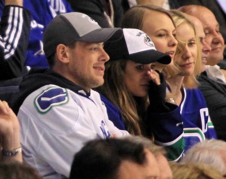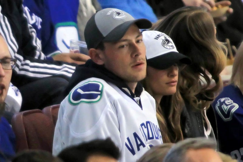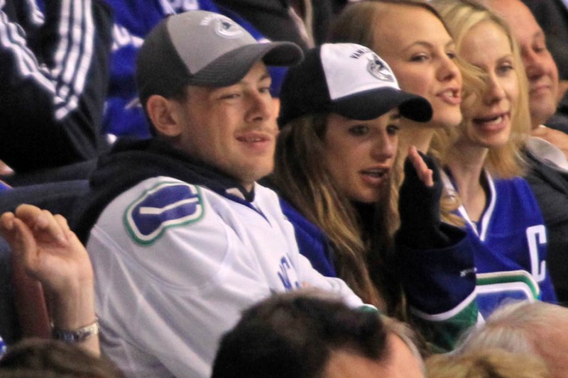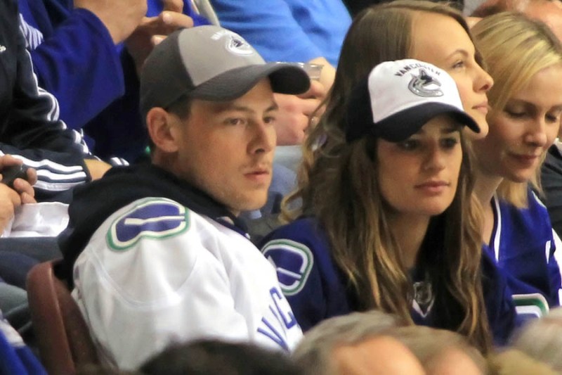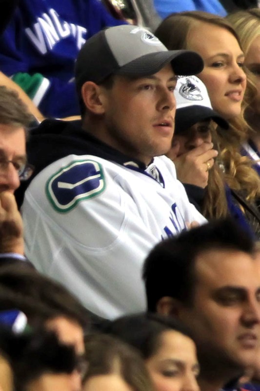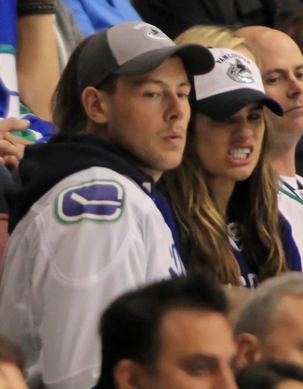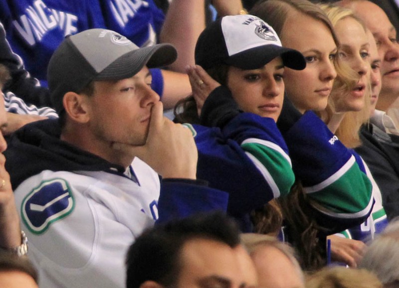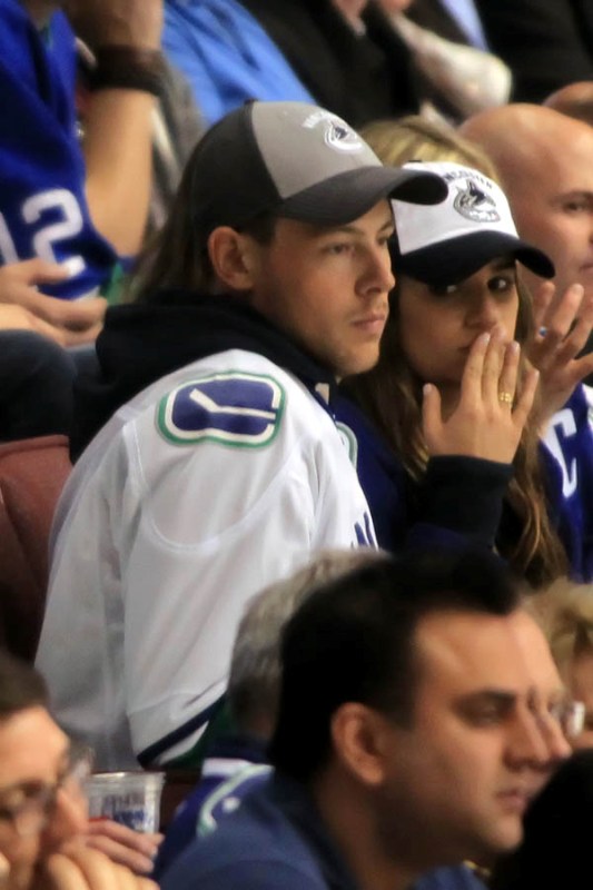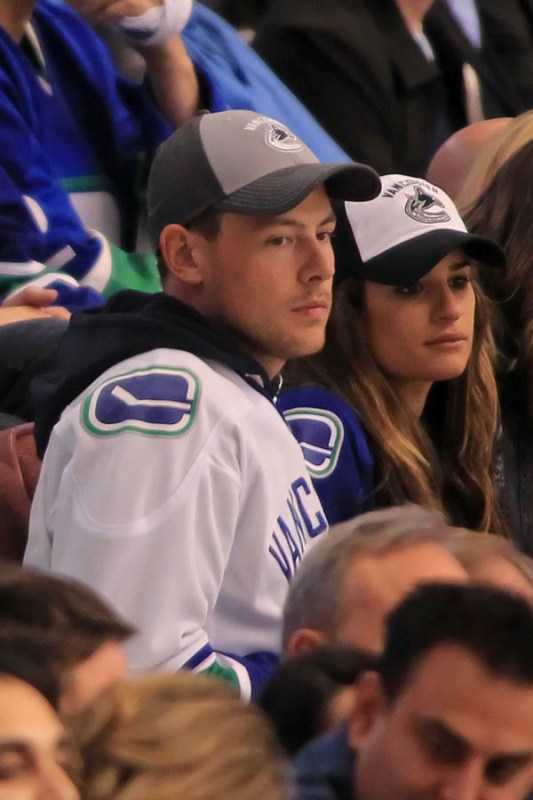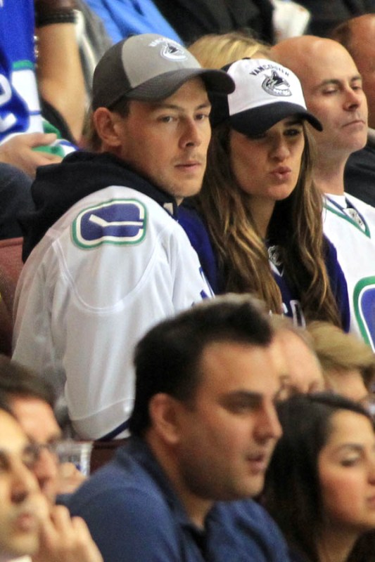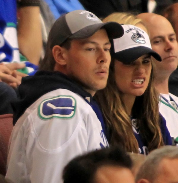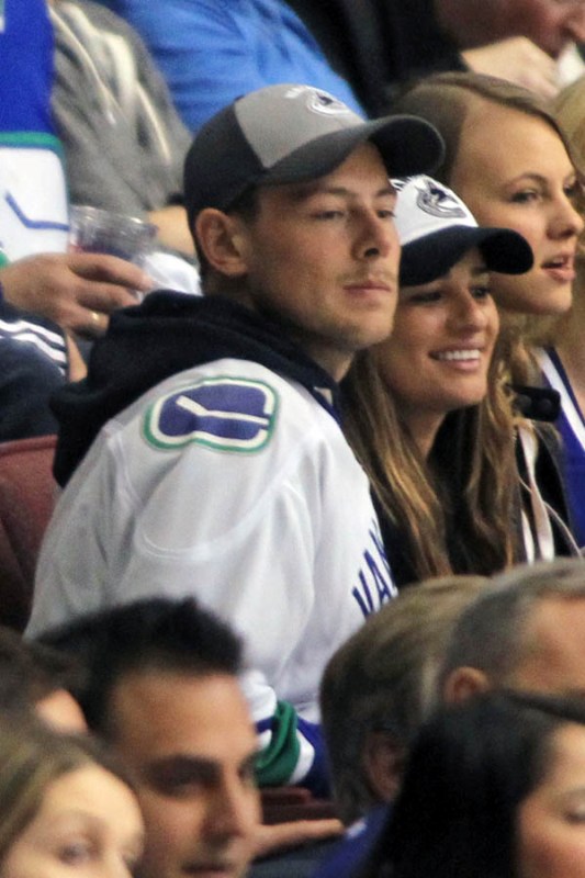 Cory Monteith completed a month of rehab last week and came home to Vancouver with Lea Michele just in time for the start of the playoffs. Here they are at Round 1 Game 1 of the San Jose Sharks vs the Vancouver Canucks last night. They put their faces up on the big screen in the first period, both tricked out head to toe in Canucks gear. He looked good. Healthy. And her too. Even better in person. She’s much prettier in person. And the hair, though it’s probably fake, looks very good in person. By very good I guess I mean very real.