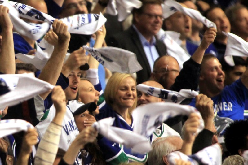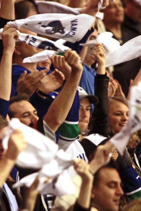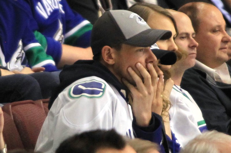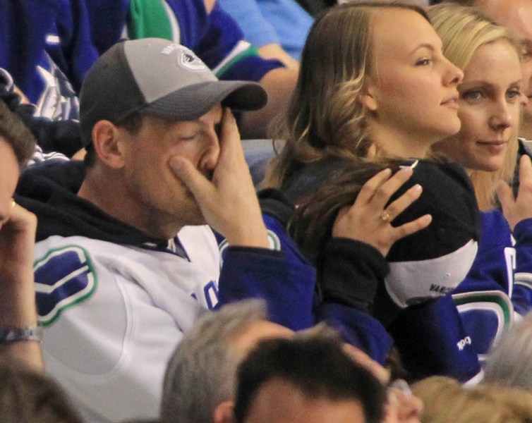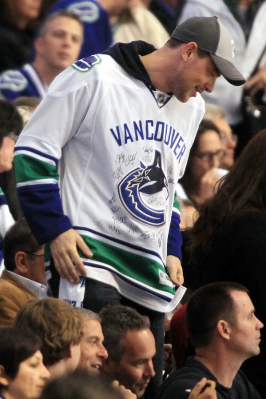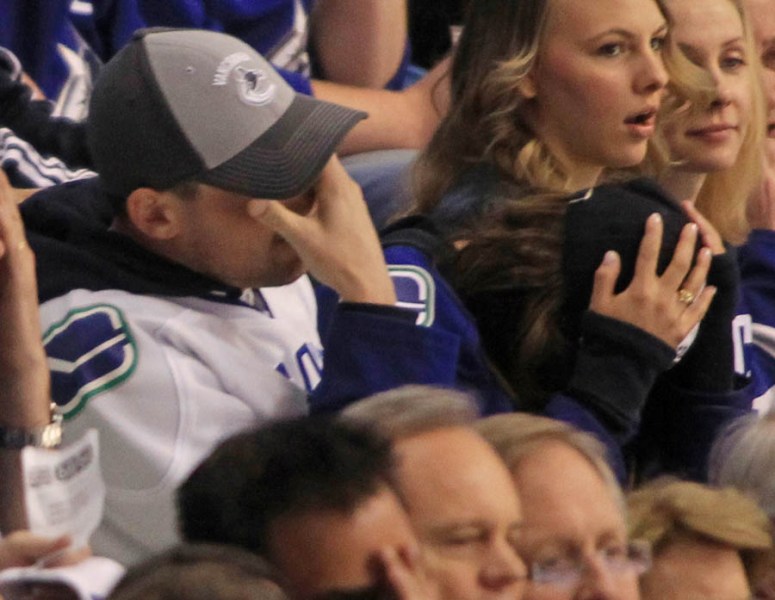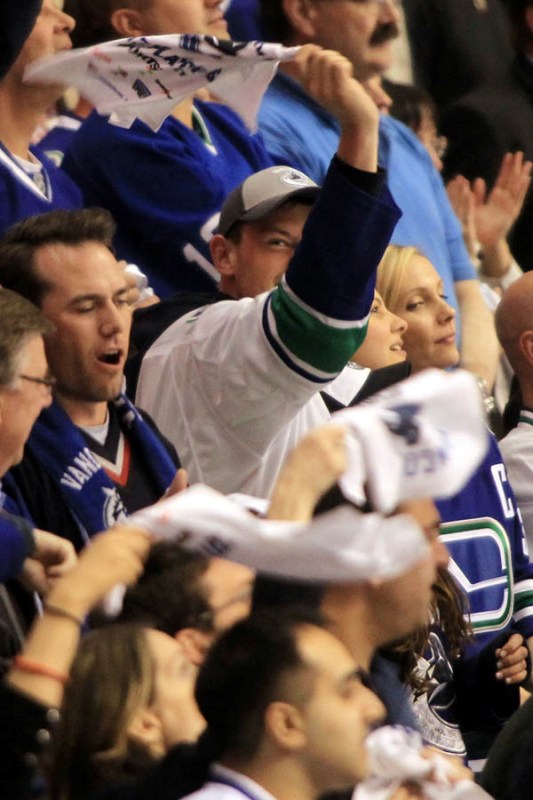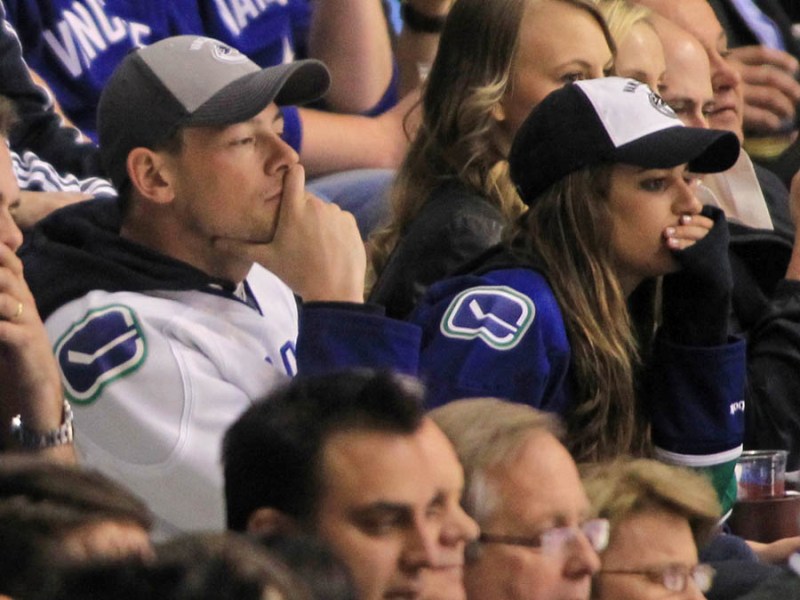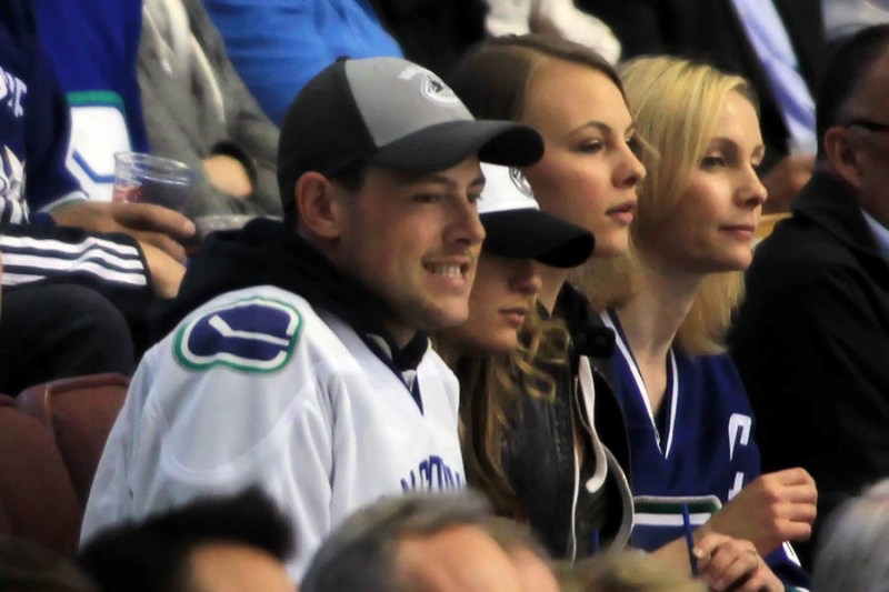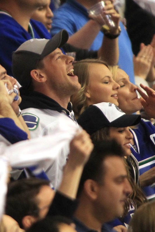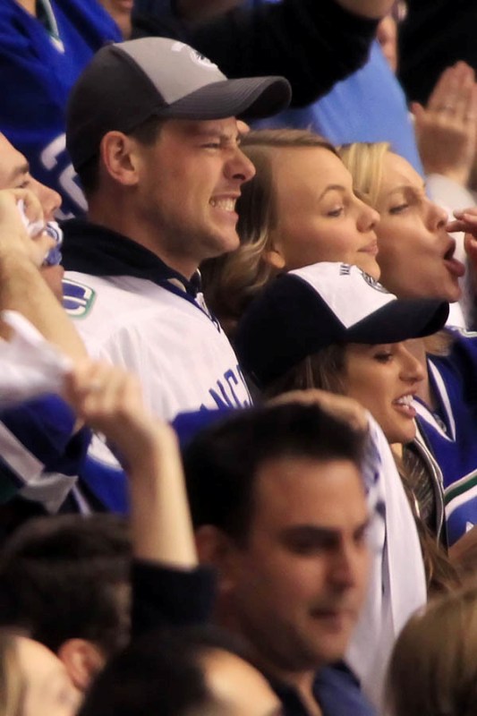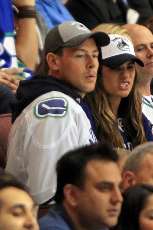 Cory Monteith completed a month of rehab last week and came home to Vancouver with Lea Michele just in time for the start of the playoffs. Here they are at Round 1 Game 1 of the San Jose Sharks vs the Vancouver Canucks last night. They put their faces up on the big screen in the first period, both tricked out head to toe in Canucks gear. He looked good. Healthy. And her too. Even better in person. She’s much prettier in person. And the hair, though it’s probably fake, looks very good in person. By very good I guess I mean very real.