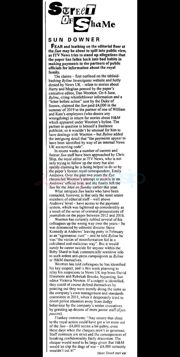 Now it appears that other media outlets, like ITV, are looking into Dan Wootton’s reporting practices at the Sun. Private Eye, a satirical news and politics magazine in the UK that gets pretty inside baseball on the media and political leaders, just published this article about the situation behind the scenes at the Sun and their payment system. This is a hardcopy that I was able to obtain because there is no online version of the story so enlarge your screen to read it: