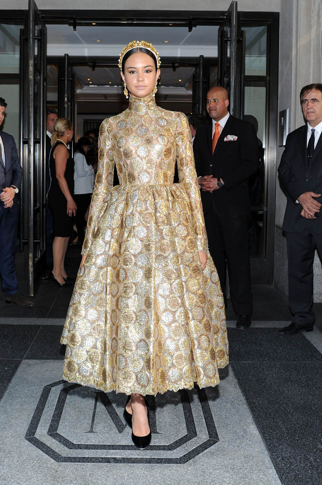 Well it’s gold. But it’s definitely not Chinese. Still… I appreciate the drama of this look (while you’re still wondering who she is. Answer: actress, Mad Max: Fury Road). It’s Dolce&Gabbana and it reminds me of their Fall 2012 collection which Stefano described as “something between princesses and virgins”. Exactly. I love the middle part under the headdress. I love the pale lip, the fresh skin. I love the high collar. I just wish it was a different shoe. From the front, fine. From the side, once you see how that heel comes in, and that the toe is pointier than you thought, it kinda throws things off.
