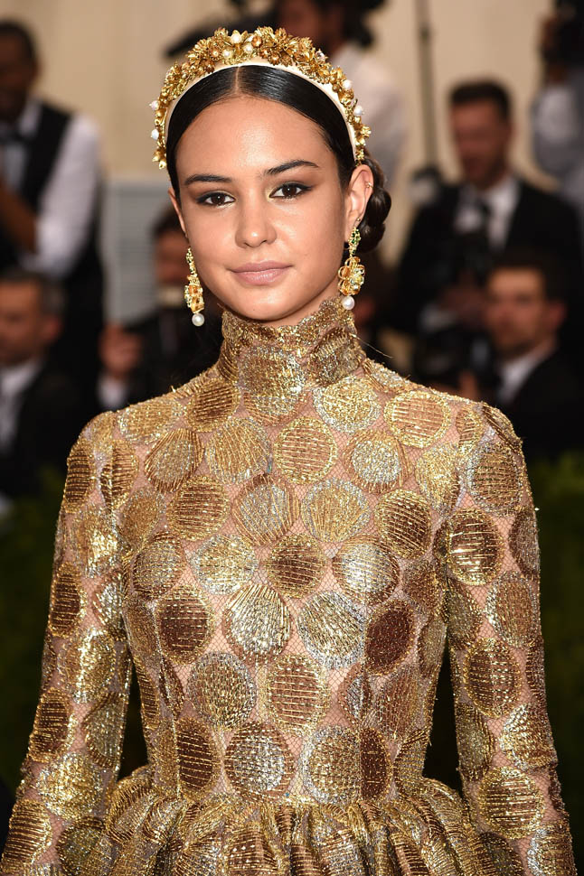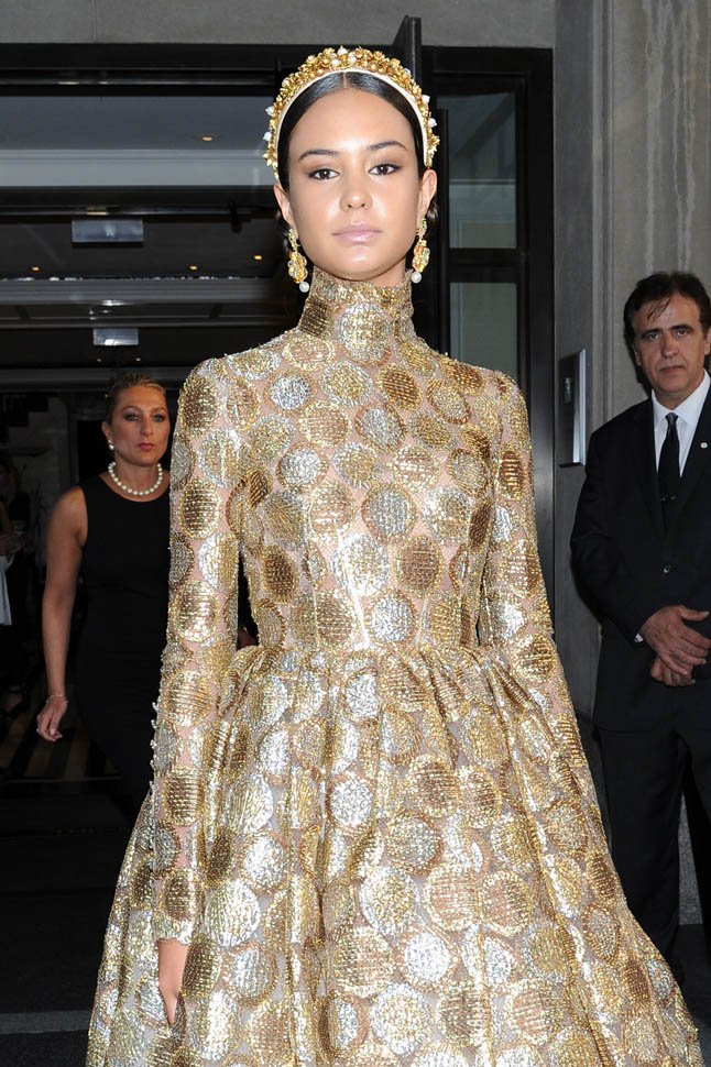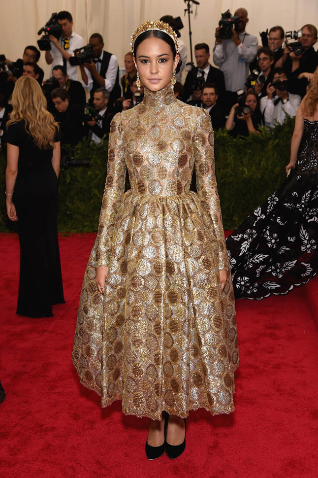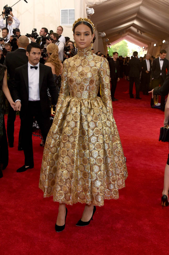 Well it’s gold. But it’s definitely not Chinese. Still… I appreciate the drama of this look (while you’re still wondering who she is. Answer: actress, Mad Max: Fury Road). It’s Dolce&Gabbana and it reminds me of their Fall 2012 collection which Stefano described as “something between princesses and virgins”. Exactly. I love the middle part under the headdress. I love the pale lip, the fresh skin. I love the high collar. I just wish it was a different shoe. From the front, fine. From the side, once you see how that heel comes in, and that the toe is pointier than you thought, it kinda throws things off.