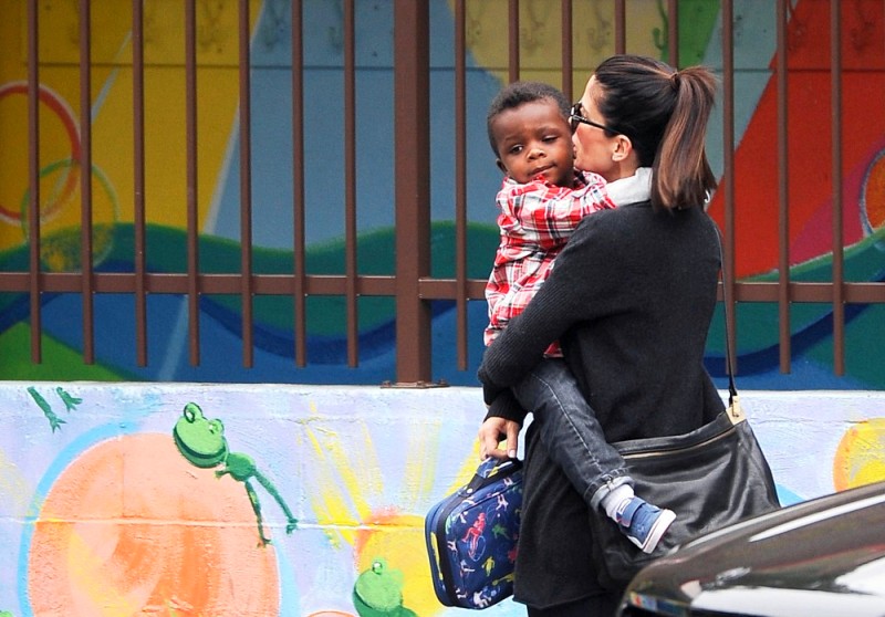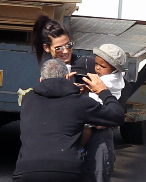 I hated, hated, hated getting dropped off when I was young. I was the kid who cried and wanted to stay home. Louis seems a lot more pragmatic about his ordeal, negotiating there with his ma about what his expectations are when she comes back to pick him up. Will it be ice cream? Will it be a puppy? Will it be a box of new toys from Uncle George Clooney? Clooney and Sandy will be hitting the festival circuit soon in support of Gravity. George and Louis already know each other from when they were shooting the movie in London. Remember this photo of a photo?