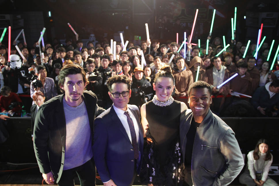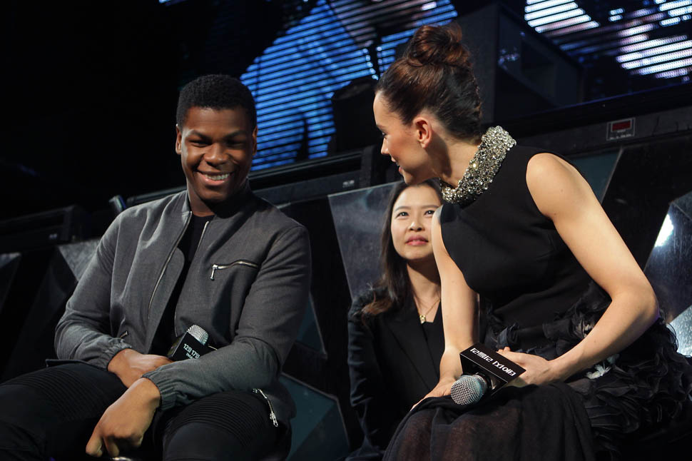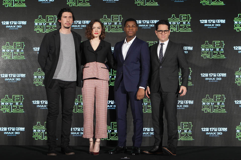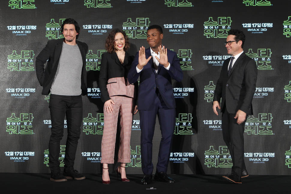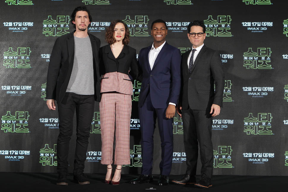 Daisy Ridley, John Boyega, Adam Driver, and JJ Abrams were in Seoul today promoting Star Wars: The Force Awakens. Um, you guys, we are just a week away. A WEEK AWAY. I’m not sure Sarah is going to sleep this weekend.