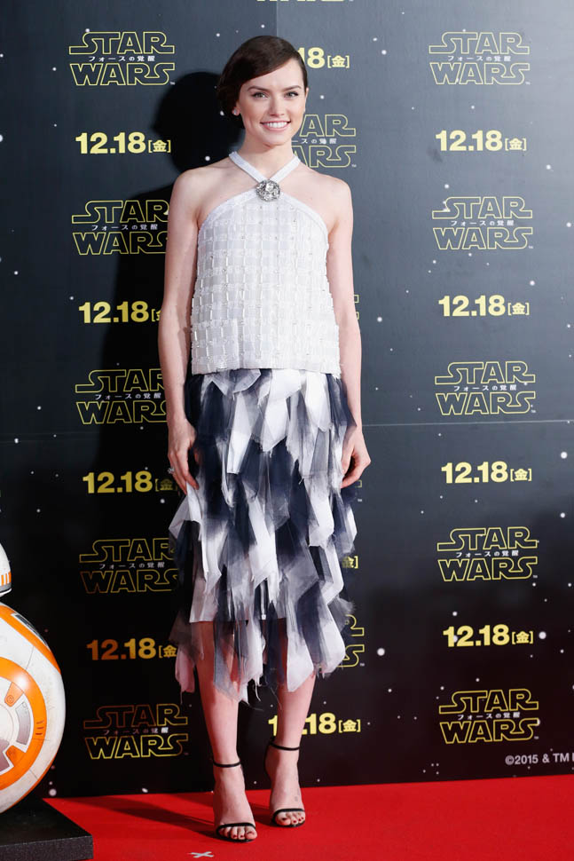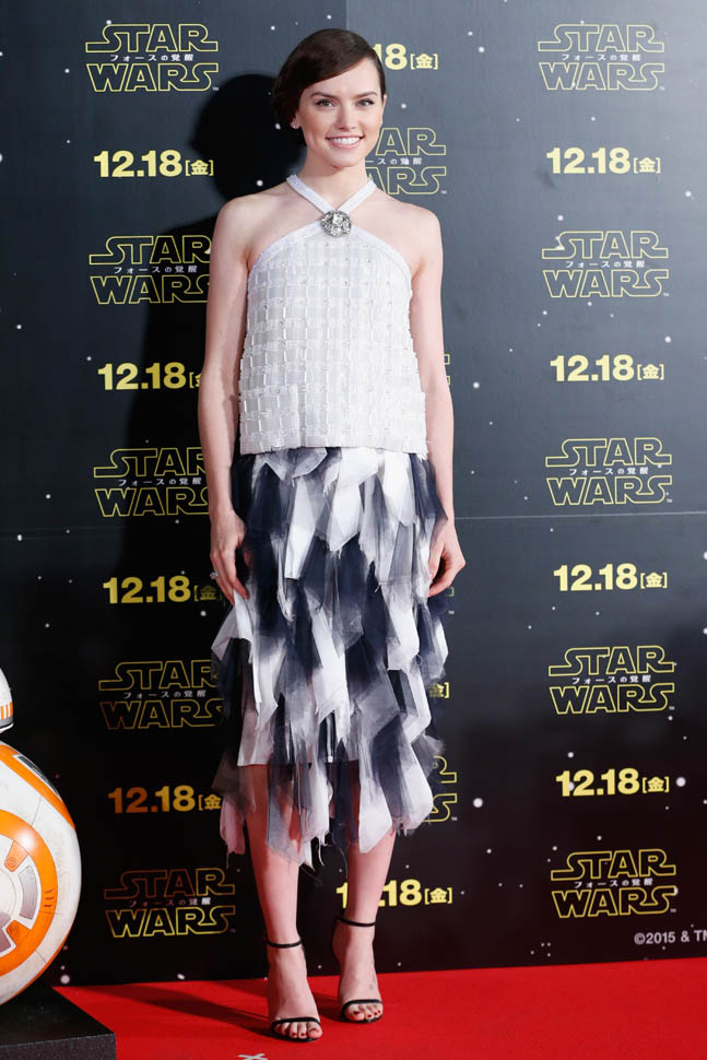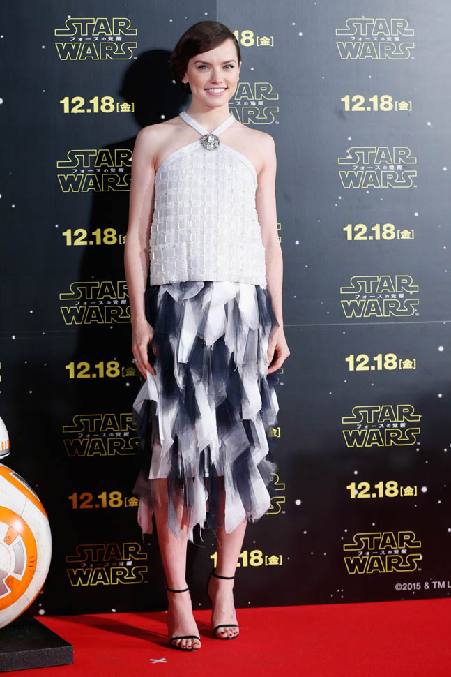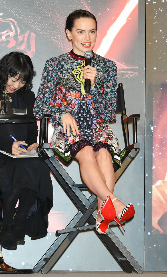 I wrote the other day that Daisy Ridley, on this Star Wars press tour, is becoming a fashion star – click here for a refresher. She continues to bring us some serious style porn here in Japan. I can’t decide which outfit I like better. The romantic black, white, and grey layered skirt is gorgeous. But the multi-coloured high-collar dress is always amazing.