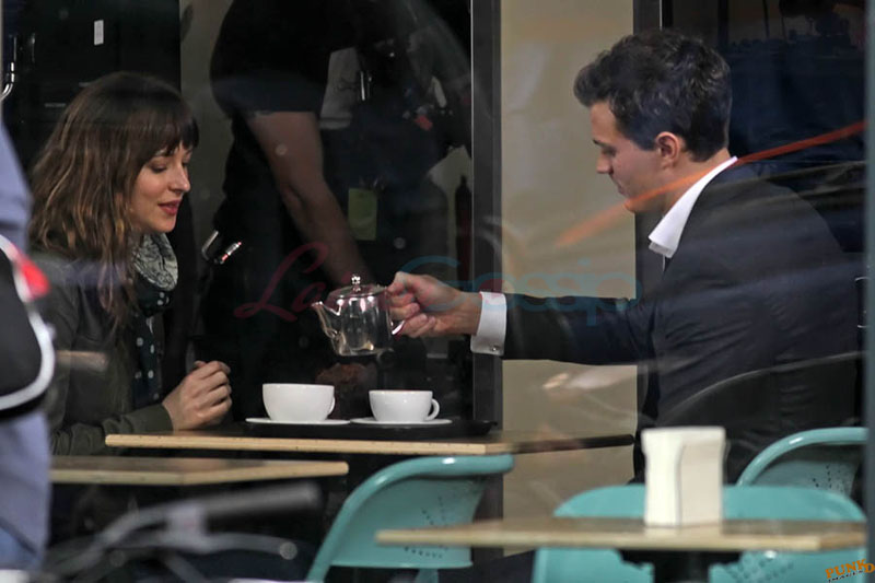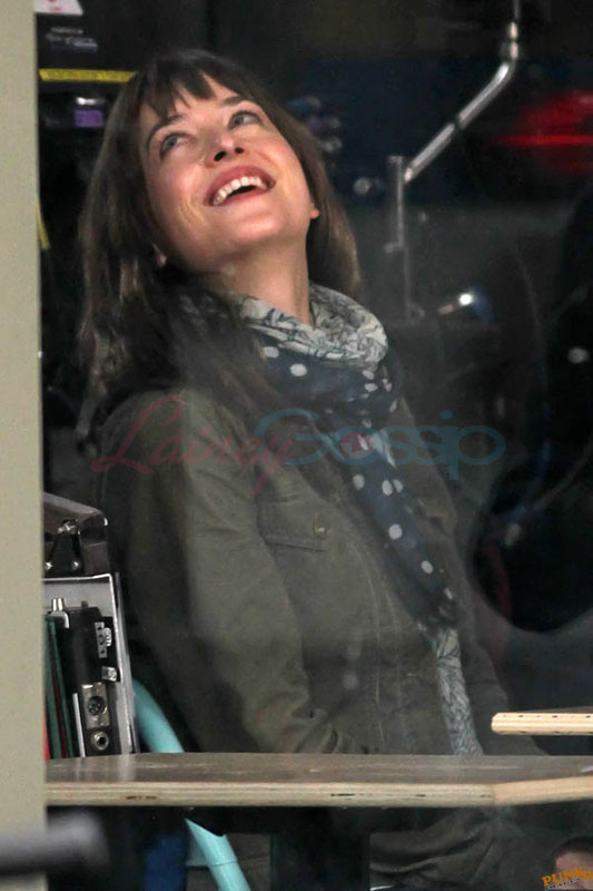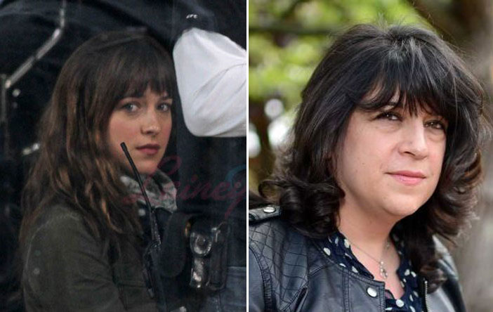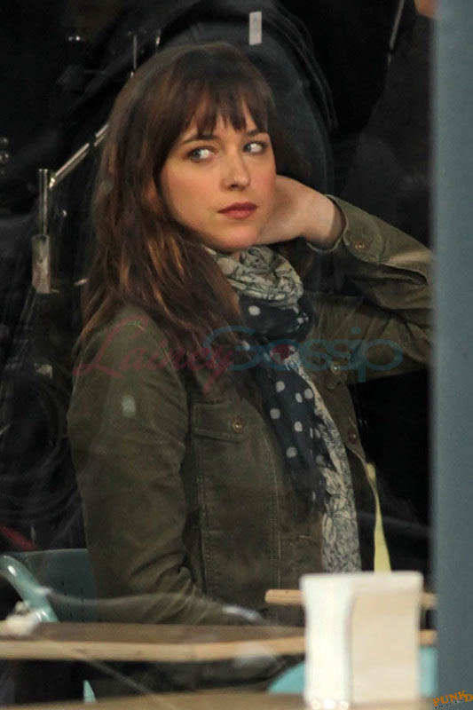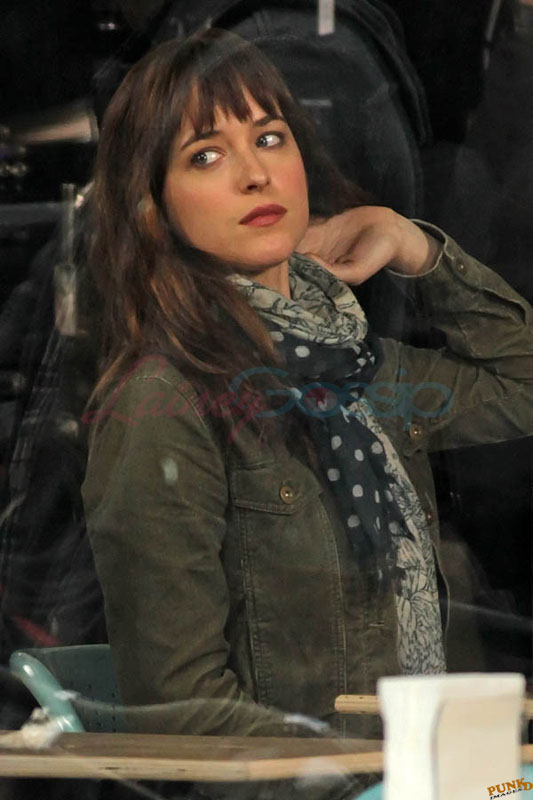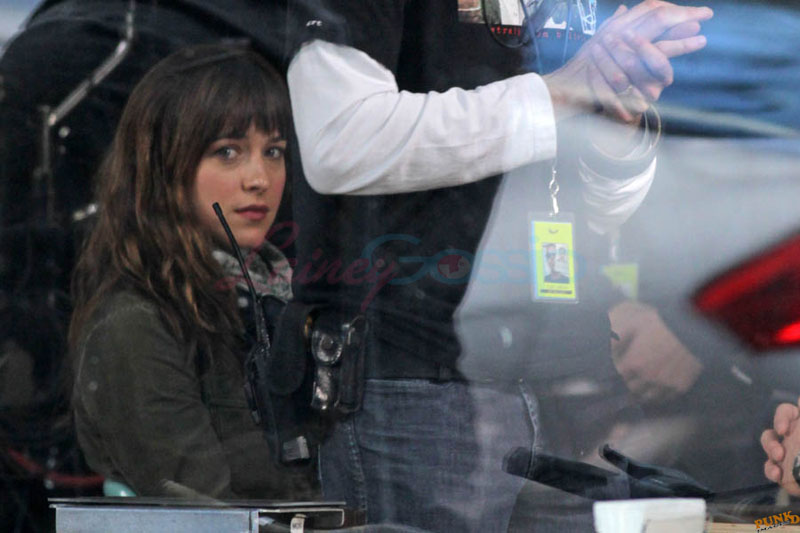 Joining Dornan on set – Dakota Johnson as Anastasia Steele. My first thought when I saw her in these photos, with the dark hair and the fringe…