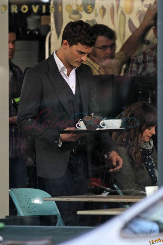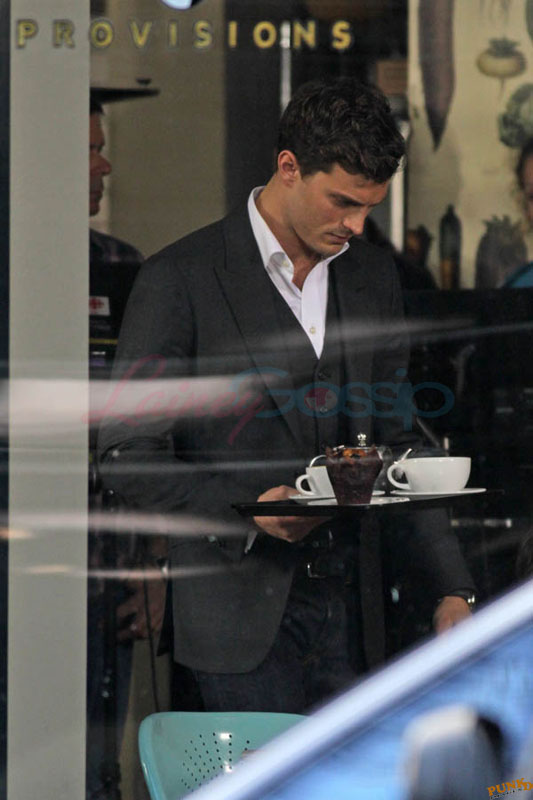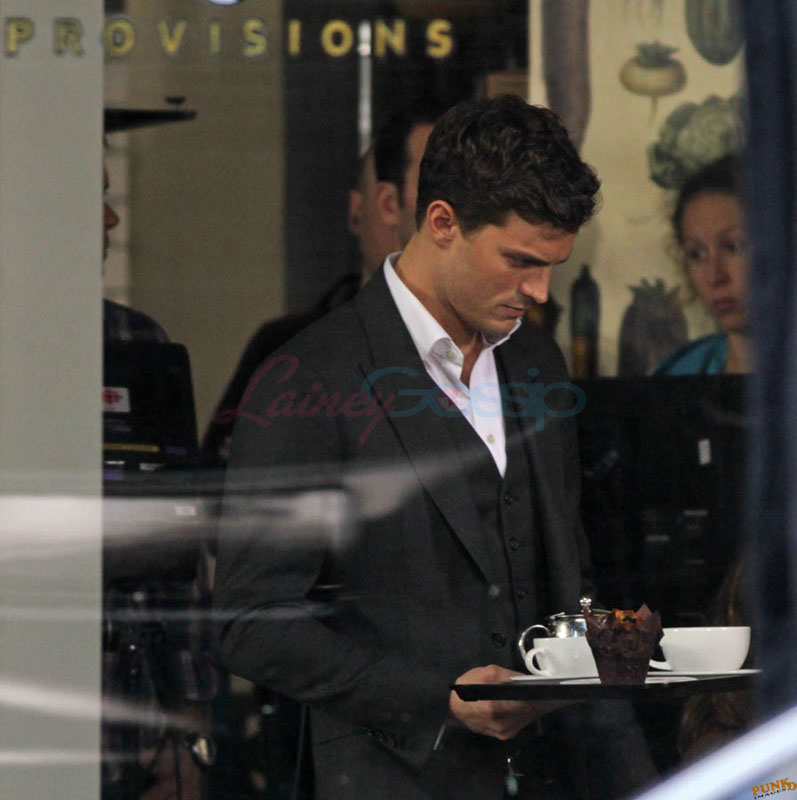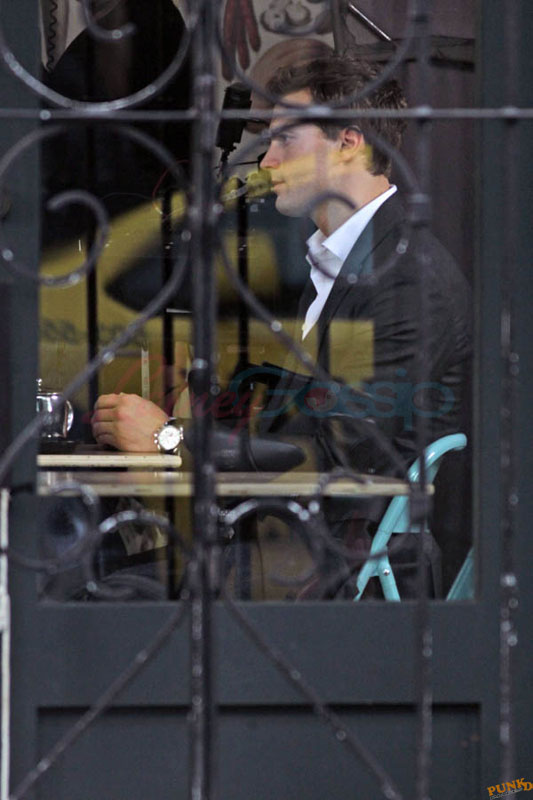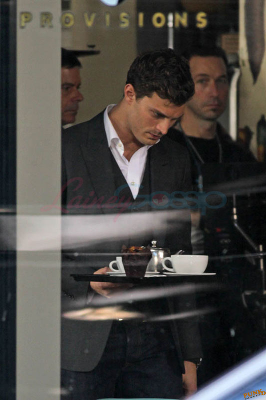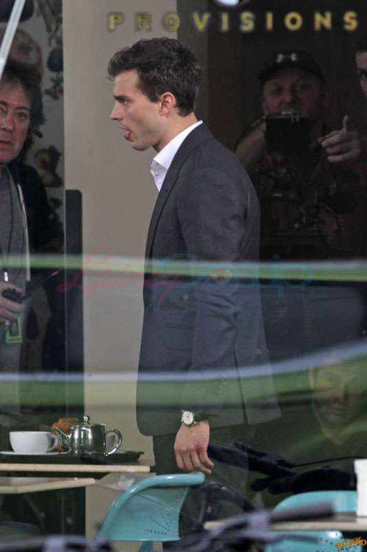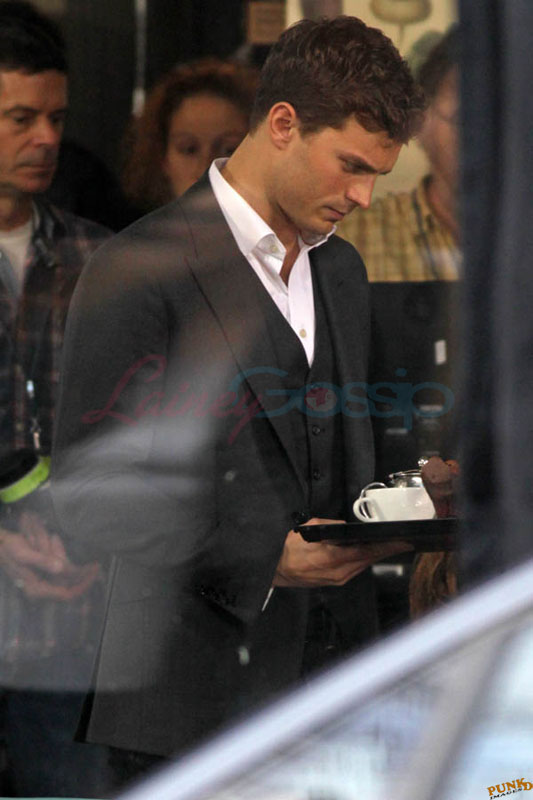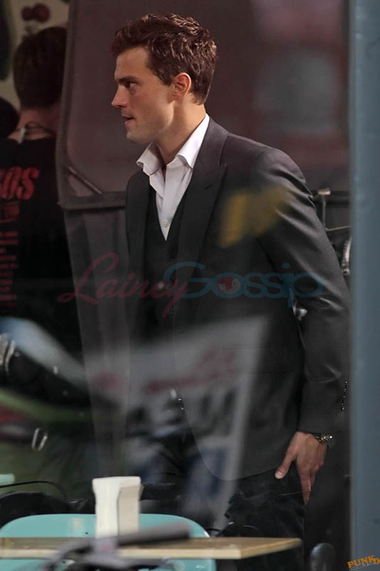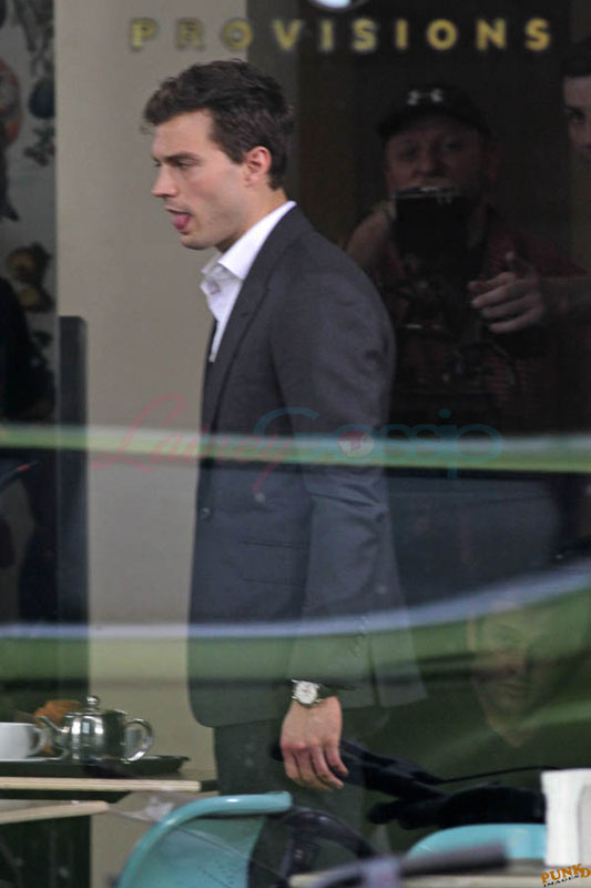 Principal photography on Fifty Shades Of Grey is now underway in Vancouver. Here’s Jamie Dornan in character as Christian Grey, who’s really just EL James’s reimagining of Robert Pattinson eating her out. So…how does Dornan look as Pattinson? Well, he looks really good. Better than the original.