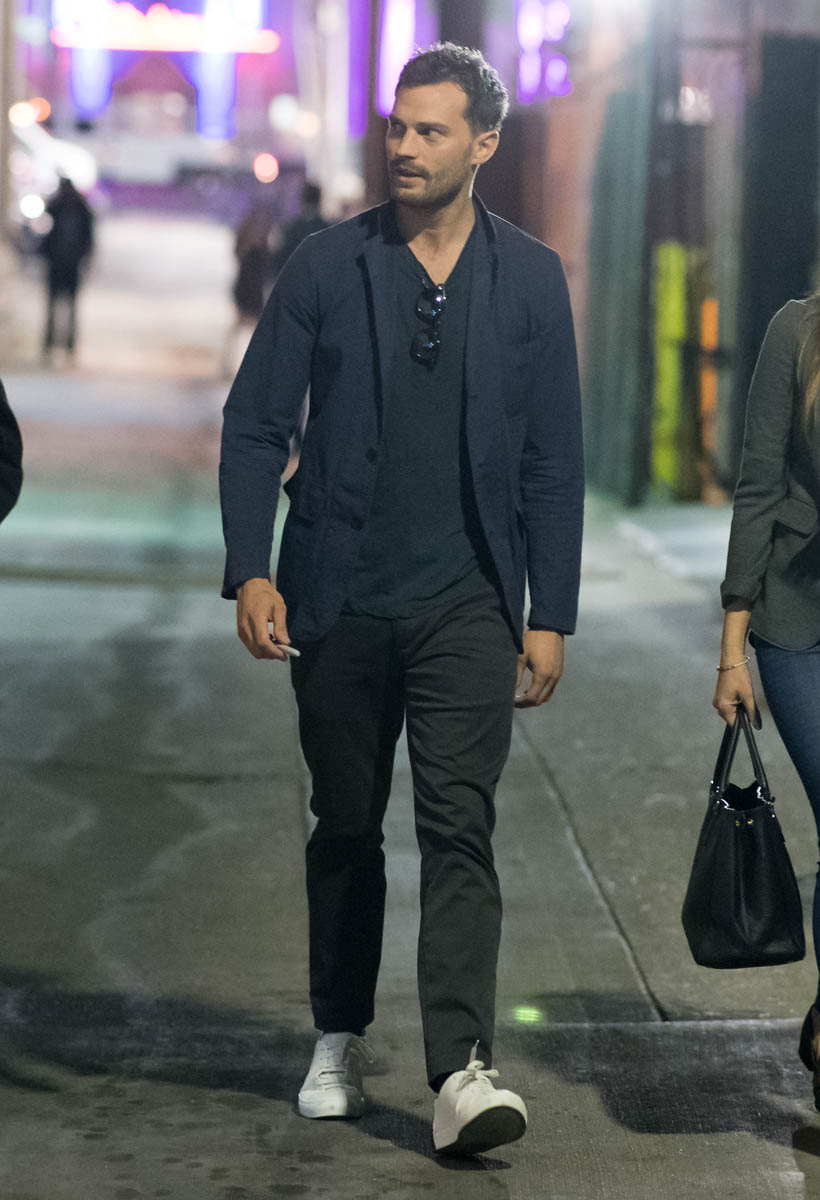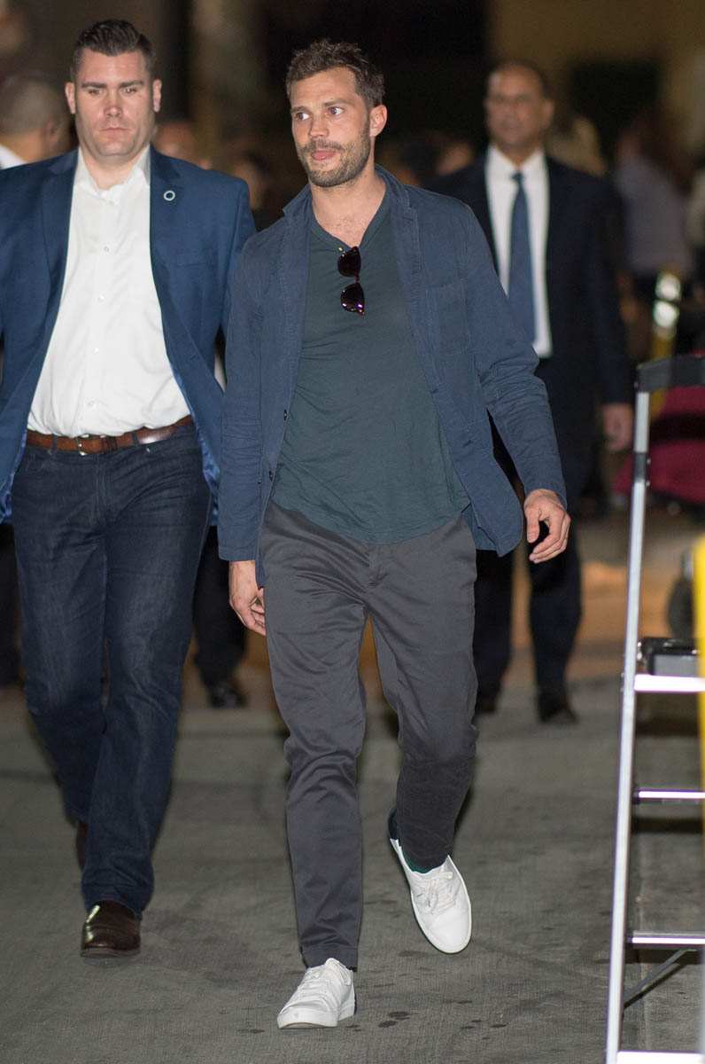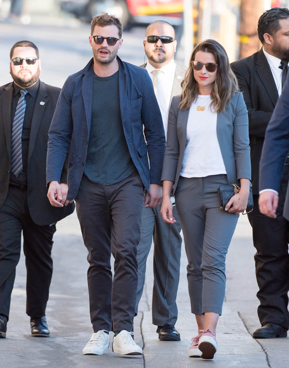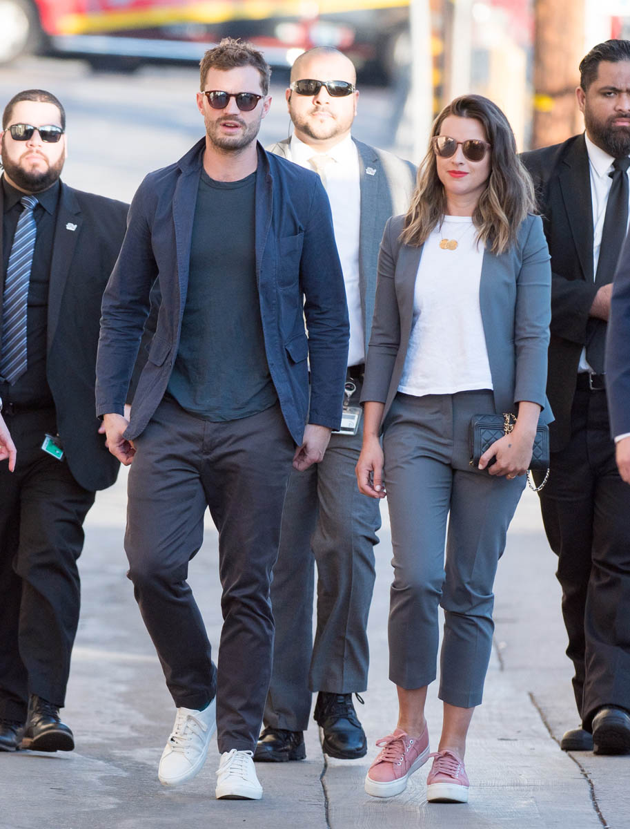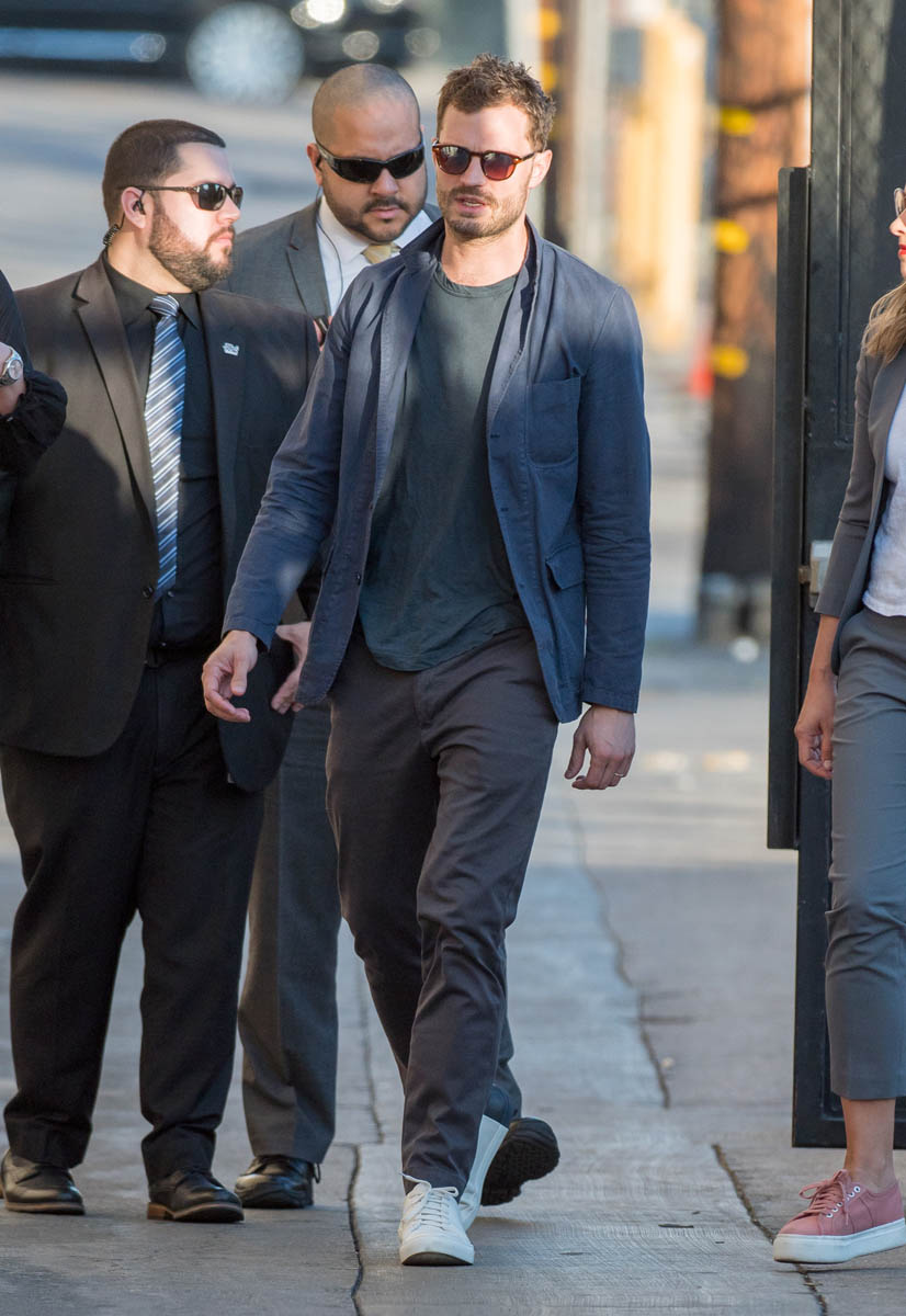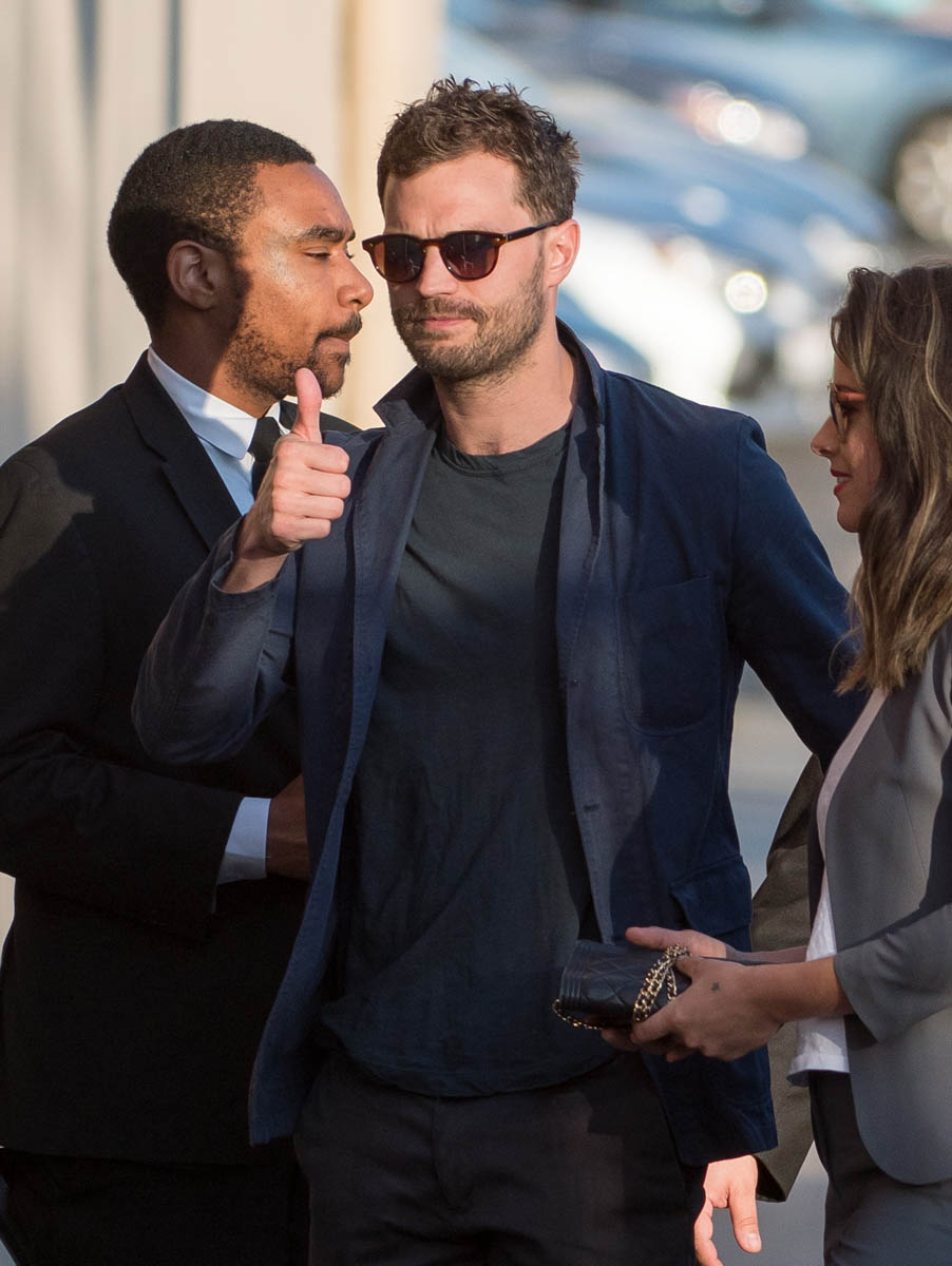 Remember the disaster that was the first Fifty Shades press tour? Back when they let Dakota Johnson and Jamie Dornan do press together, it was like watching two cardboard cutouts of human beings who like each other pretend to be actual human beings who like each other. It was worse than peak angsty R. Pattz and K.Stew era.“Unhorny” is how Lainey described their first joint appearance at the 2015 Golden Globes. So, the studio realized that Dakota Johnson and Jamie Dornan have absolutely no chemistry (it shows on screen almost as much as off) and they smartly stopped putting them together. So far this press tour, I’ve only seen them appear separately. Dakota was at the Globes solo. Jamie was on Ellen and Jimmy Kimmel Live recently, selling this crappy movie on his personality alone. Bless his heart. He’s actually smiling this time. He’s laughing. He’s trying. But still, every time he talks about this film, he seems uncomfortable. This is how he described sex scenes with Dakota on Kimmel:
