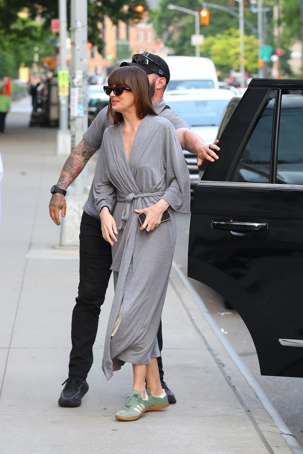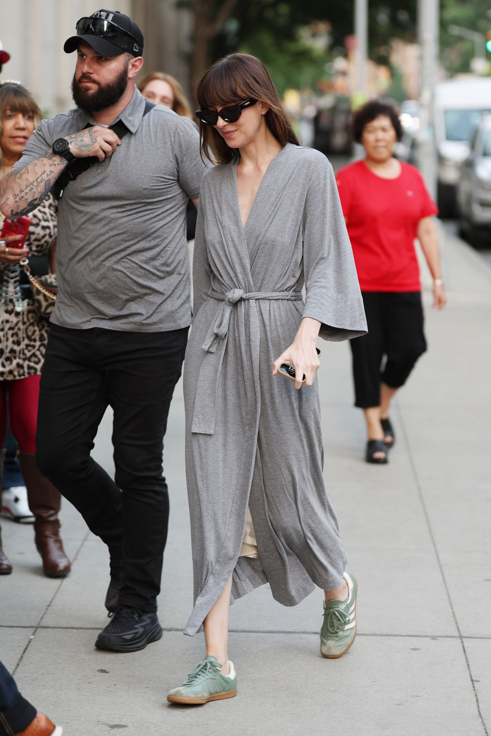But this time, Dakota is wearing a robe. A very soft-looking robe that looks super cozy and the perfect weight for summertime lounging, but a robe, nonetheless. Still, you can peep an ivory satin skirt under there, so I will bet anything she’s covering up a bridal look. This is a film about a matchmaker and a love triangle, after all, and that combined with Chris in a suit and the photo description placing these photos outside a “clerk’s office” spells wedding dress. Anyway, Maria, any leads on cozy lightweight summer robes?