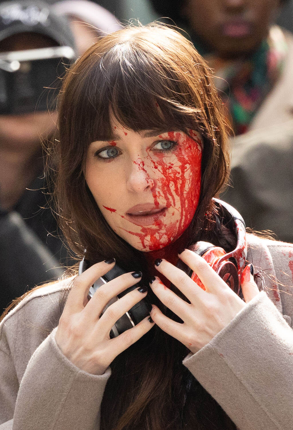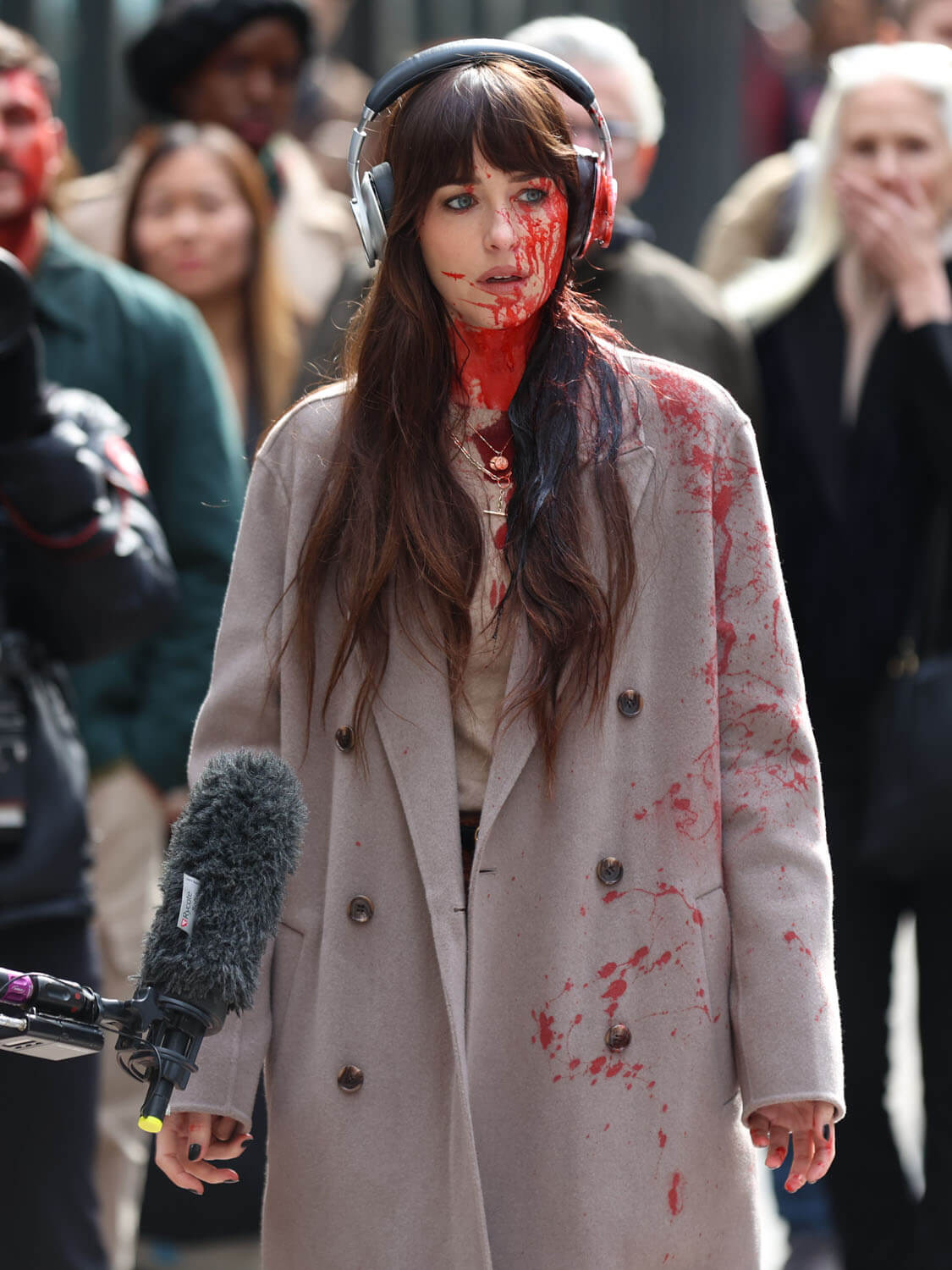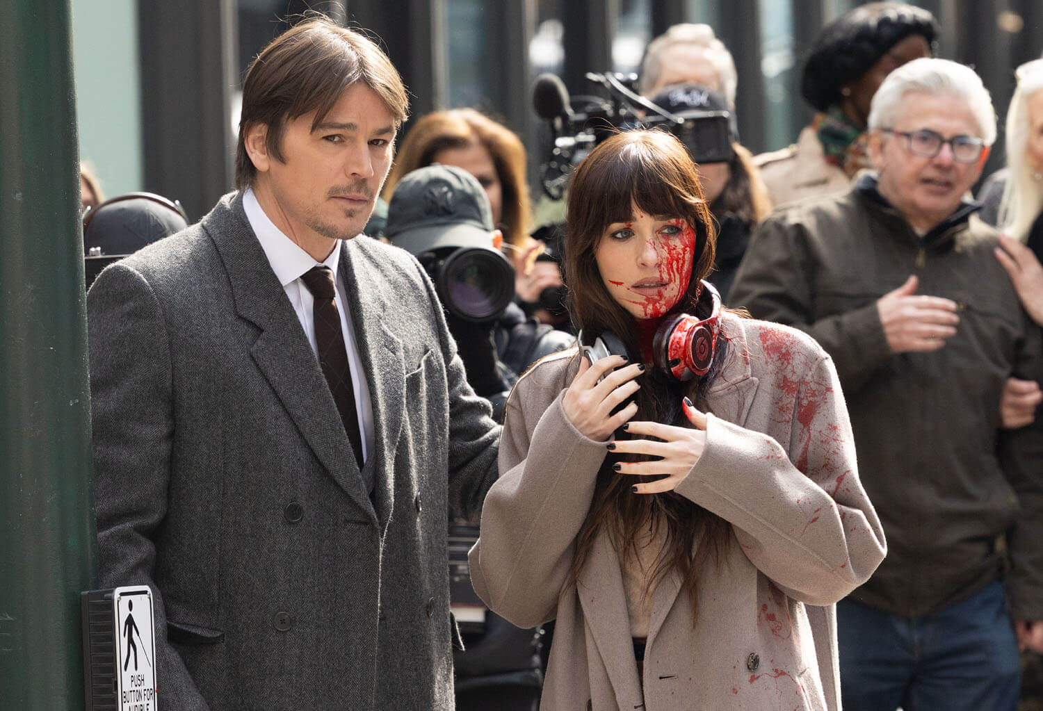 A couple weeks ago, Lainey wrote about Anne Hathaway filming Verity, the newest Colleen Hoover adaptation being thrust upon us, noting how “glamorous and elegant” Annie looks in character. Well, Dakota Johnson was seen filming a scene for Verity, and she looks distinctly less glamorous and elegant, mainly because of all the blood. It’s some kind of accident scene and Dakota’s character is sprayed with blood. Josh Hartnett’s character is there, too, whisking her away from the action. I don’t read Colleen Hoover books, and this is not making me want to, but I am super into a movie that uses real blood effects. On-screen blood is another casualty of CGI, and I like to see good old fashioned dyed corn syrup put to work.