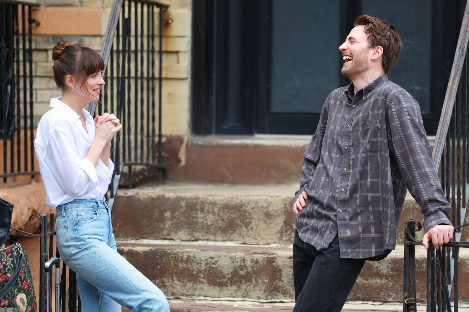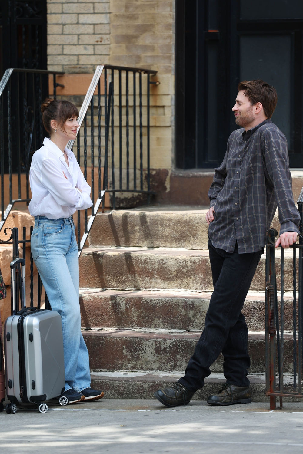 Dakota Johnson is back on the set of Materialists in New York, rocking new outfits for Maria to source. One should be easy, it’s just classic jeans and a white button down, the epitome of “Ralphcore”, as far as I’m concerned. I recently got a new white button down from The Gap, which is the most perfect button down I’ve had in a while. I feel like The Gap fell off for a minute, chasing fast fashion, but maybe Zac Posen is bringing a sense of quality and construction back to the brand, because this shirt is somehow crisp and soft and lays perfectly.
