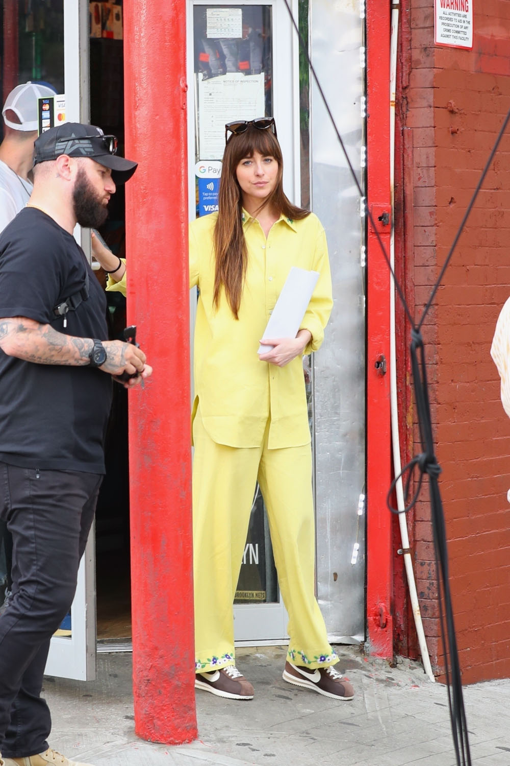 But Dakota also sported a bright yellow, embroidered fit that might be harder to place. I loved Maria’s point yesterday about the reason everyone is so into Dakota’s wardrobe around this film is because it’s accessible, and though this suit is a little more outré, I still think it fits into that category. It’s just bright. Just pick a bright color that flatters you and go all in. It’s also little beachy, maybe. It’s not “coastal grandma”, but there’s a slouchiness reminiscent of the beach, of relaxed porch vibes. We could call it “porchcore” to go with the Ralphcore. I’m just waiting for the day when we get to corecore and the universe swallows itself.