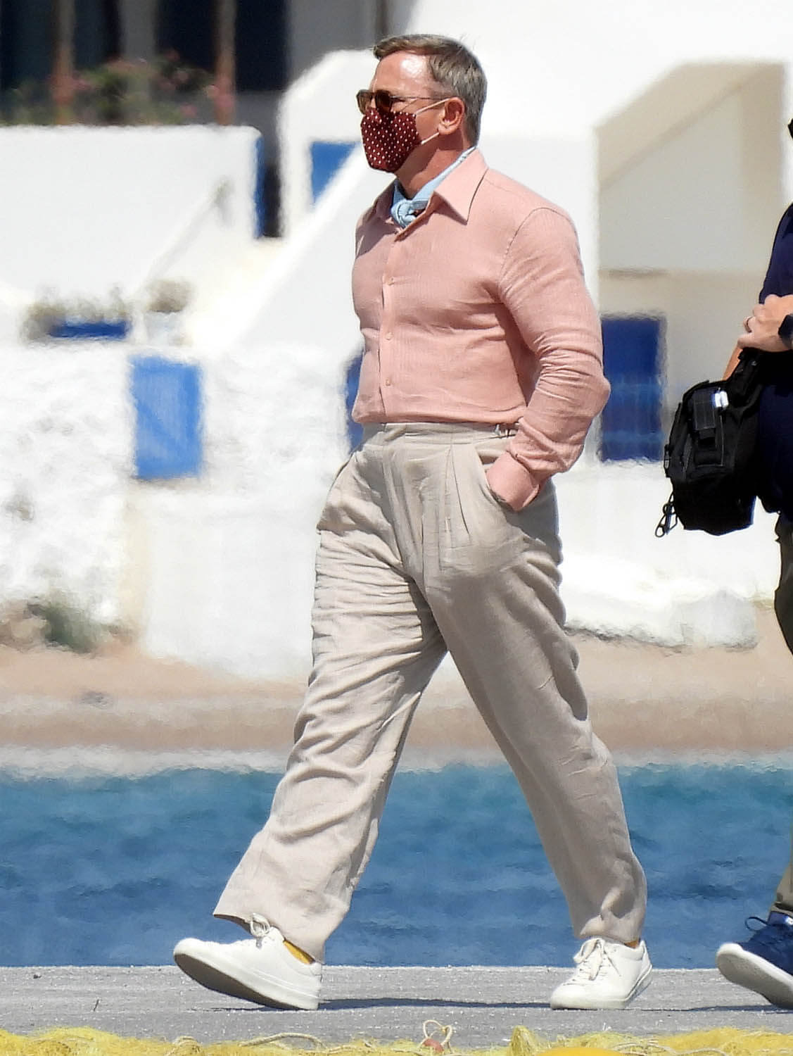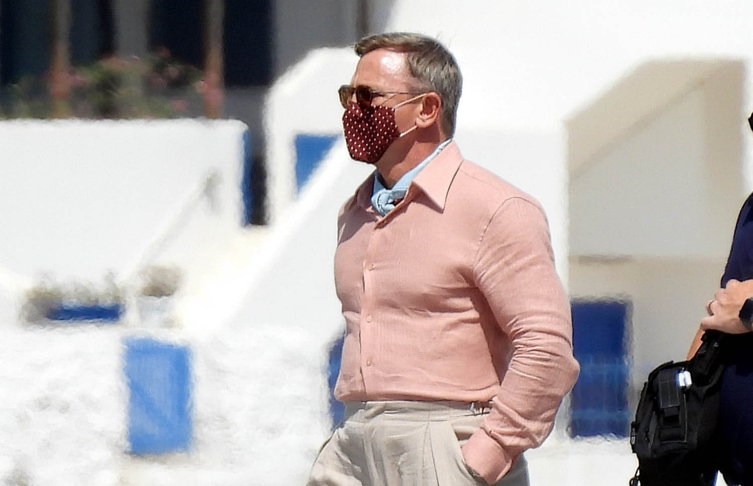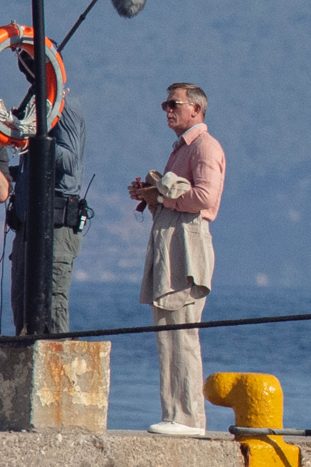 Here’s Daniel, in costume as Detective Benoit Blanc, on set in Greece this week with Dave and Kate. I already love what I’m seeing here. I love what Dave is wearing, the Euro styling of his clothing, and since we don’t have a sense yet of who exactly these characters are, by the way he’s dressed, it could be that he’s some cheesy rich dude which I’m all the way down for.