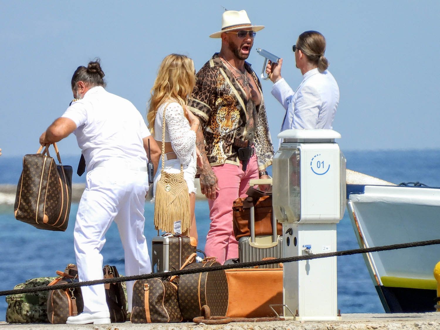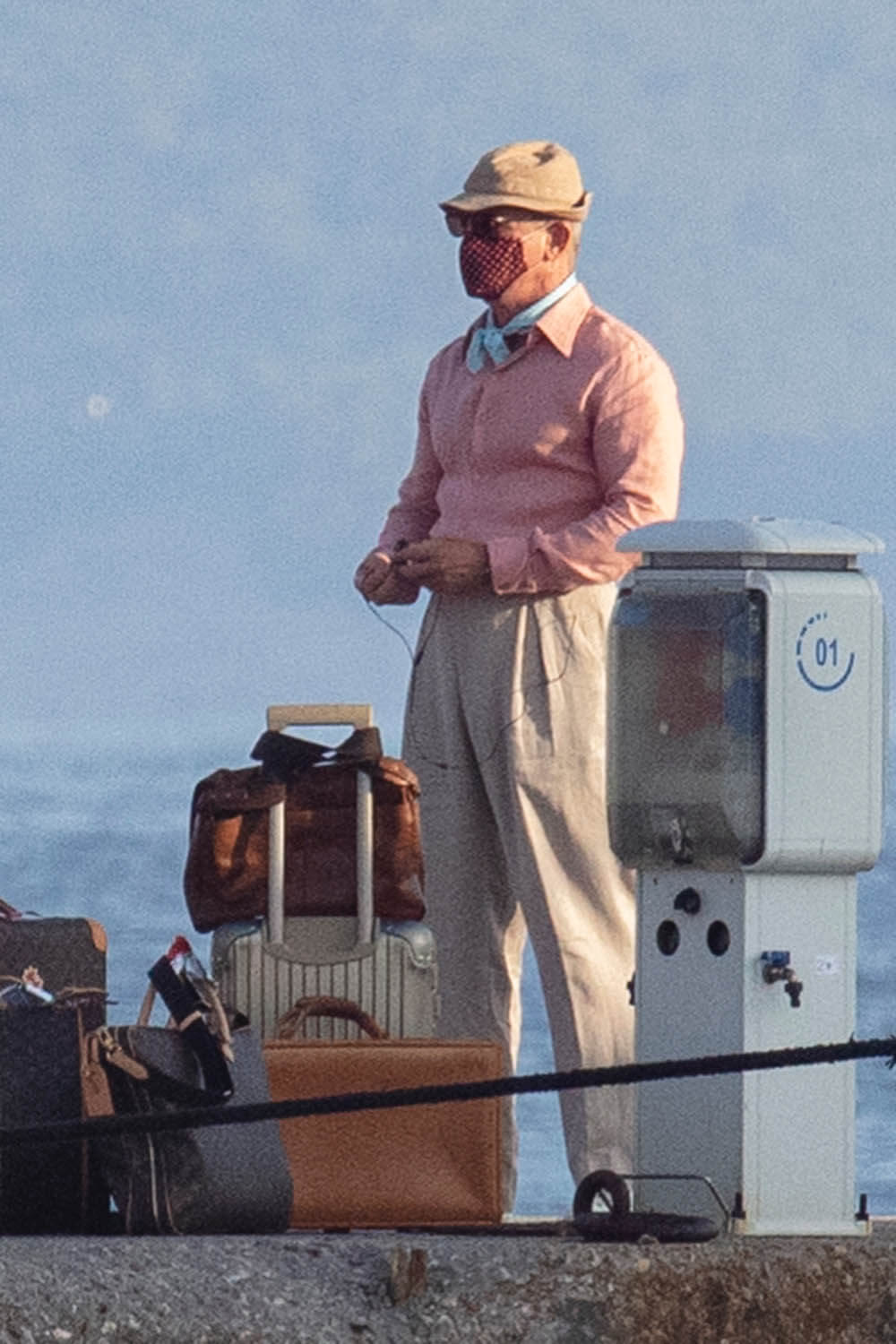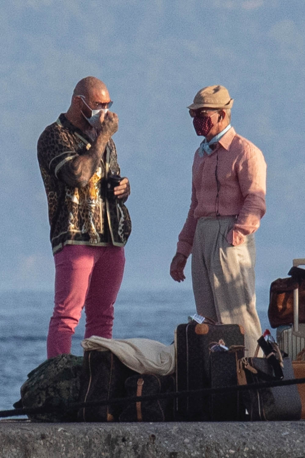 Here’s Daniel, in costume as Detective Benoit Blanc, on set in Greece this week with Dave and Kate. I already love what I’m seeing here. I love what Dave is wearing, the Euro styling of his clothing, and since we don’t have a sense yet of who exactly these characters are, by the way he’s dressed, it could be that he’s some cheesy rich dude which I’m all the way down for.
