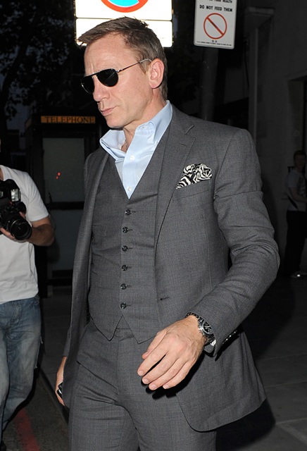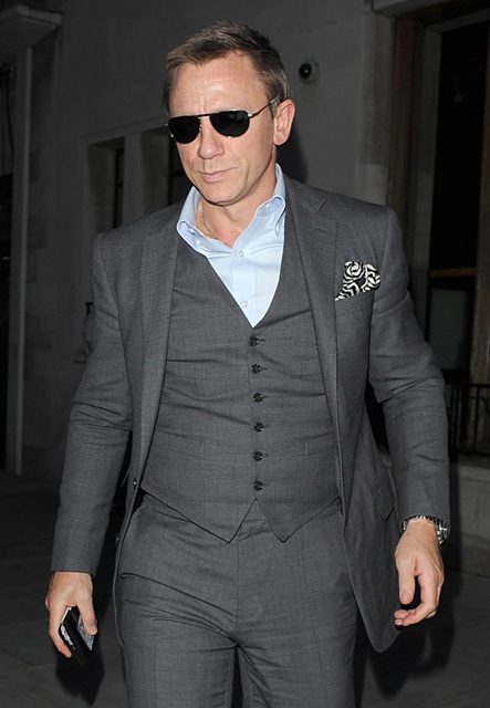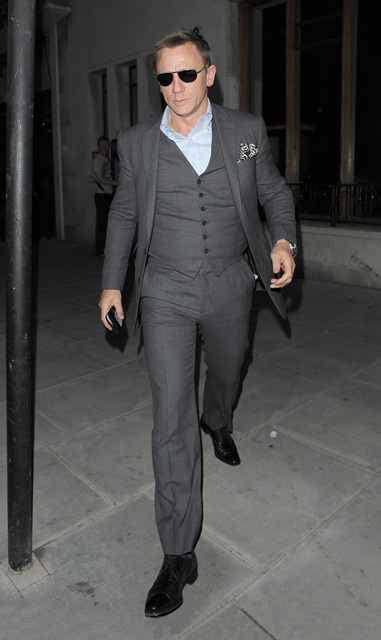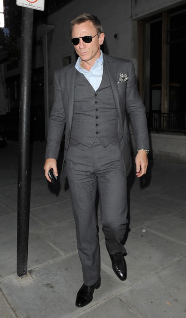 Last night in London, Daniel Craig smartly dressed, hitting up an ATM in St Johns Wood. You know I’m all over him in a suit. But training for his third Bond hasn’t started. So… he’s probably not as lean as he has been. I’m just saying it looks a bit tight.