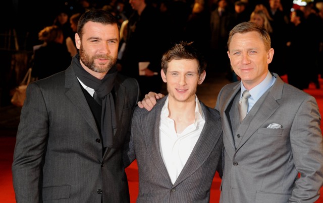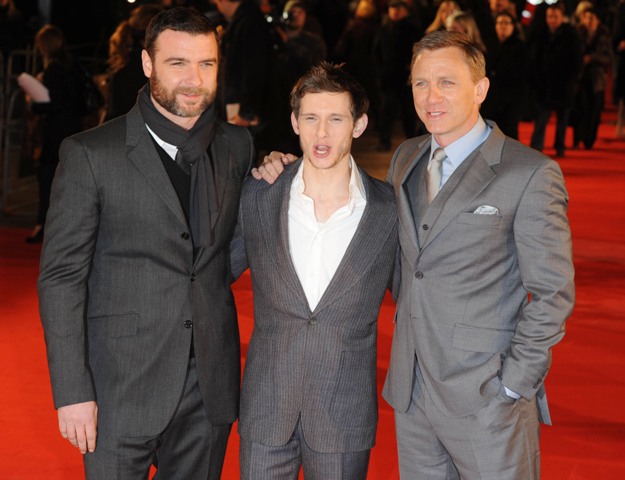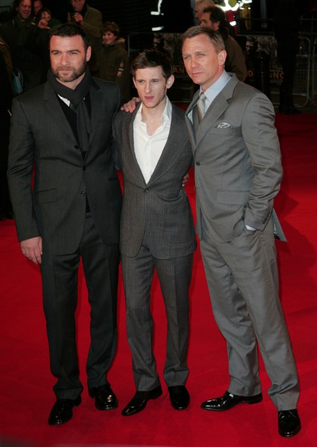 At the premiere of Defiance tonight in London – Daniel Craig, fresh off his sunny holiday with Satsuki on the beach, looking rested and tan and as usual filling out his suit beautifully. But also new dad for the second time Liev Schreiber – am a fan – and Jamie Bell too. Love Jamie Bell. Too bad he doesn’t get much play. Is it because he’s so little?