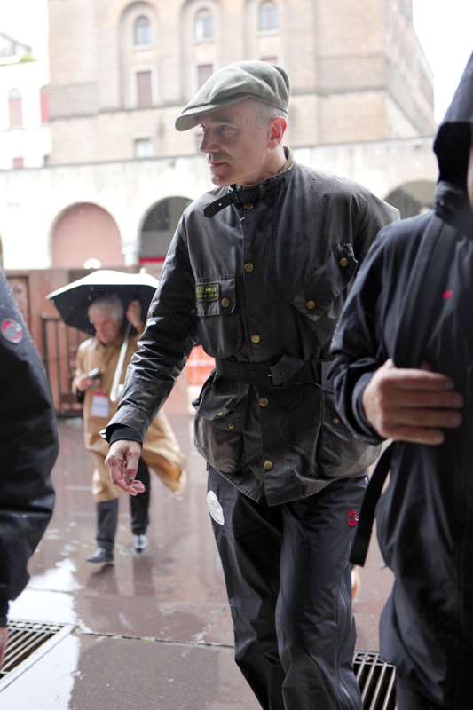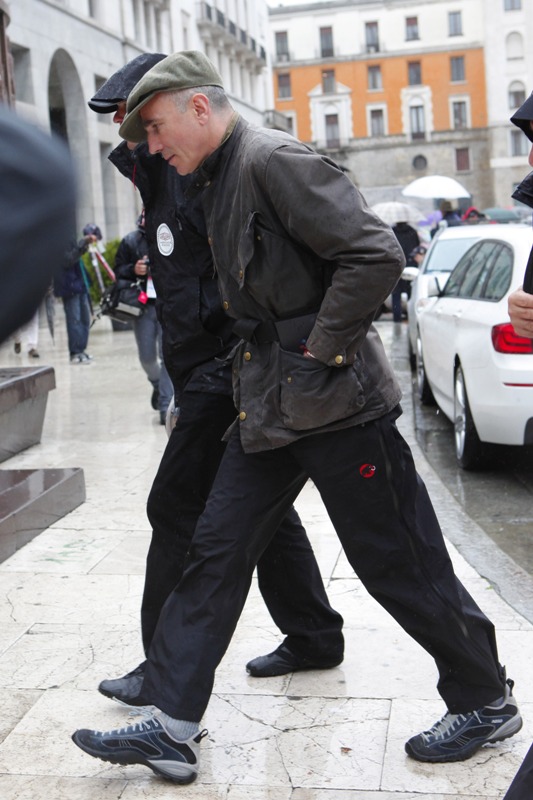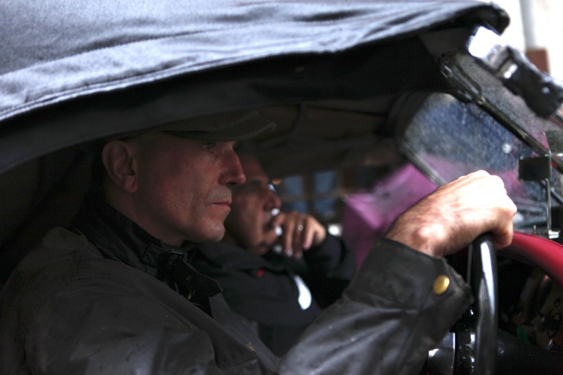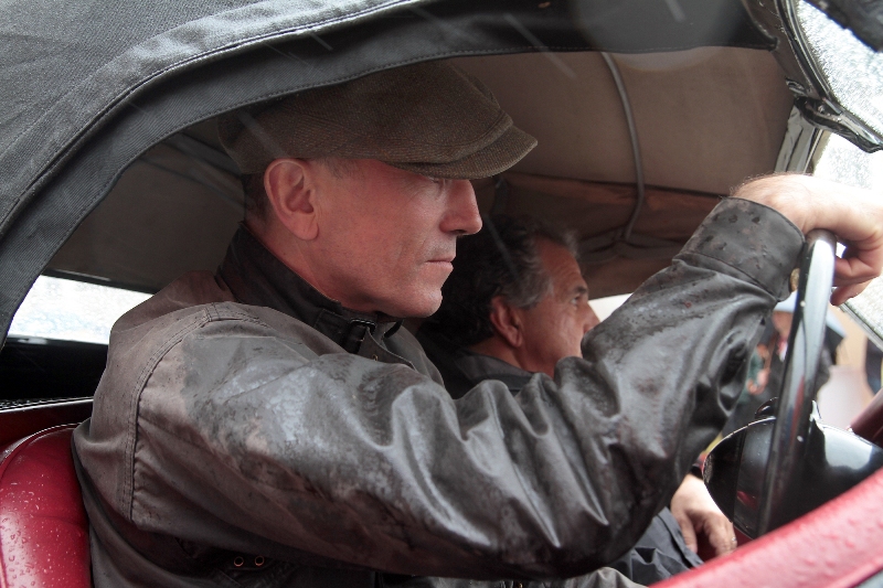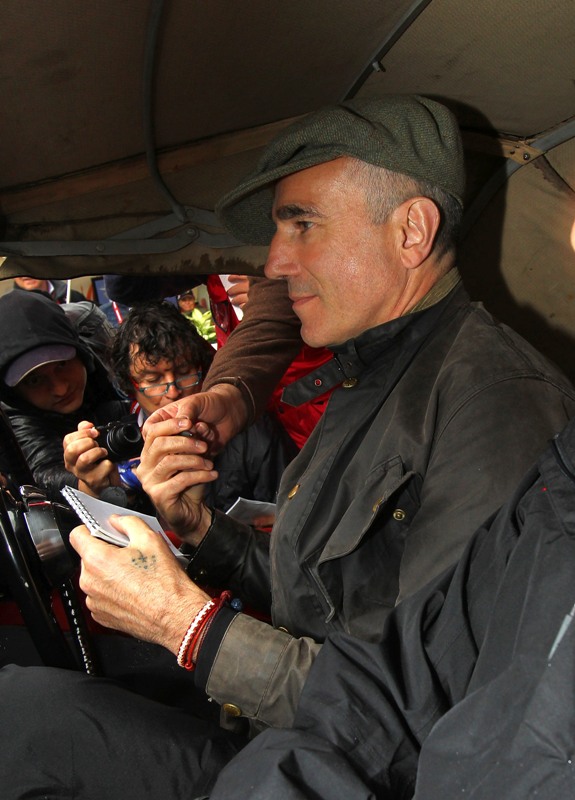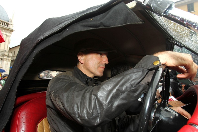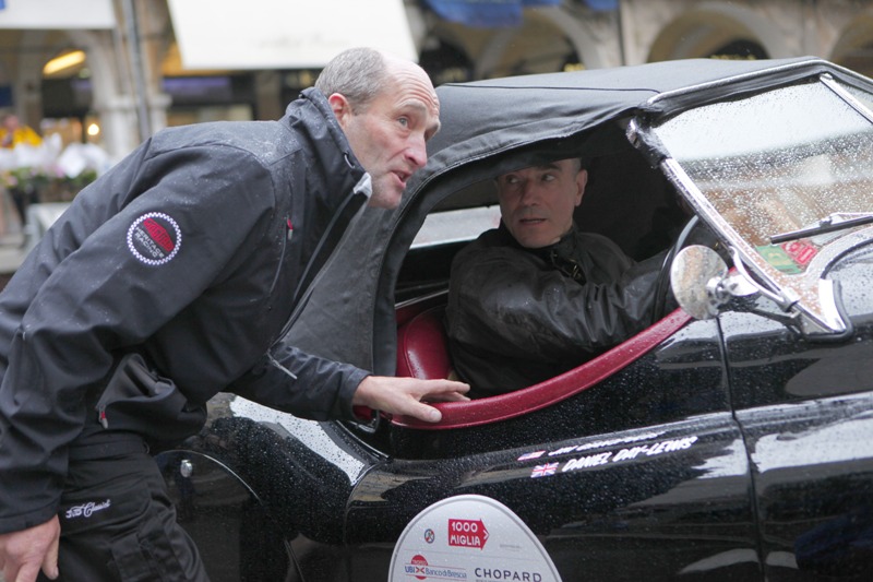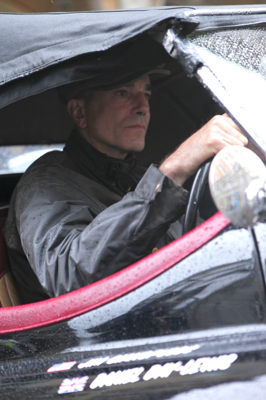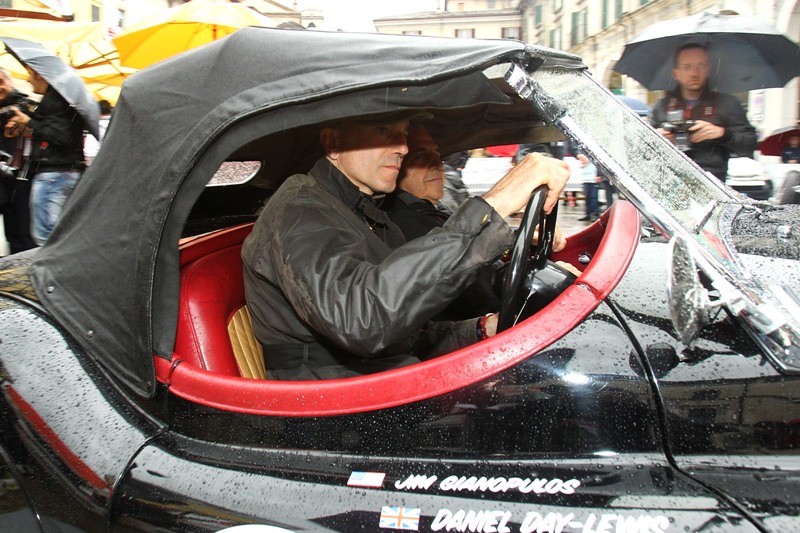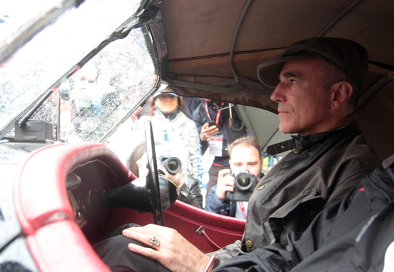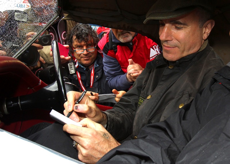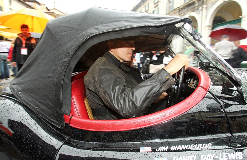 Daniel Day-Lewis was photographed in Brescia, Italy today for Mille Miglia, the iconic vintage cars road race through Italy -- 1000 miles in 3 days ending in Rome. He’s apparently driving a 1953 Jaguar XK 120. Do you sleep on the side of the road? Like, just pull over when you can't stop yawning anymore?