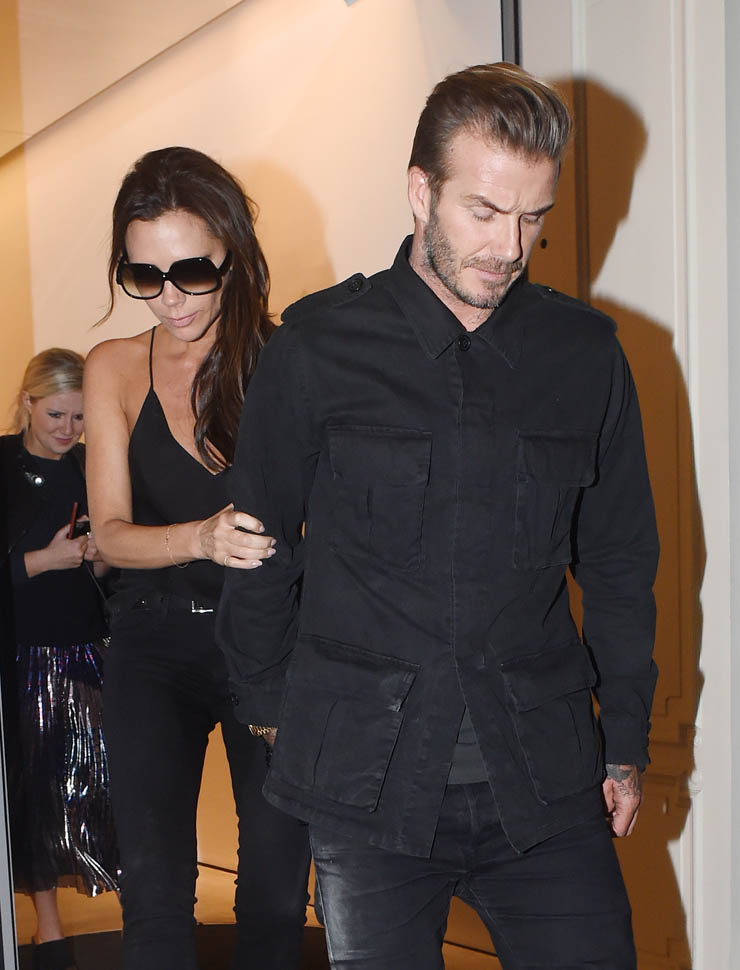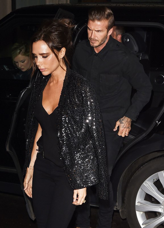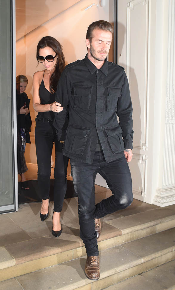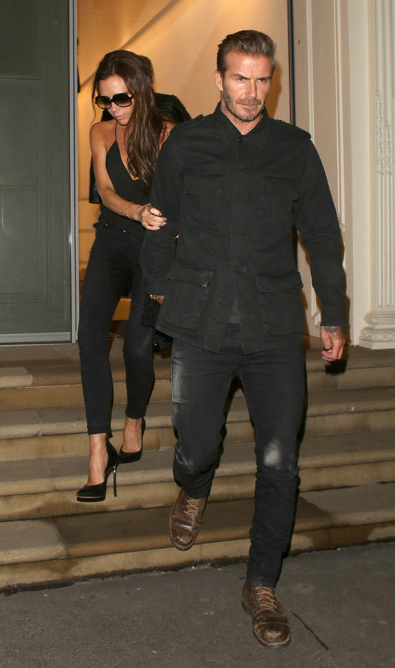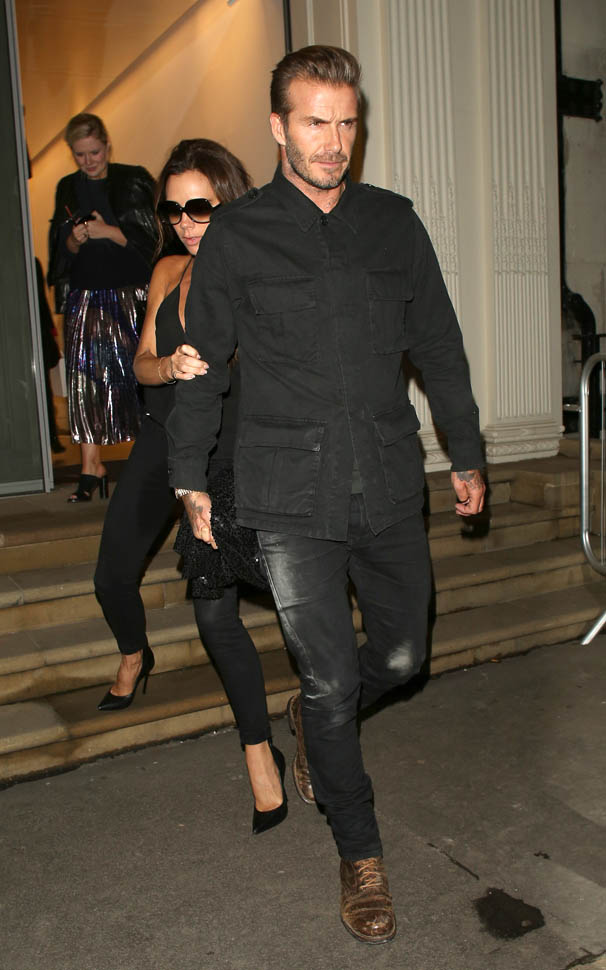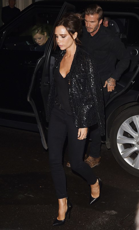 Victoria and David Beckham, along with son Brooklyn, attended a party last night to celebrate the one year anniversary of Victoria’s flagship store. I’m kinda into the fact that Posh didn’t overdress for this. Tank top, skinny pants, a sparkly jacket on the way in, no jacket on the way out.