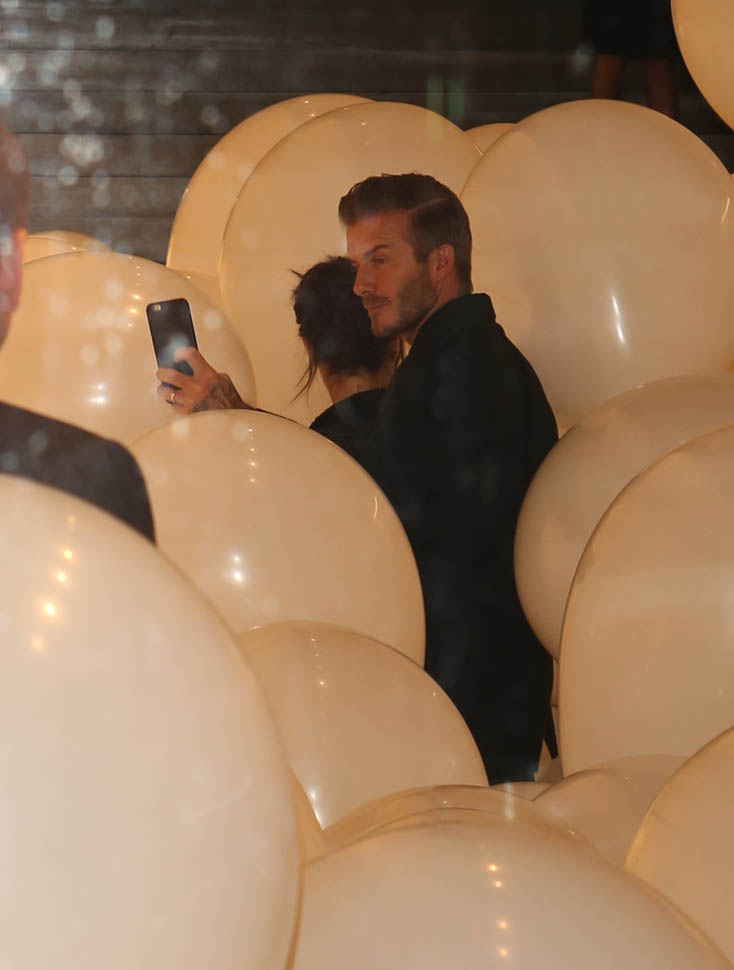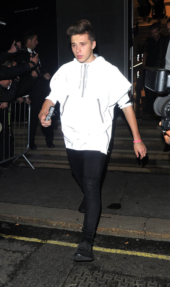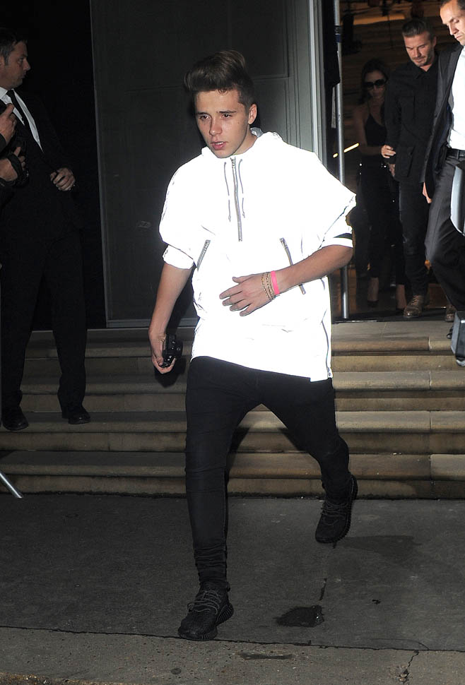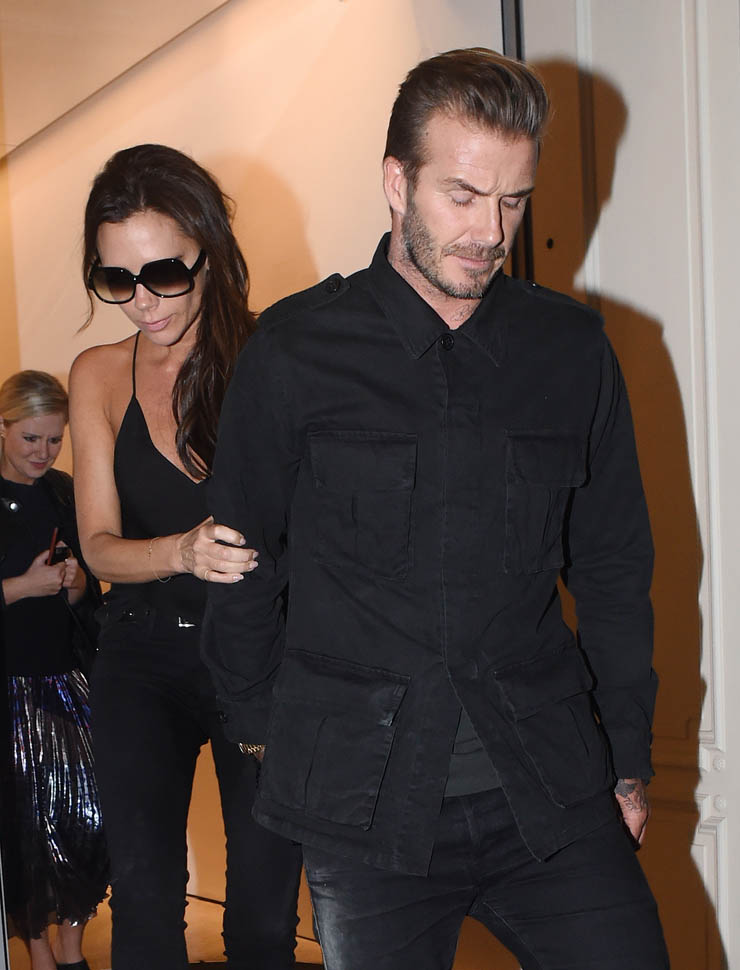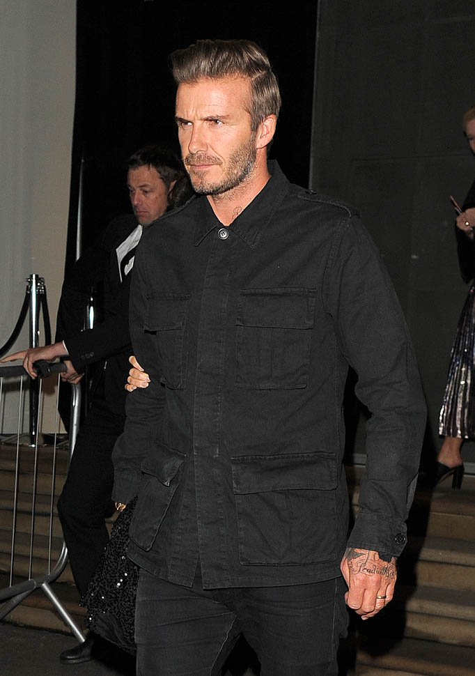 Victoria and David Beckham, along with son Brooklyn, attended a party last night to celebrate the one year anniversary of Victoria’s flagship store. I’m kinda into the fact that Posh didn’t overdress for this. Tank top, skinny pants, a sparkly jacket on the way in, no jacket on the way out.