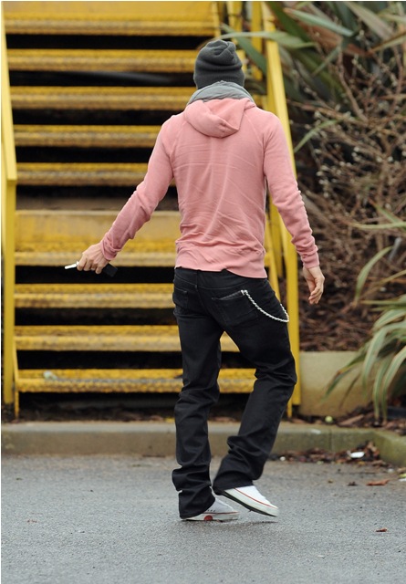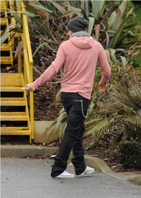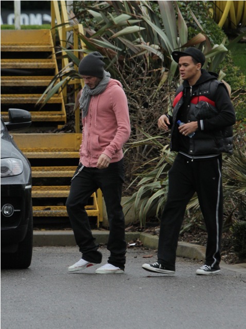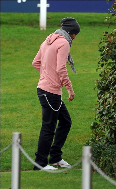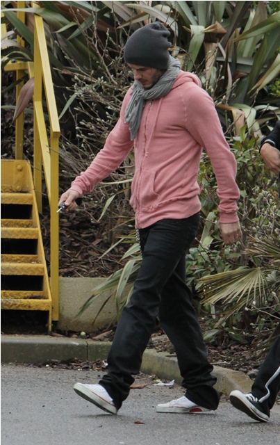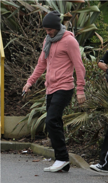 So, here’s David Beckham continuing to work out with Tottenham today. In a pink hoodie that fits him perfectly, that drapes around his shoulders perfectly, that falls to the waist perfectly, wearing black pants that hang just so, with the exception of the douche chain, and hemmed to the shoes at exactly the right length. I especially like the way it all comes together from the back view.