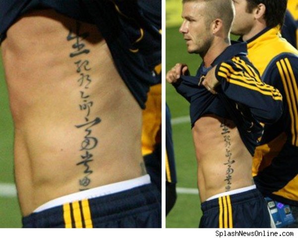 “The tattoo is written in traditional Mandarin Chinese and is an old Chinese proverb that says: "Death and life have determined appointments, Riches and honors depends upon heaven." David got the tattoo while the L.A. Galaxy were in Hong Kong for their pre-season tour of Asia.”