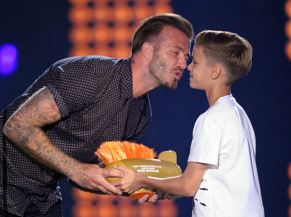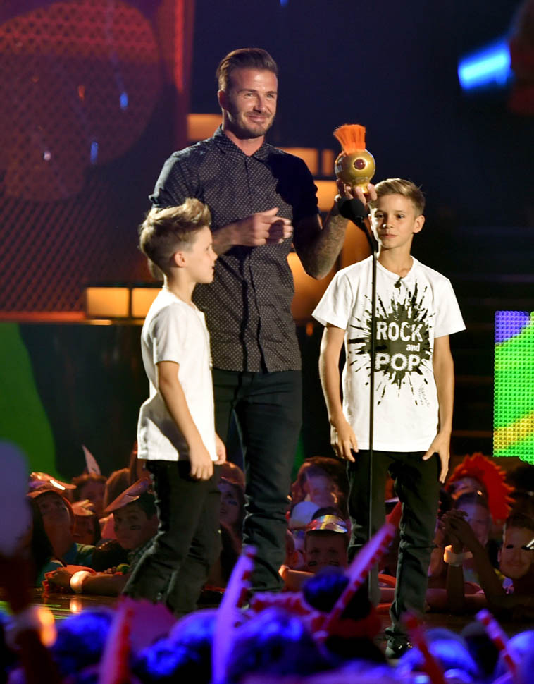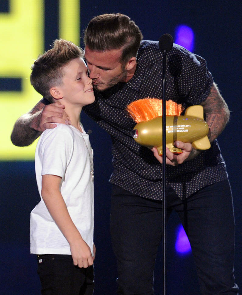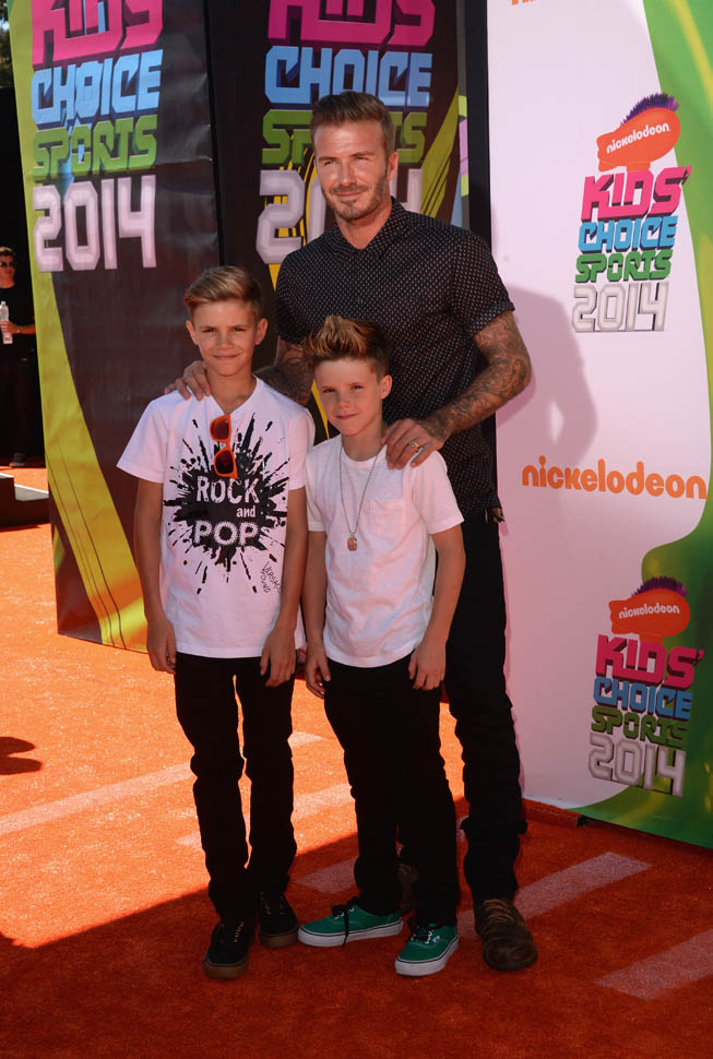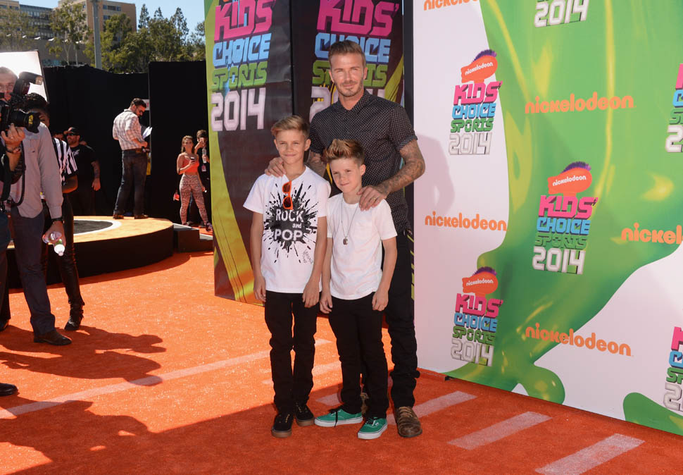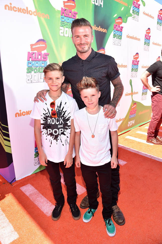 David Beckham was honoured – sort of – at the Nickelodeon Kids’ Choice Sports Awards last night in LA. He had his boys Romeo and Cruz with him. H7 is too young and Brooklyn, I guess, doesn’t want to be a “kid” anymore? I totally get that. But how cute is the hair? The Beckham boys family hair.