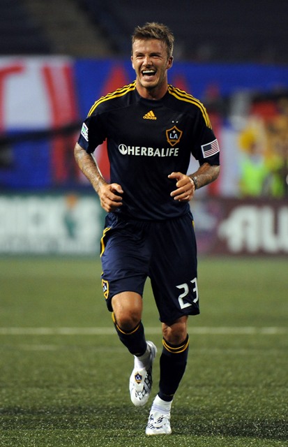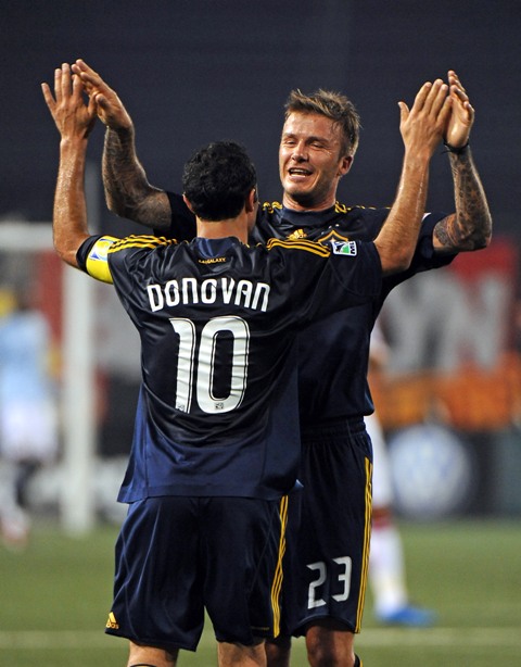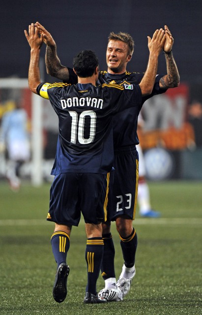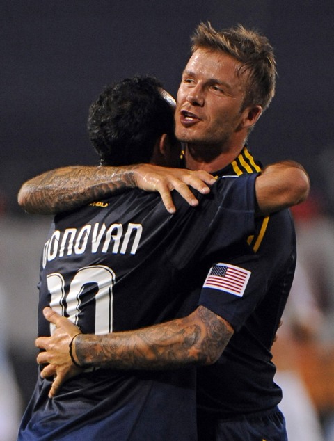 I love it when men hug in soccer. In Europe they always hug and rub each other on the head. Very erotic. Last year I wrote about Becks & Iker: A Love Story. Some of the best photos ever taken. Click here to see. And so this is Becks last night for the Galaxy vs the New York Red Bulls embracing teammate Landon Donovan, celebrating even though some woman in the crowd has a problem with how he smells.