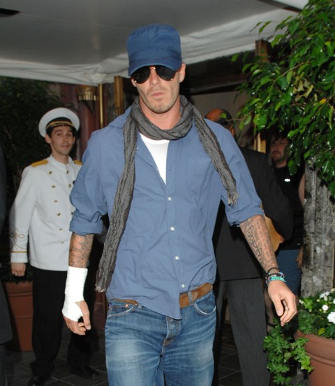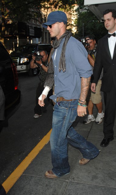 Didn’t see him at the CFDAs – maybe he was inside? – but this is David Beckham leaving his New York hotel, as quivering as ever, with an injured wrist that I’d be happy to help heal any time he needs me.