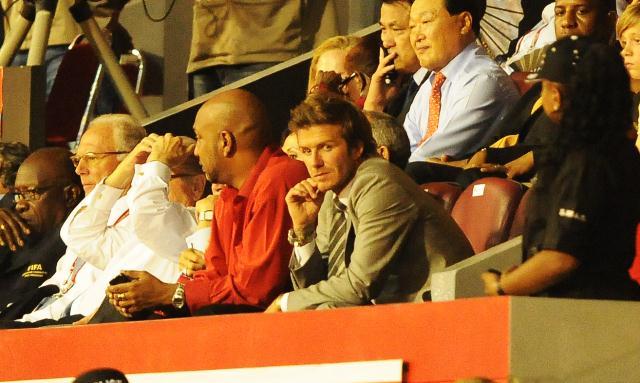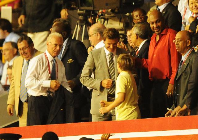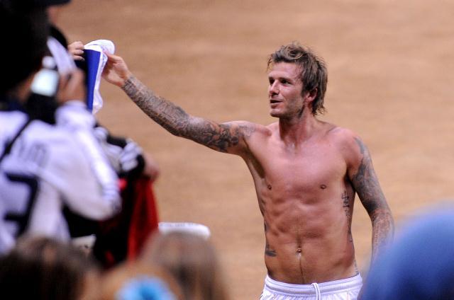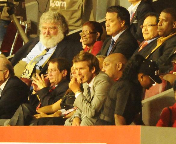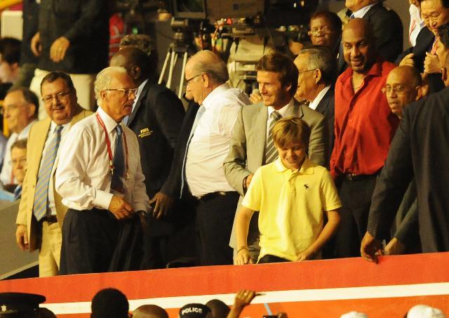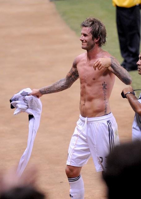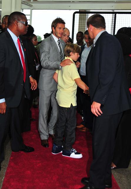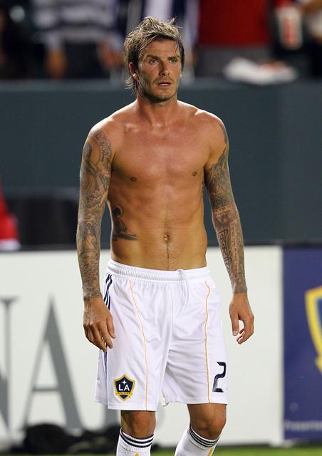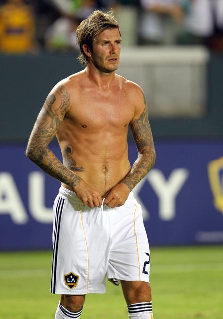 David did try to make us forget though. By being really hot and taking his shirt off playing for the Galaxy the other night and then the last couple of days, with son Brooklyn, promoting the football festival in Trinidad. He also really turned me on while reacting to a heckler the other day. The heckler yelled at him to stop messing around with hookers. Becks swung his penis around and fronted like he wanted to throw down. I don’t mind his voice so much when he’s getting all chestbumpy with it. Click here to watch.