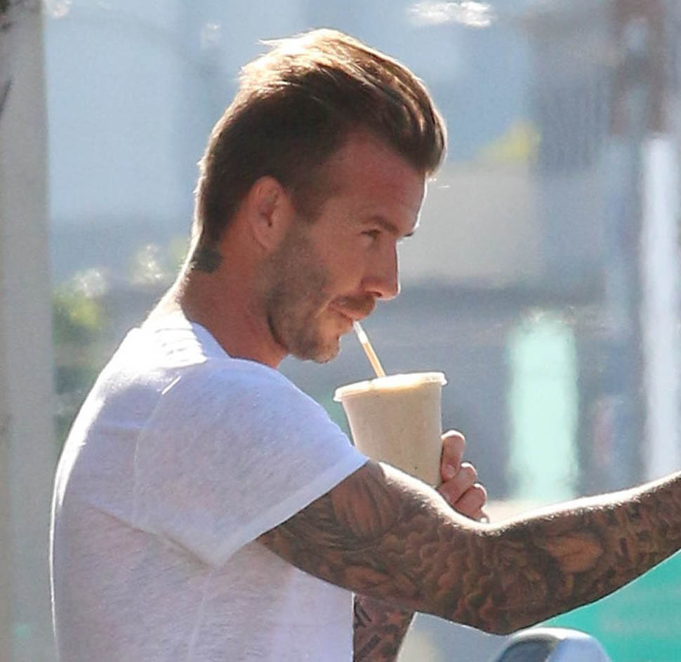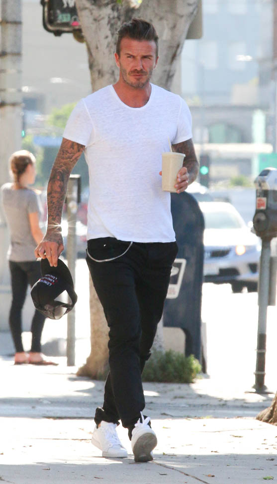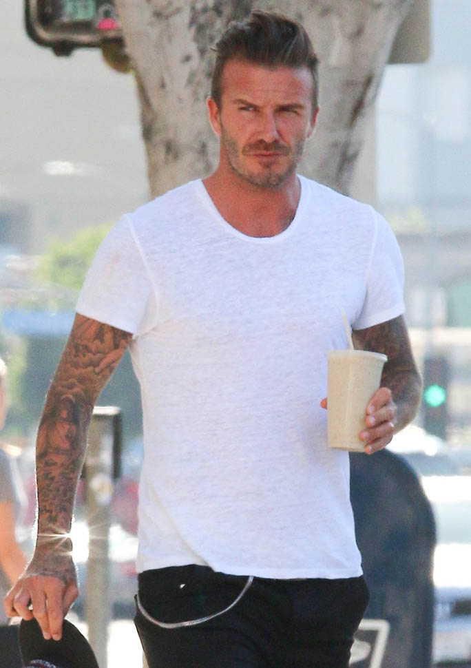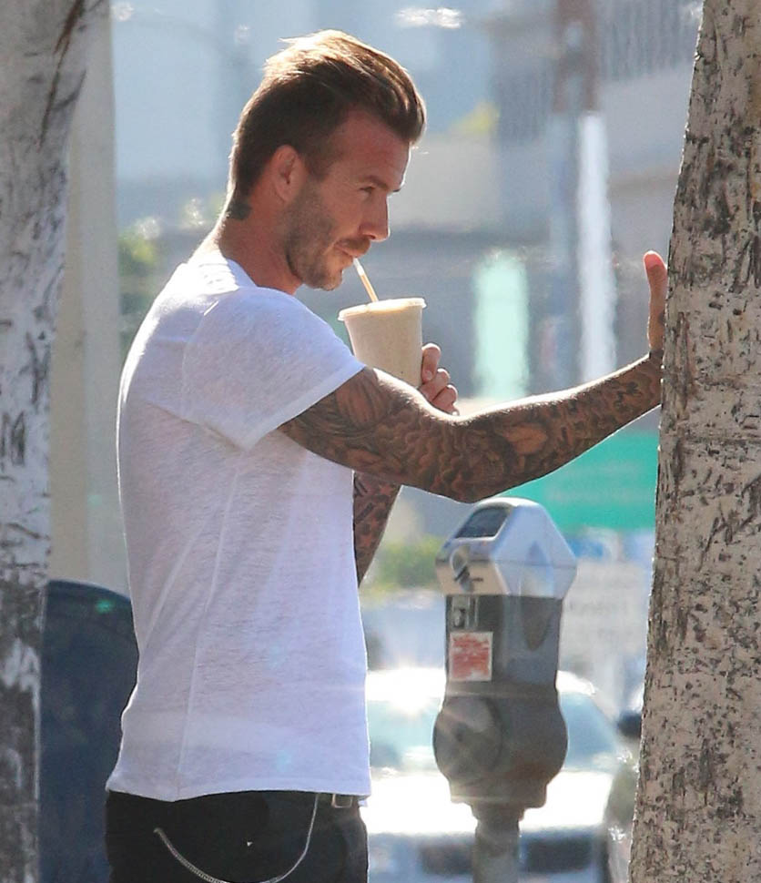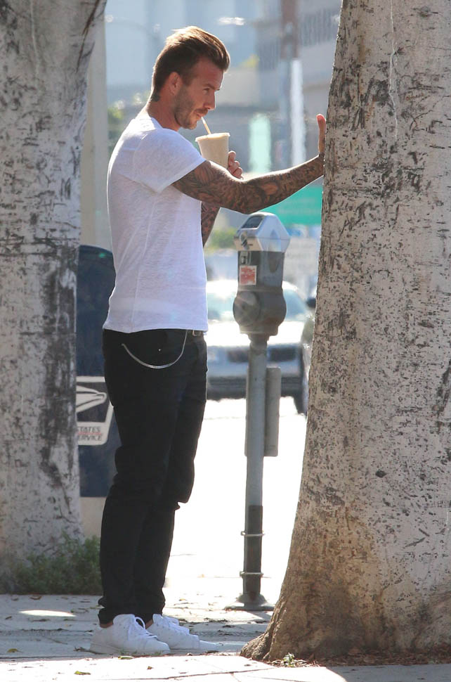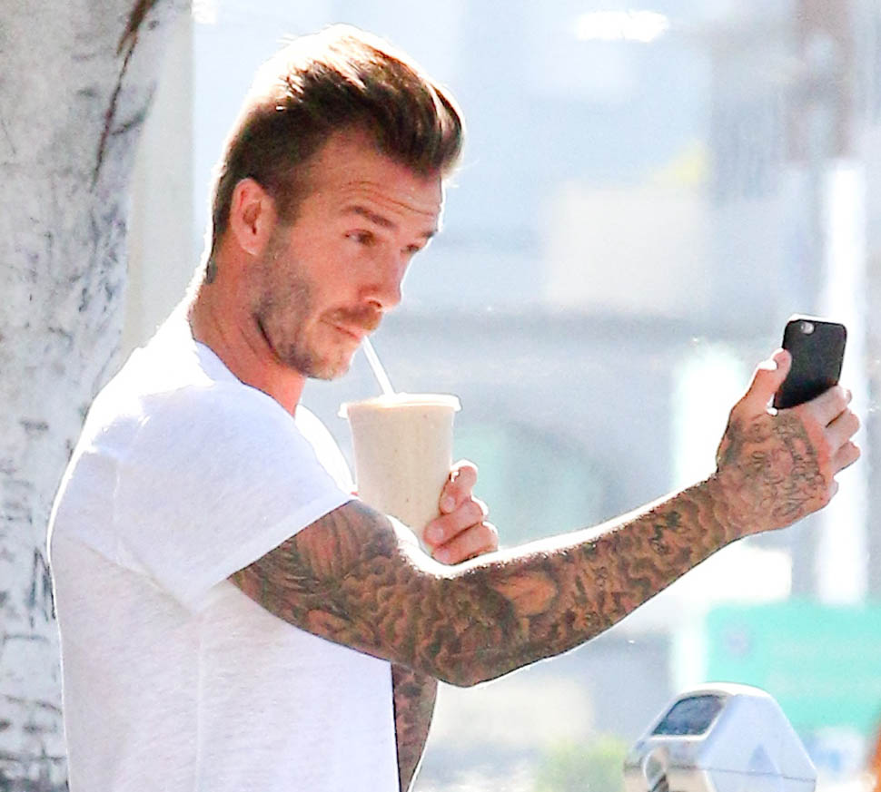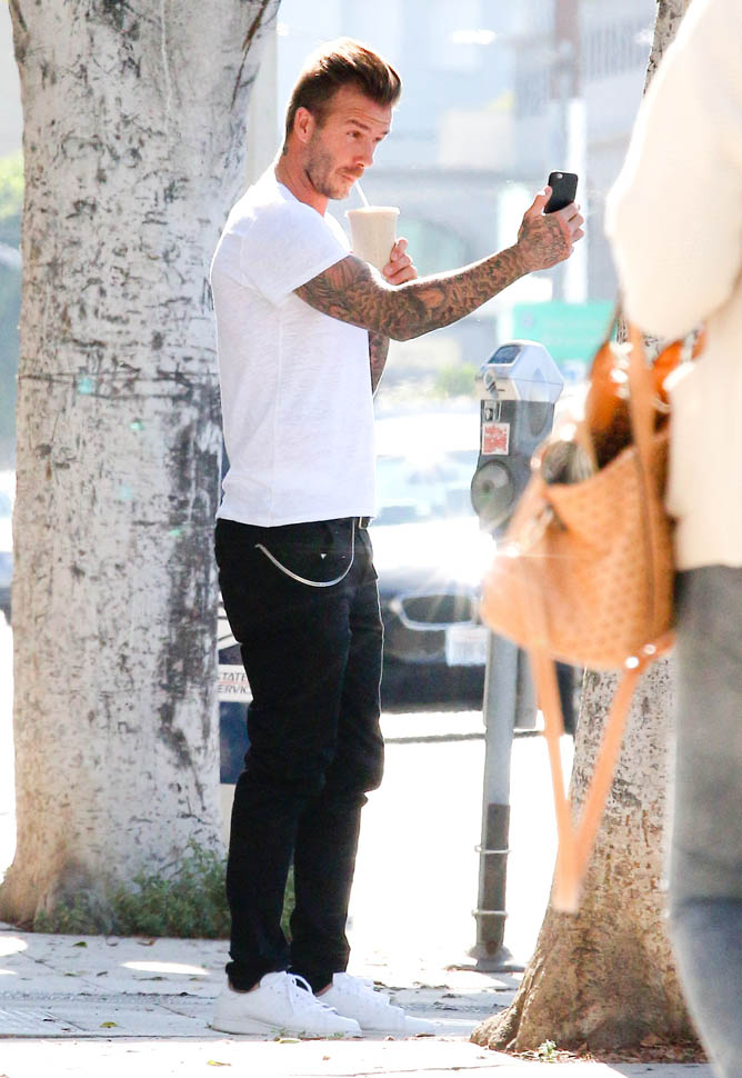 David Beckham was in West Hollywood yesterday, papped after getting a smoothie. And then he took a selfie. That’s the thing about selfies, right? You might look good in the actual selfie. But no one looks good while they’re taking a selfie, especially from the outside, especially when you’re using a selfie stick. You can be the coolest motherf-cker ever. You can be Samuel L Jackson in Pulp Fiction, but you’re not looking cool using a selfie stick. The selfie is the signature move of Try. And Try is the antithesis of Cool.