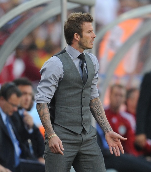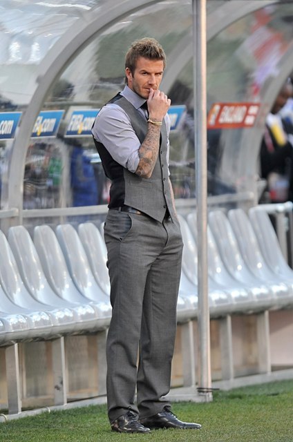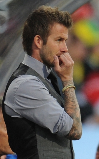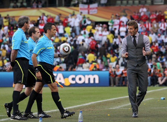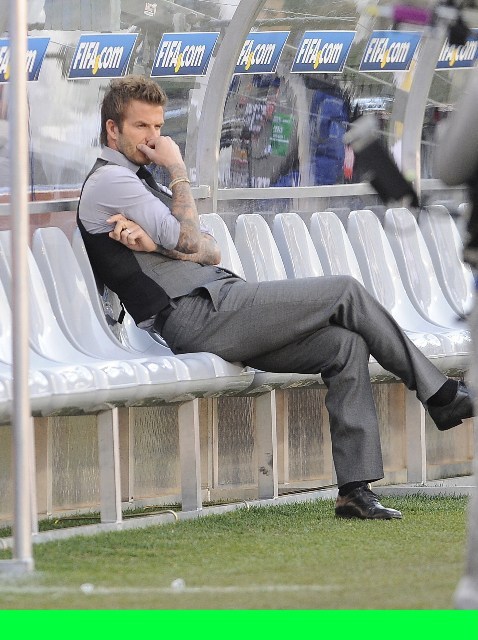 A helpless David Beckham watched on the sideline as his team was defeated by the Germans yesterday in South Africa. There was a disallowed goal that was so f-cking a goal. And that totally changed the dynamic of the game. And it made Becks so sad. He was so sad and so forlorn sitting there in his well tailored suit and his great hair and his hot hotness, of course I wanted to comfort him. You all wanted to comfort him. But no one else gets to comfort him. Because he will seek comfort against the bones of his wife.