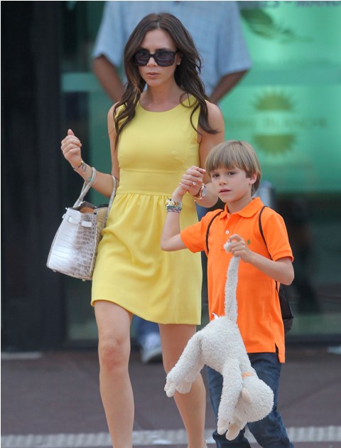 Victoria and the children are waiting for David in the South of France where they have a home. She arrived there the other day, announcing her presence in yellow, with a new weave. How cute is Romeo that he still needs his comfort toy? It’s been a long time since the boys have seen their father. A reunion is imminent. Good. I could use some Beckham Porn. And they could use some Beckham Porn to kill those dumbass rumours of a split.