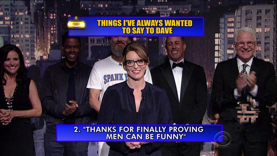 Last night marked the official end of The Late Show with David Letterman. After his final interview, his last broadcast was dedicated to best-of segments, tributes, thank yous, and one last Top 10, which lined up some of Letterman’s most frequent and favorite celebrity guests. He’s always been a champion of comedians—the way he said “Oh Andy” after a clip of Andy Kaufman is probably the greatest tribute to Kaufman you will ever hear—and when Tina Fey and Julia Louis-Dreyfus offer up the best one liners, Letterman’s delight is palpable.